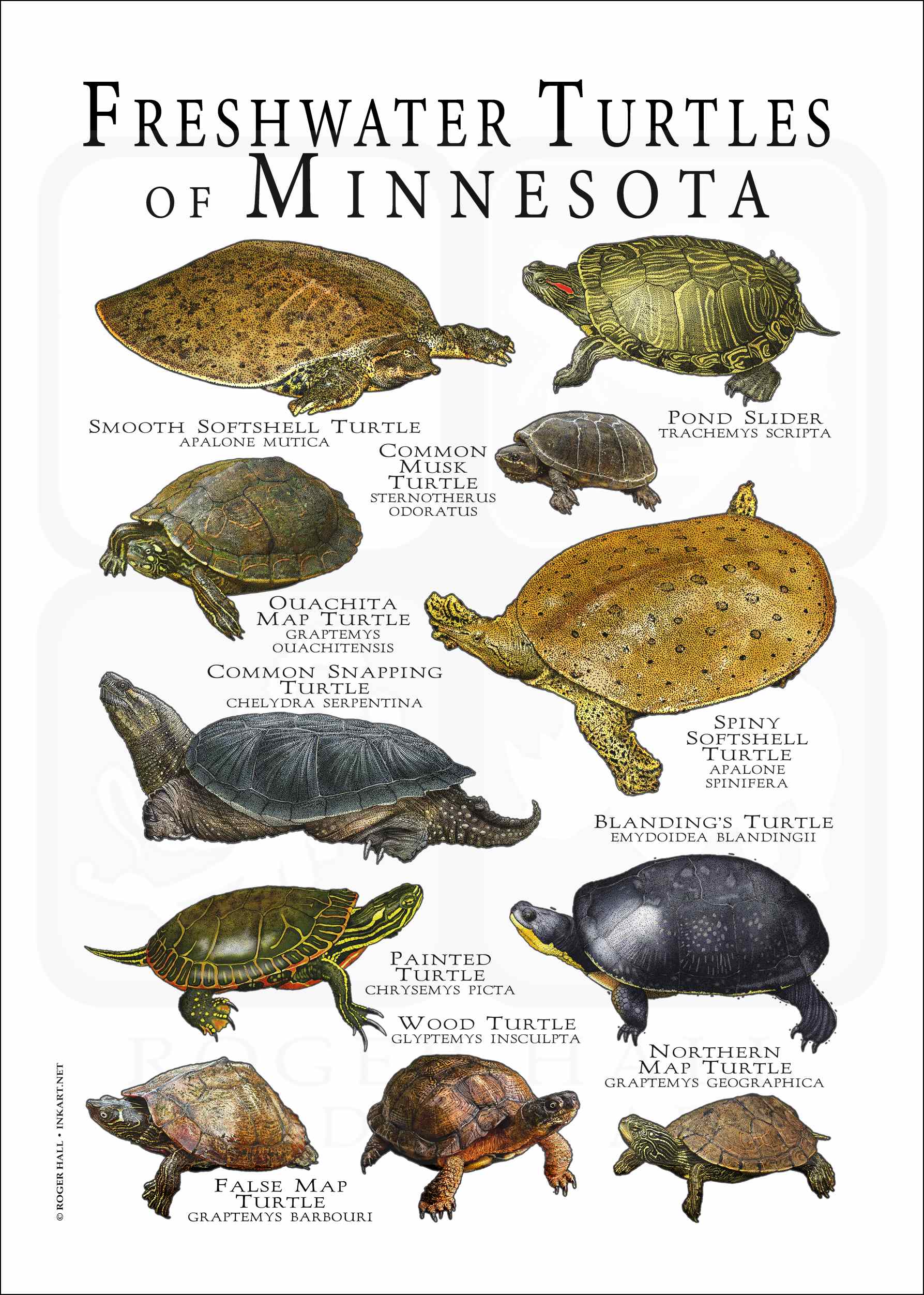 The state of Minnesota in the United States is home to several different species of freshwater turtle. This poster features fine art illustrations of the all the species native to the Minnesota .