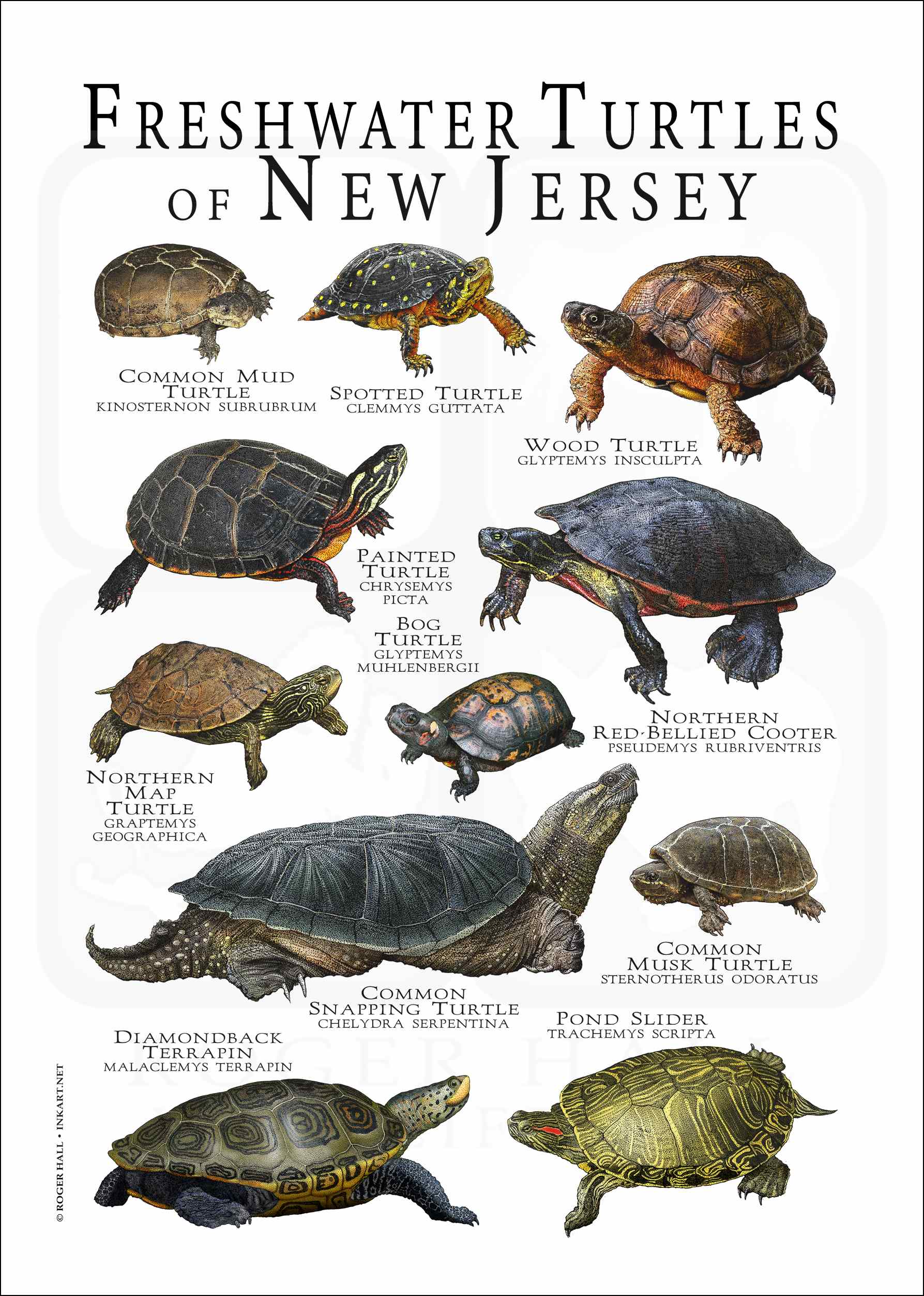 Fine art illustration of the all the freshwater turtles species native to New Jersey in the USA.