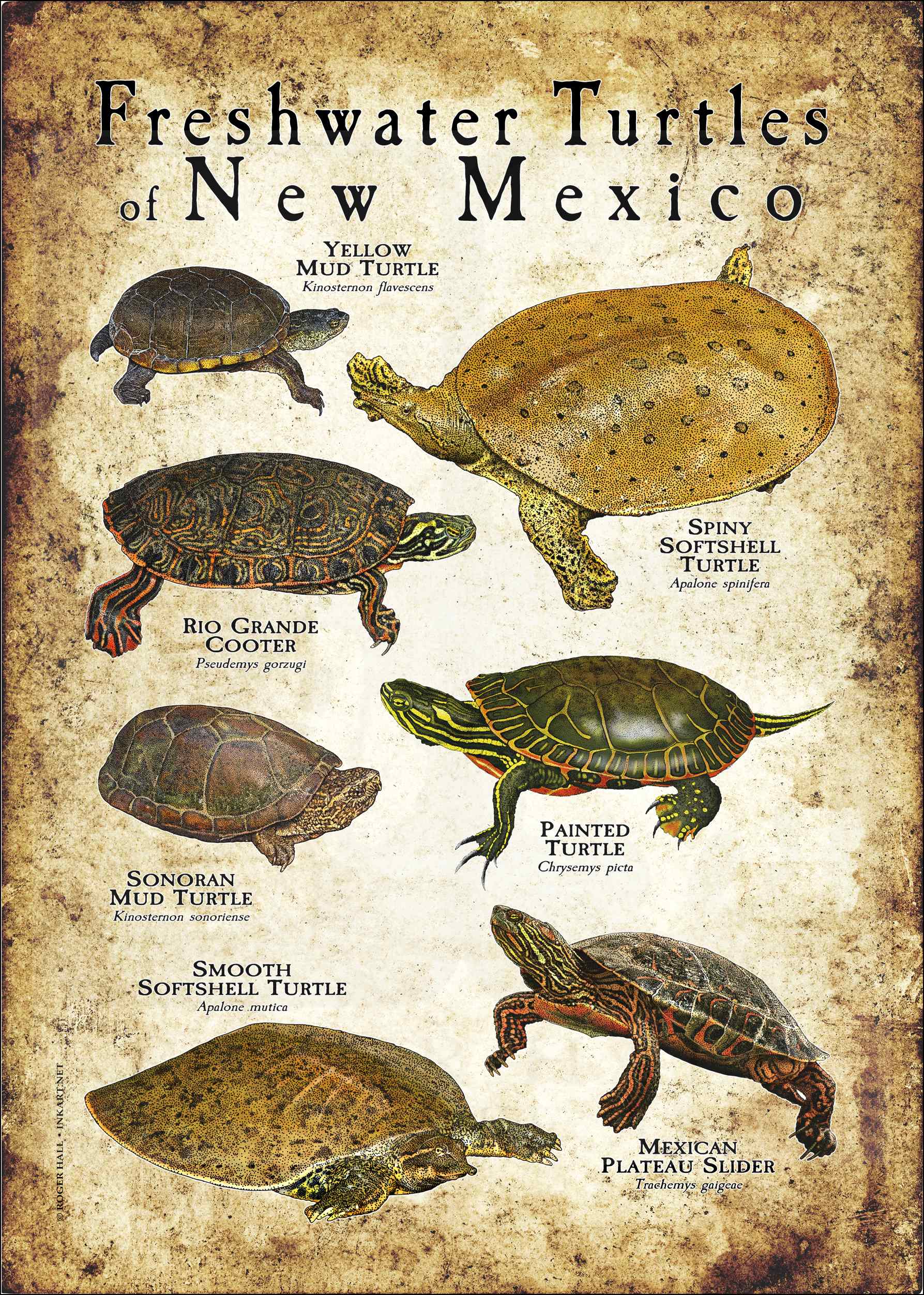 Fine art illustration of the all the freshwater turtles species native to New Mexico.