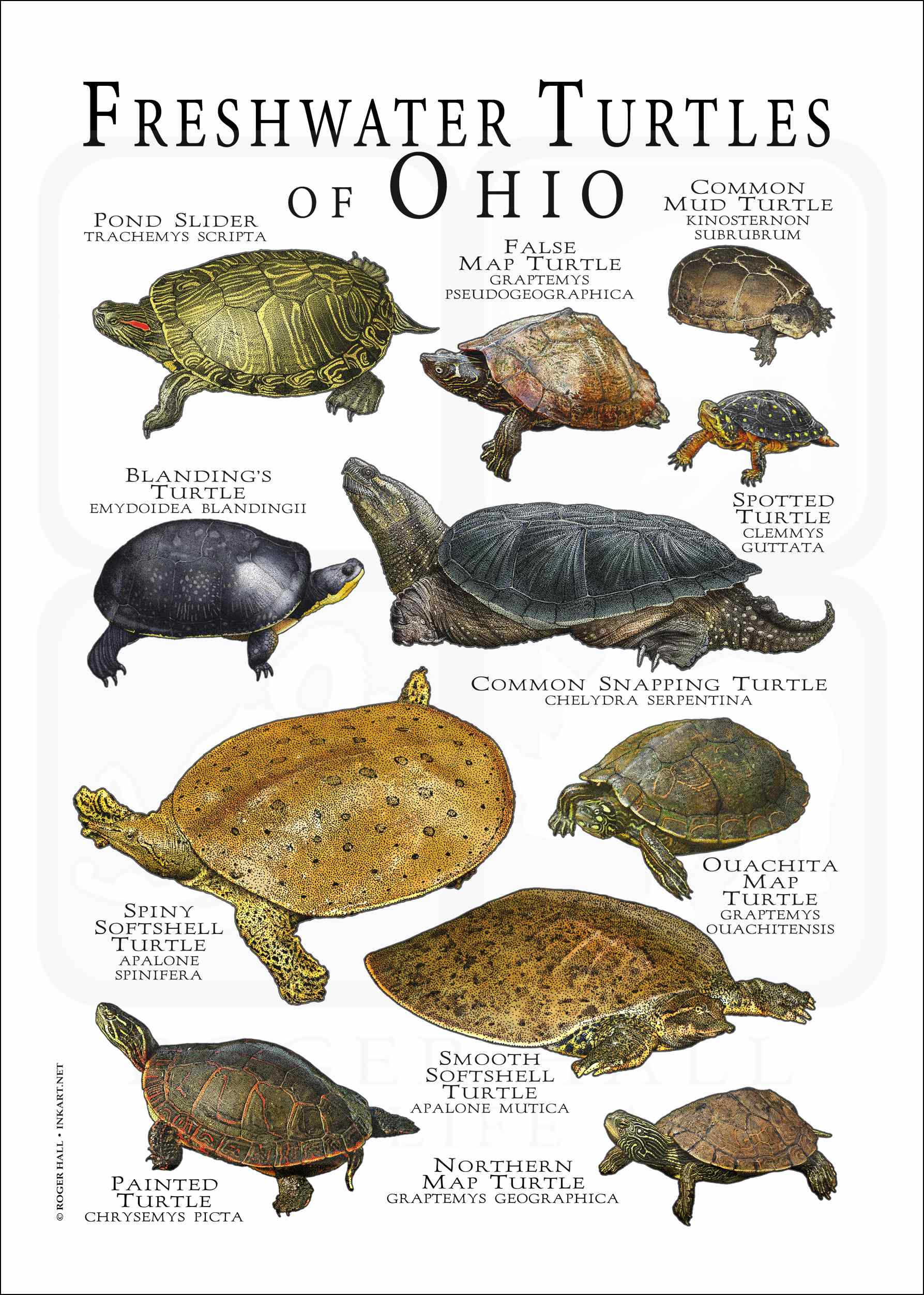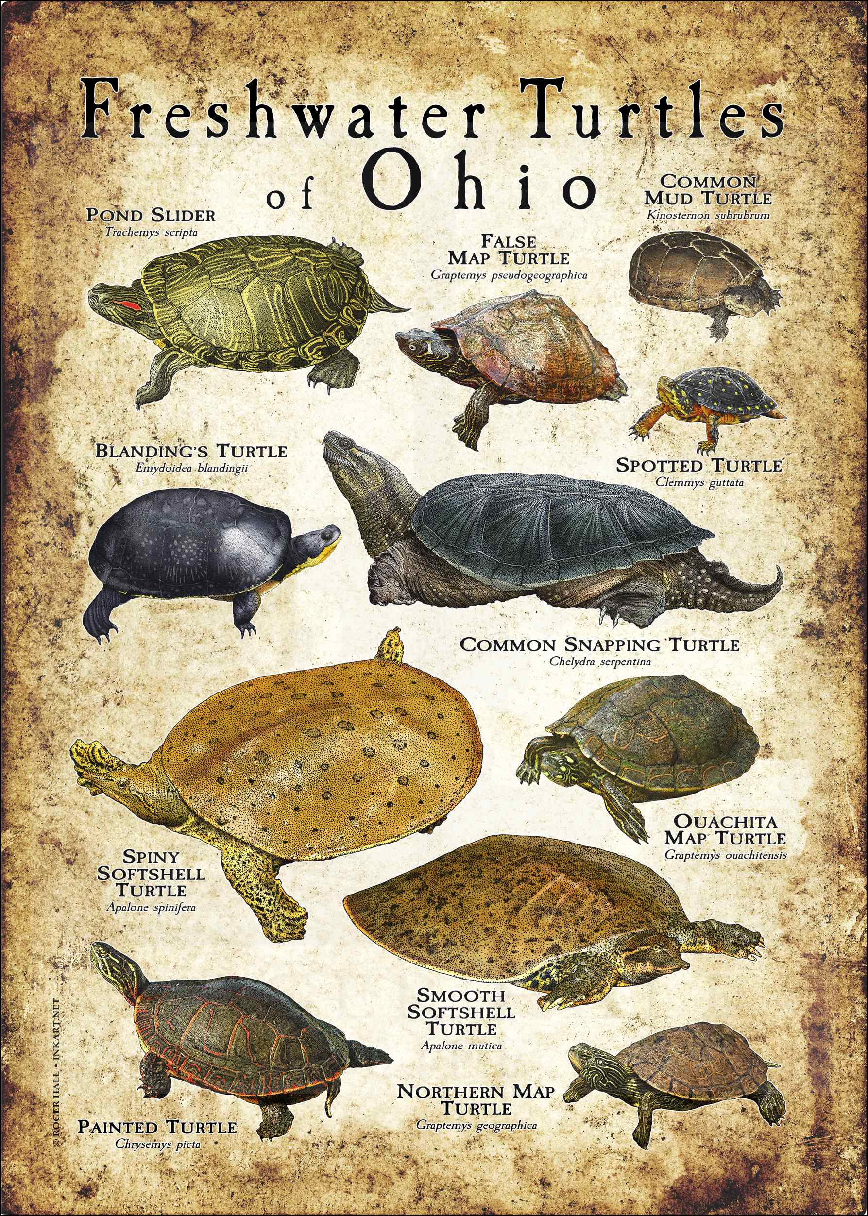 The state of Ohio in the United States is home to eleven different species of freshwater turtle. This poster features fine art illustrations of the all the species native to the Ohio.