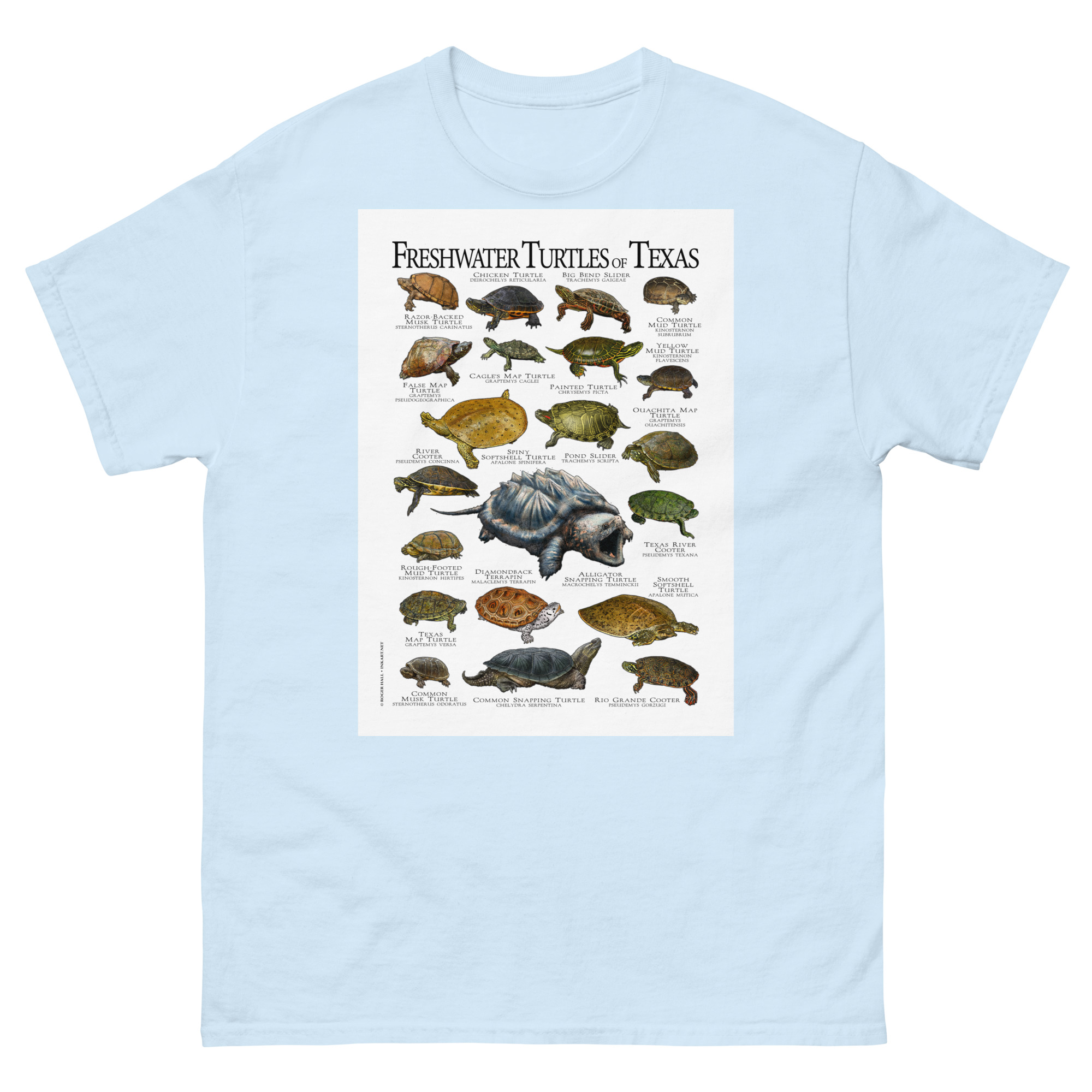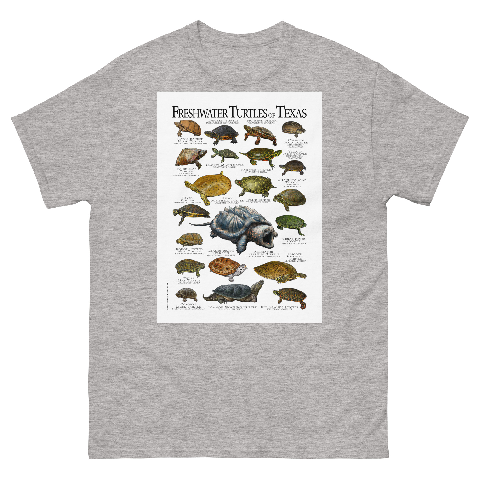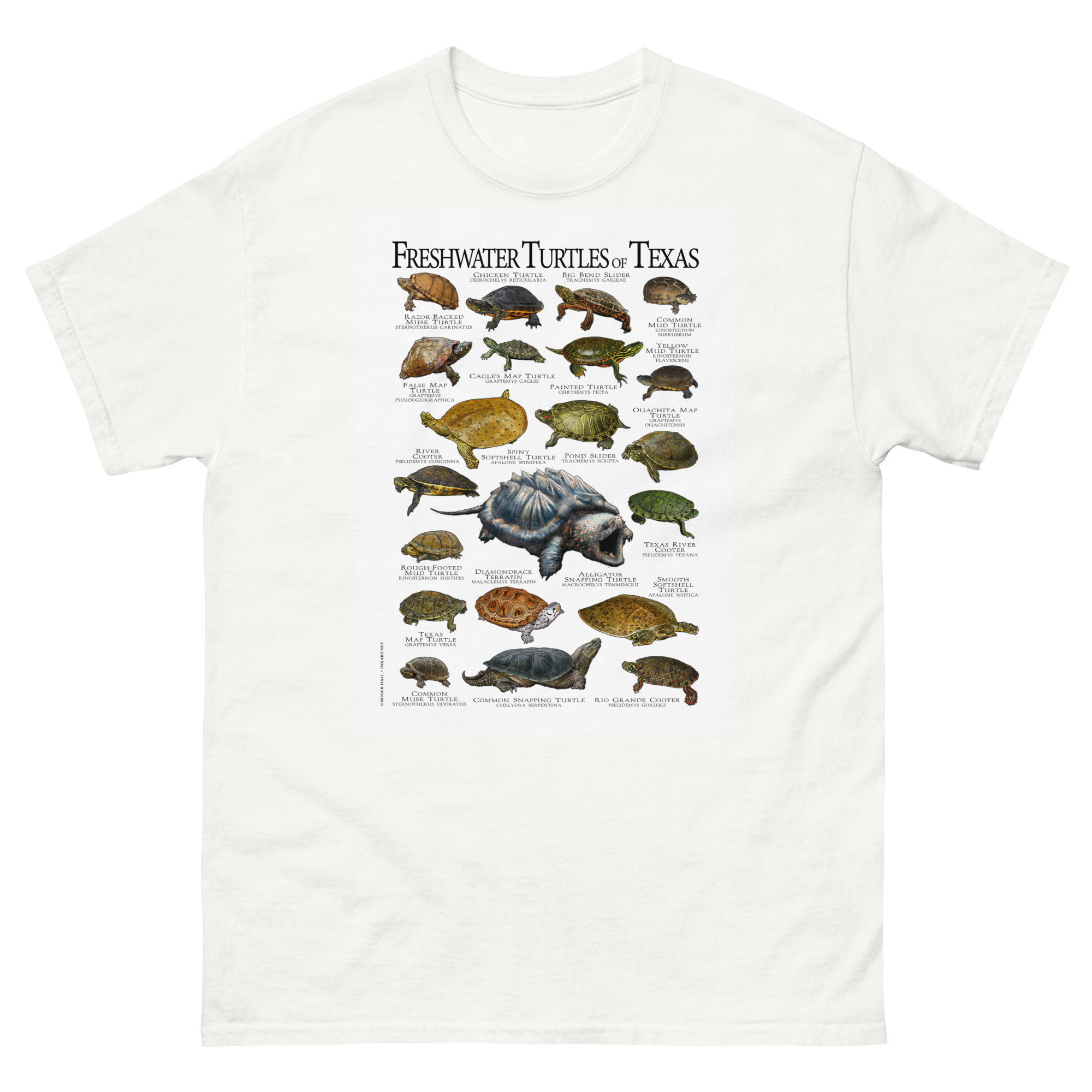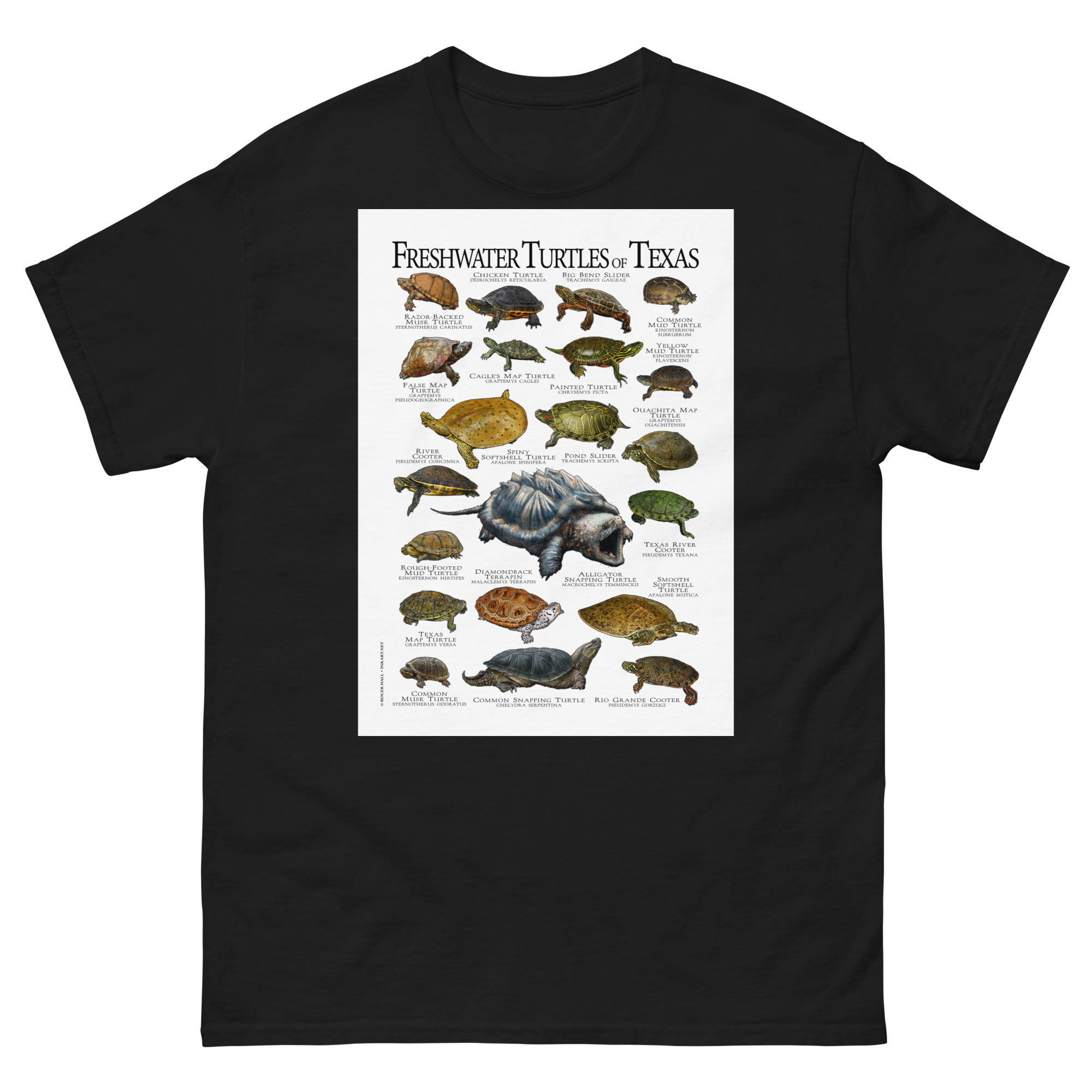 There are forty-nine species of turtles live in the United States and Canada, with the highest diversity in the Southeastern United States. This artwork features high-quality illustrations of the all freshwater turtles species native to the state of Texas, printed in a high-quality men’s cotton t-shirt.