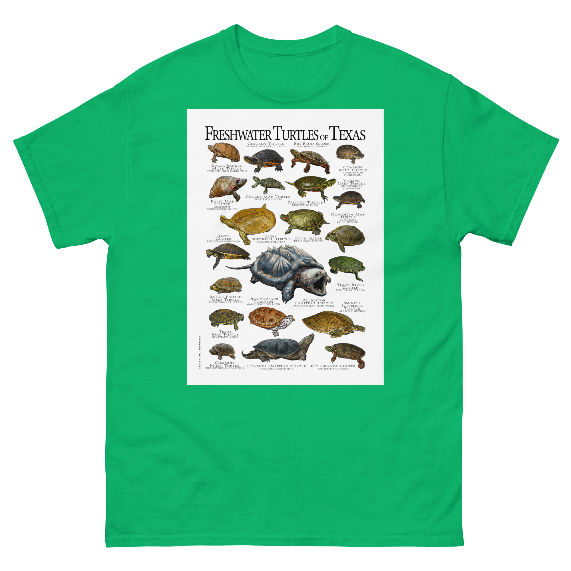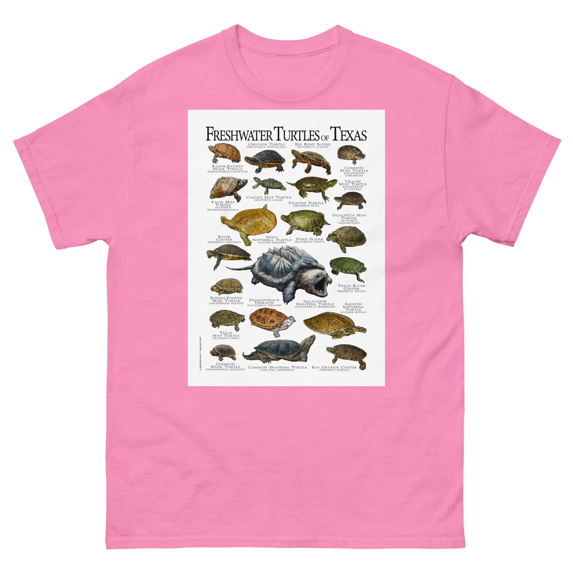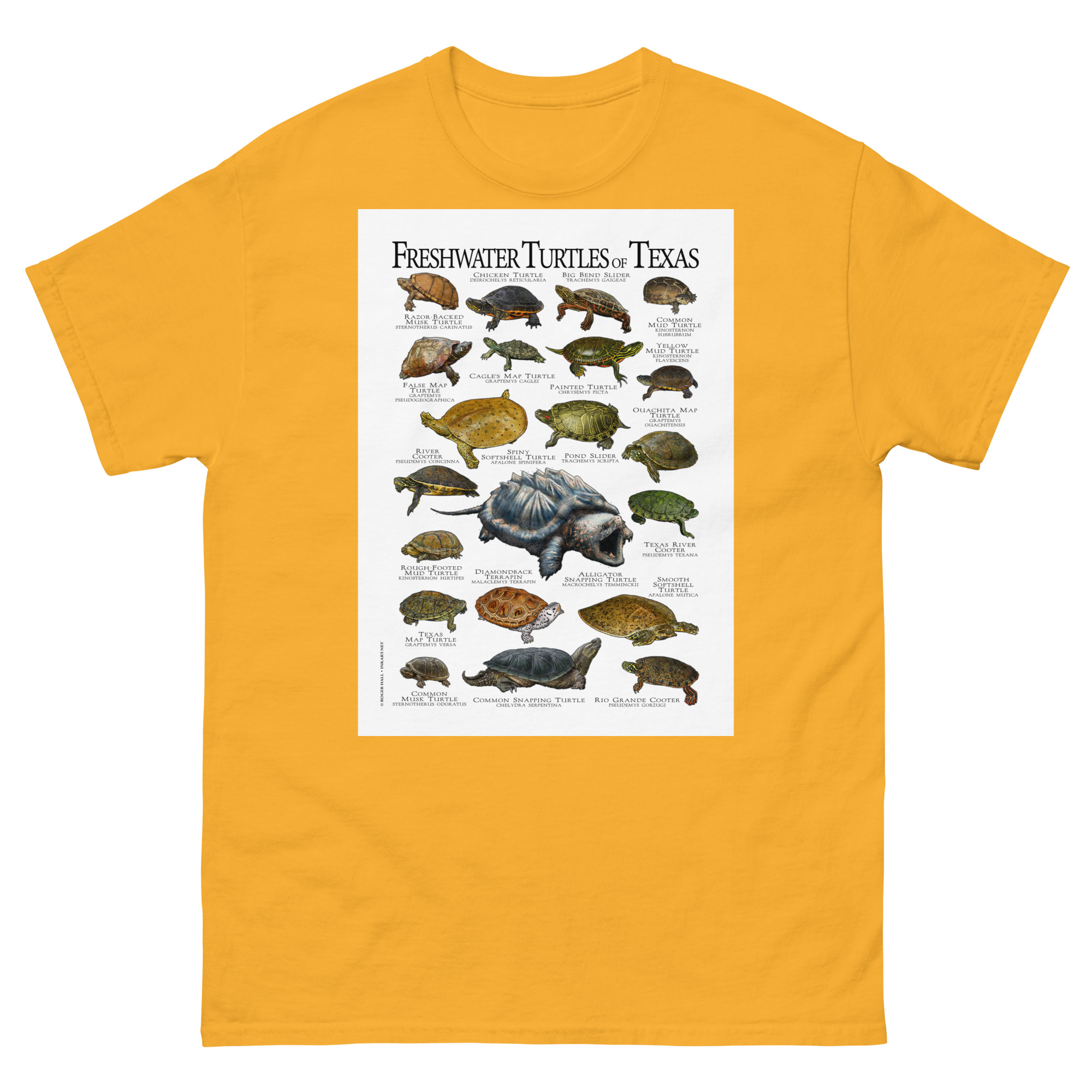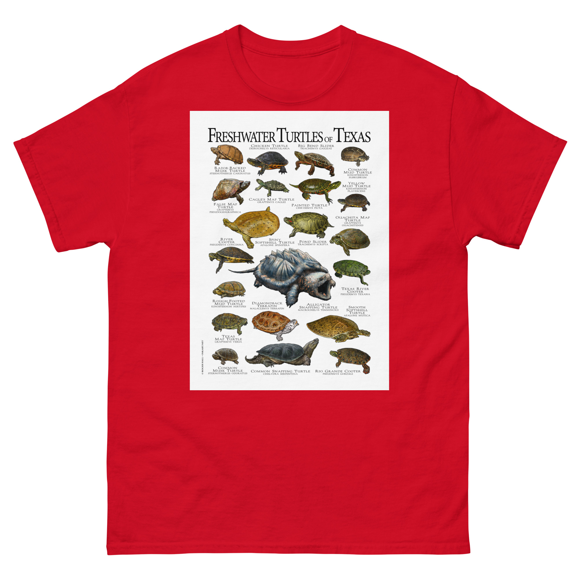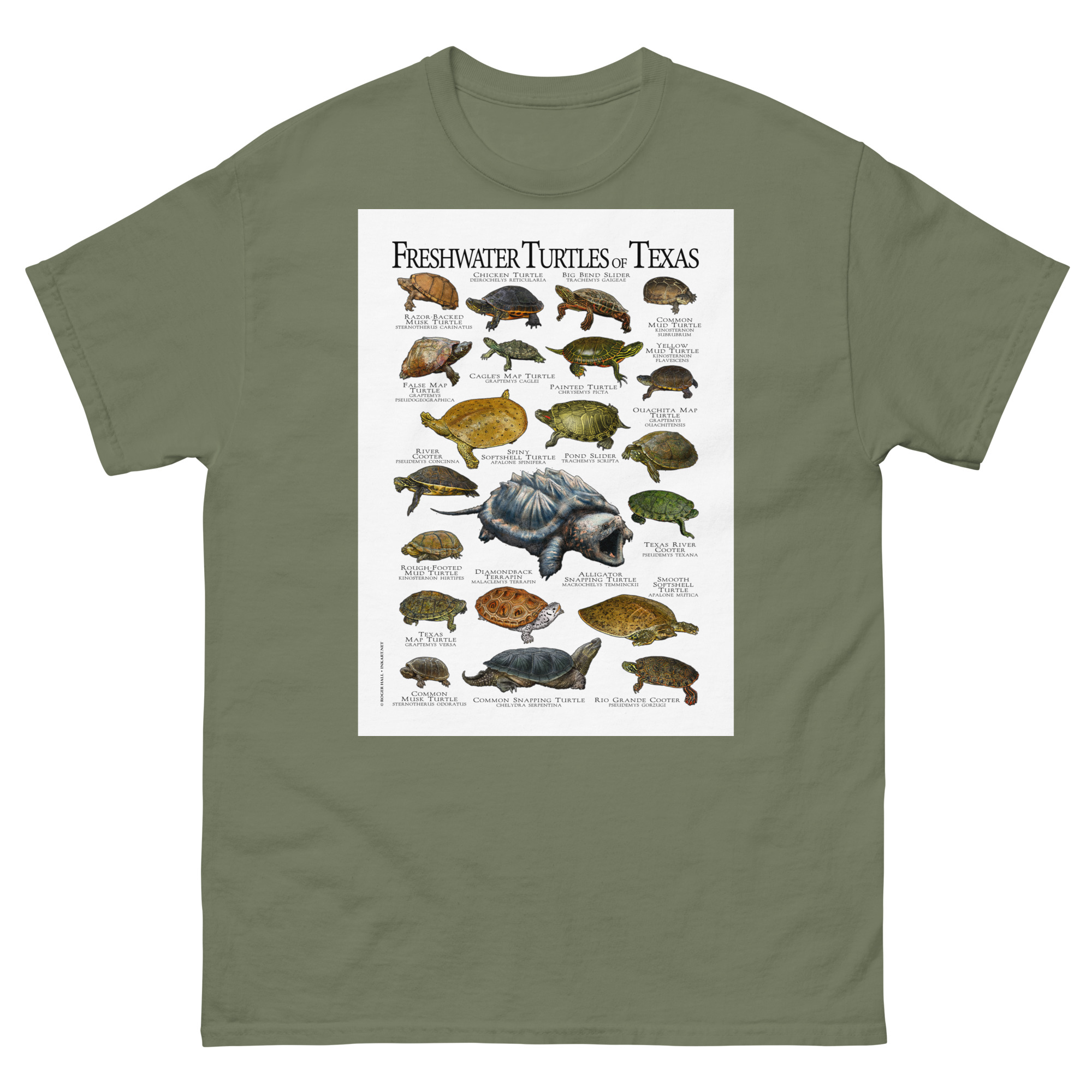There are forty-nine species of turtles live in the United States and Canada, with the highest diversity in the Southeastern United States. This artwork features high-quality illustrations of the all freshwater turtles species native to the state of Texas, printed in a high-quality men’s cotton t-shirt.