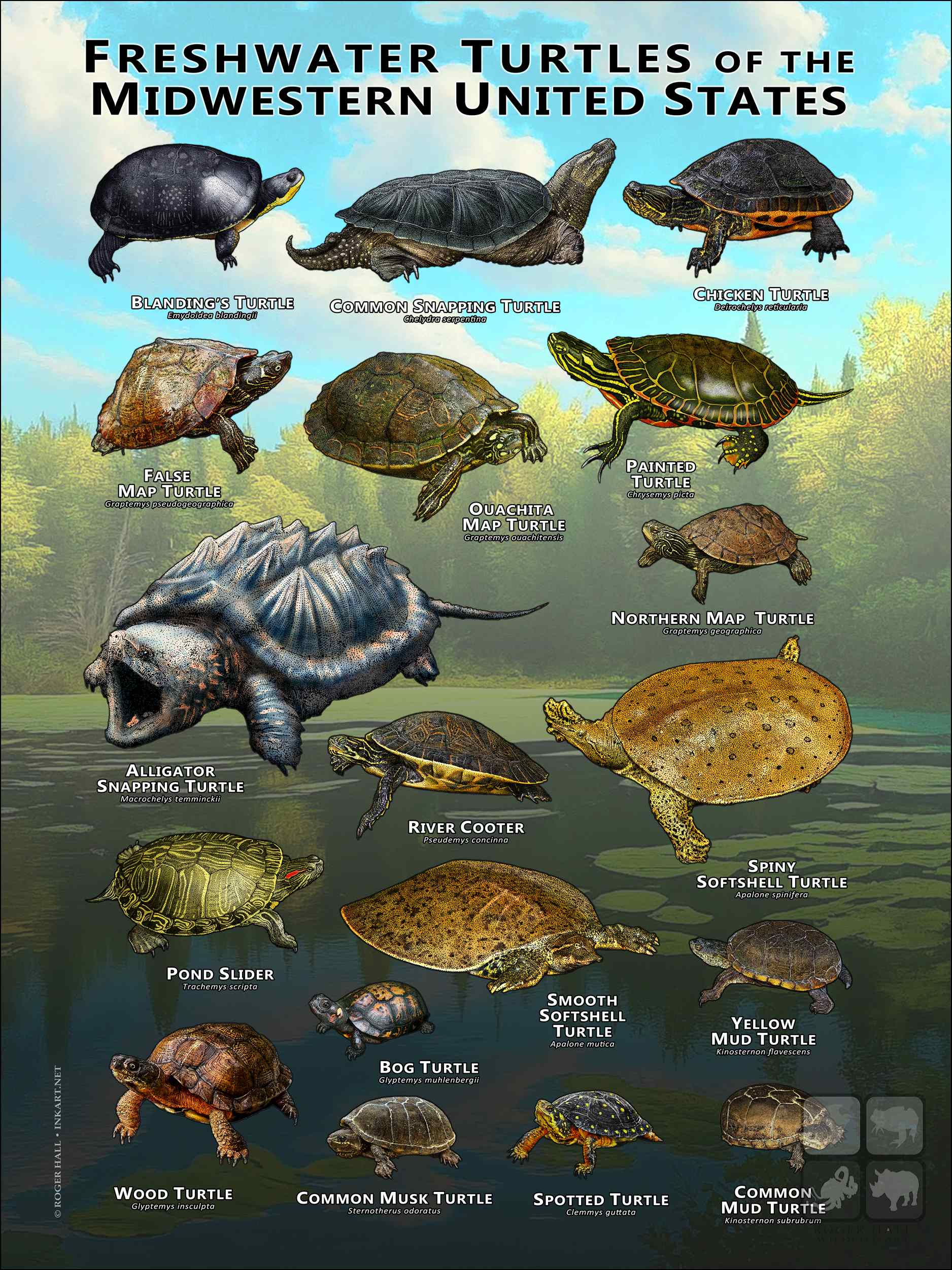 ALLIGATOR SNAPPING TURTLE (Macrochelys temminckii) • BLANDING’S TURTLE (Emydoidea blandingii) • CHICKEN TURTLE (Deirochelys reticularia) • COMMON MUD TURTLE (Kinosternon subrubrum) • COMMON MUSK TURTLE (Sternotherus odoratus) • COMMON SNAPPING TURTLE (Chelydra serpentina) • FALSE MAP TURTLE (Graptemys pseudogeographica) • NORTHERN MAP TURTLE (Graptemys geographica) • OUACHITA MAP TURTLE (Graptemys ouachitensis) • PAINTED TURTLE (Chrysemys picta) • POND SLIDER (Trachemys scripta) • SMOOTH SOFTSHELL TURTLE (Apalone mutica) • SPINY SOFTSHELL TURTLE (Apalone spinifera) • SPOTTED TURTLE (Clemmys guttata) • WOOD TURTLE (Glyptemys insculpta) • YELLOW MUD TURTLE (Kinosternon flavescens)