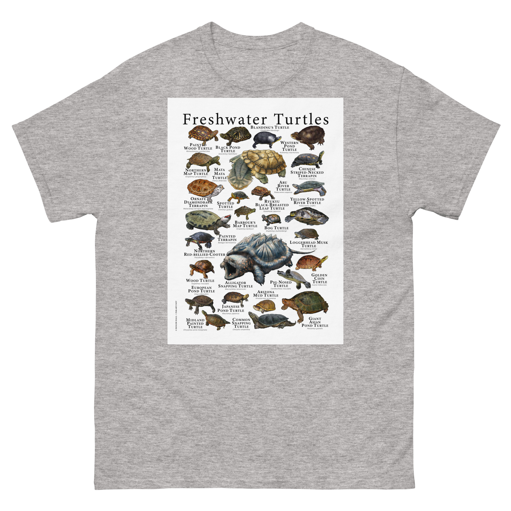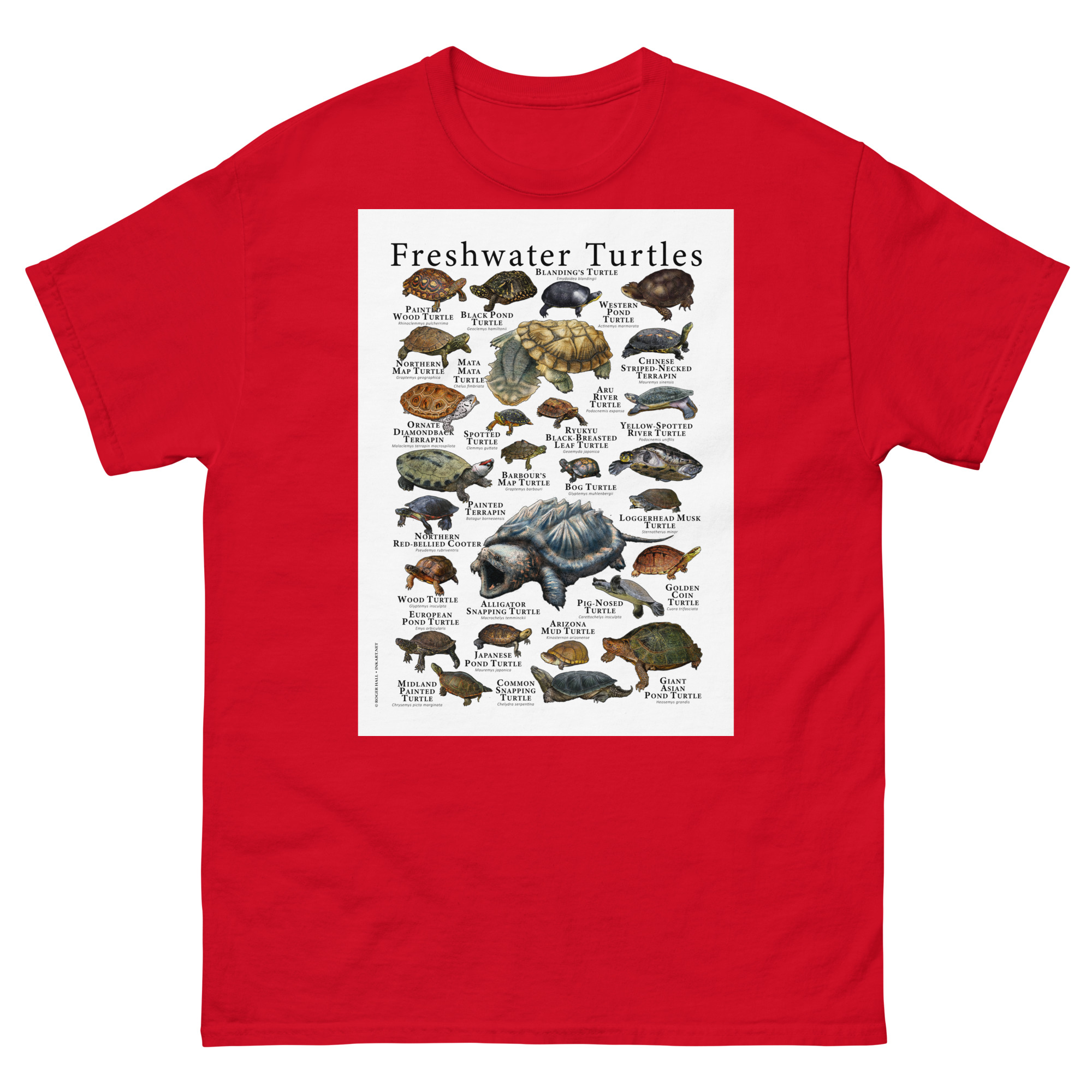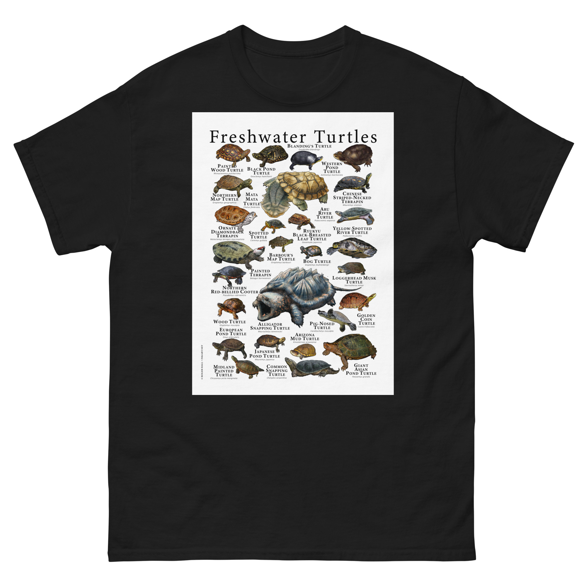 A colorful collage of scientifically accurate illustration of various species of freshwater turtle. The layout features over twenty different types of turtles, including some of the world’s most endangered species printed on a high-quality 100% men’s cotton t-shirt.
