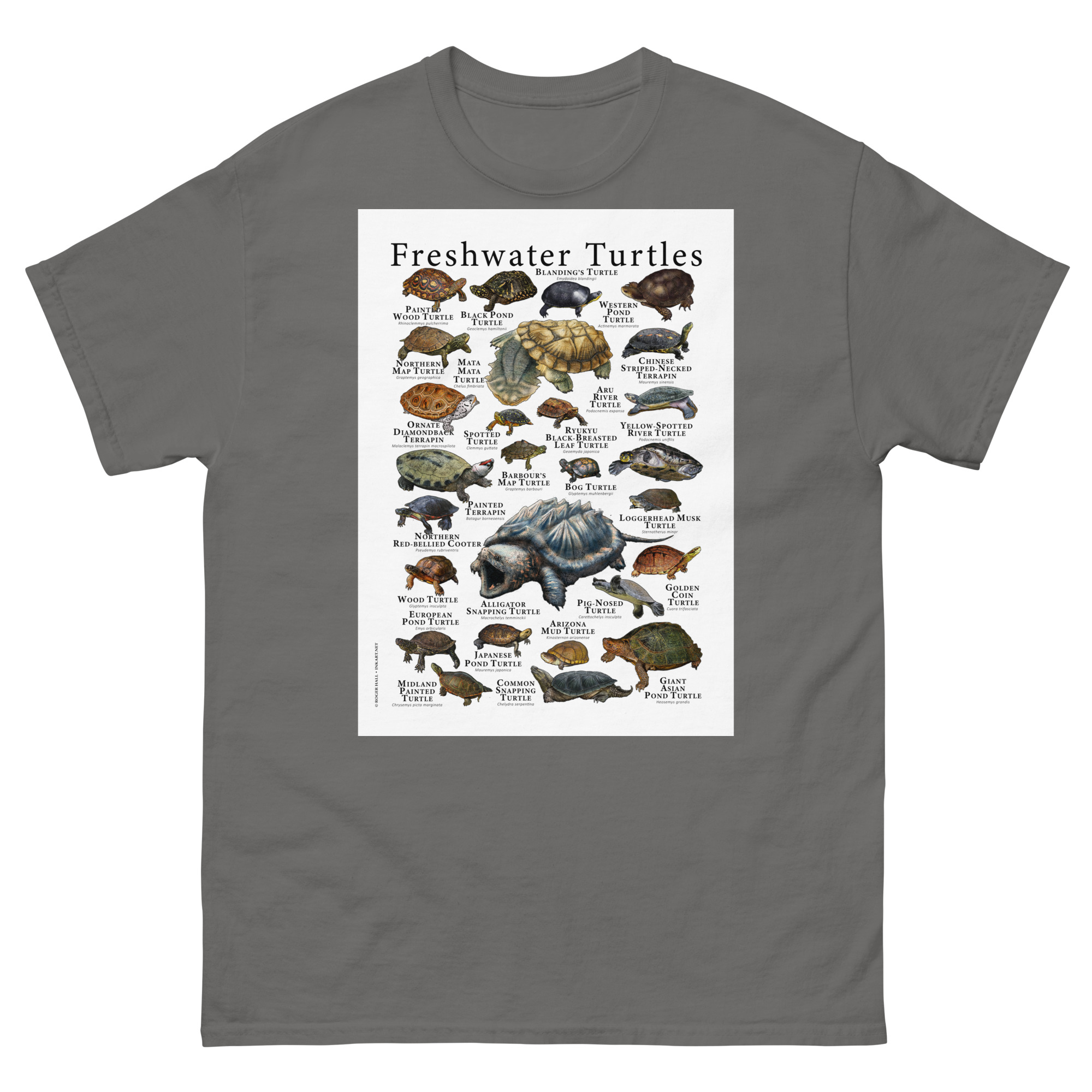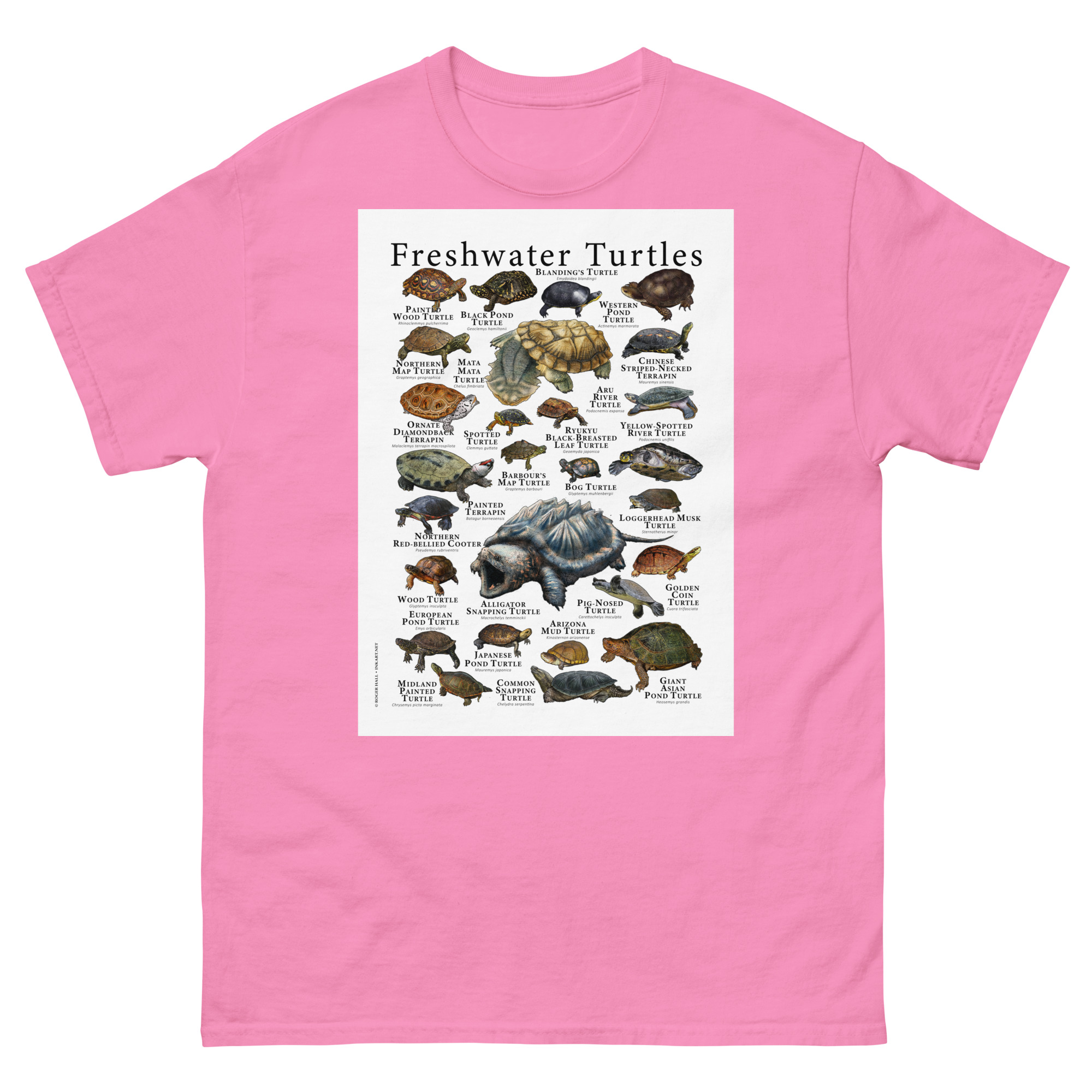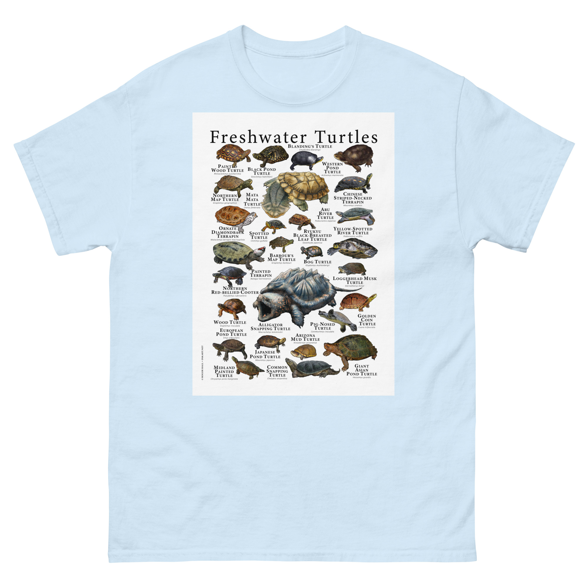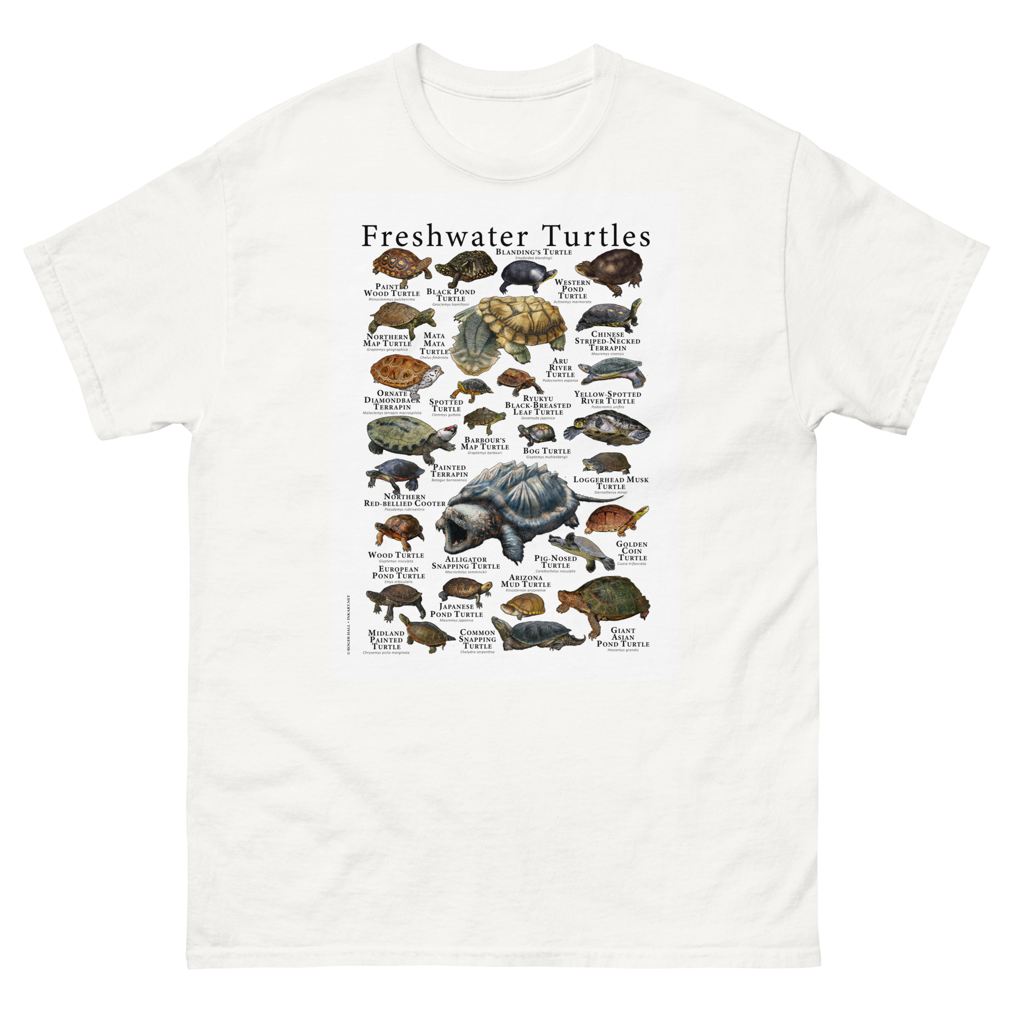 A colorful collage of scientifically accurate illustration of various species of freshwater turtle. The layout features over twenty different types of turtles, including some of the world’s most endangered species printed on a high-quality 100% men’s cotton t-shirt.
