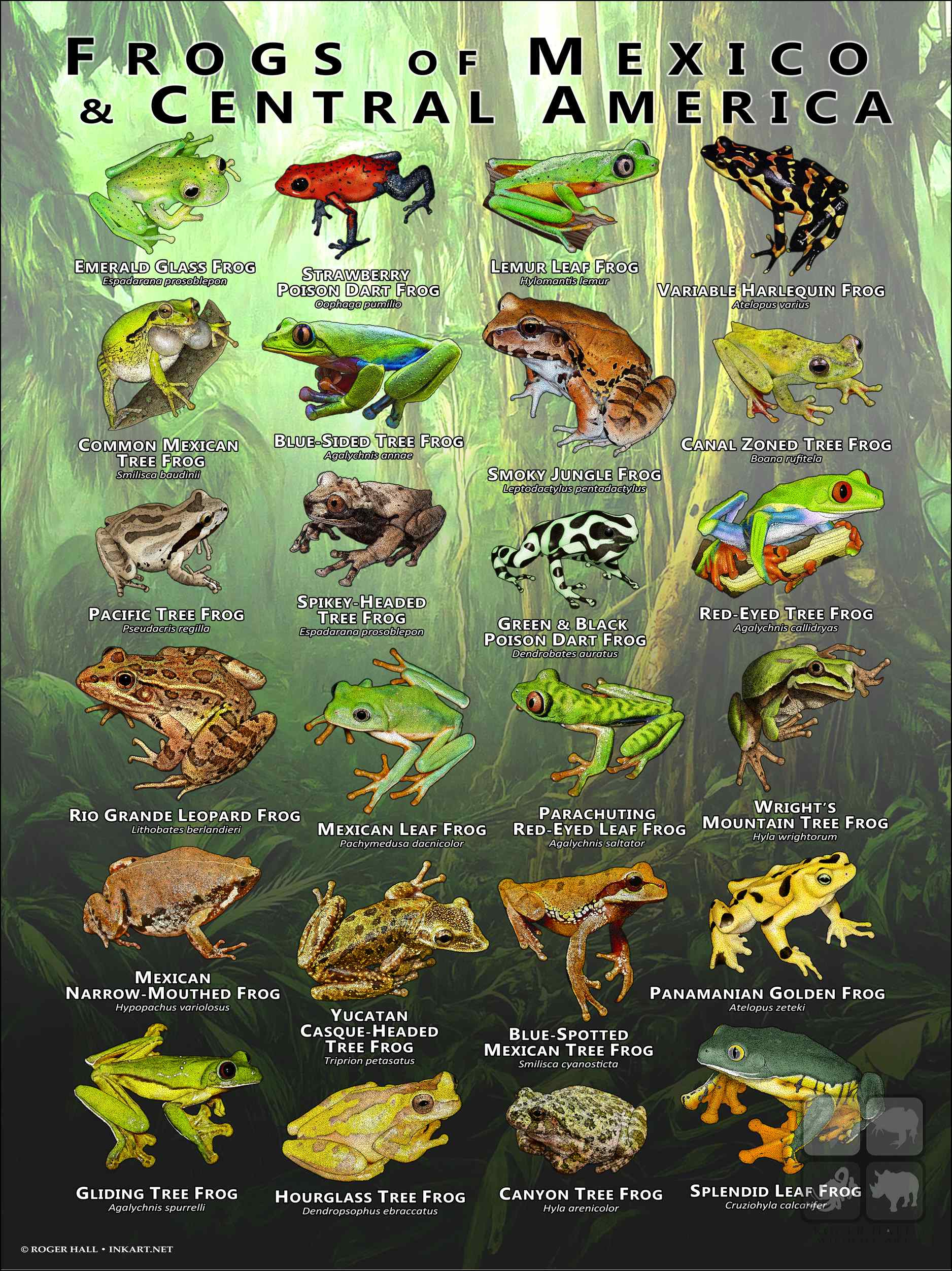 BLUE-SIDED TREE FROG (Agalychnis annae) • BLUE-SPOTTED MEXICAN TREE FROG (Smilisca cyanosticta) • CANAL ZONED TREE FROG (Boana rufitela) • CANYON TREE FROG (Hyla arenicolor) • COMMON MEXICAN TREE FROG (Smilisca baudinii) • EMERALD GLASS FROG (Espadarana prosoblepon) • GREEN & BLACK POISON DART FROG (Dendrobates auratus) • GLIDING TREEFROG (Agalychnis spurrelli) • HOURGLASS TREE FROG (Dendropsophus ebraccatus) • LEMUR LEAF FROG (Hylomantis lemur) • MEXICAN LEAF FROG (Pachymedusa dacnicolor) • MEXICAN NARROW-MOUTHED FROG (Hypopachus variolosus) • PACIFIC TREE FROG (Pseudacris regilla) • PANAMANIAN GOLDEN FROG (Atelopus zeteki) • PARACHUTING RED-EYED LEAF FROG (Agalychnis saltator) • RED-EYED TREE FROG (Agalychnis callidryas) • RIO GRANDE LEOPARD FROG (Lithobates berlandieri) • SMOKY JUNGLE FROG (Leptodactylus pentadactylus) • SPIKEY-HEADED TREE FROG (Espadarana prosoblepon) • SPLENDID LEAF FROG (Cruziohyla calcarifer) • STRAWBERRY POISON DART FROG (Oophaga pumilio) • VARIABLE HARLEQUIN FROG (Atelopus varius) • WRIGHT’S MOUNTAIN TREE FROG (Hyla wrightorum) • YUCATAN CASQUE-HEADED TREE FROG (Triprion petasatus)