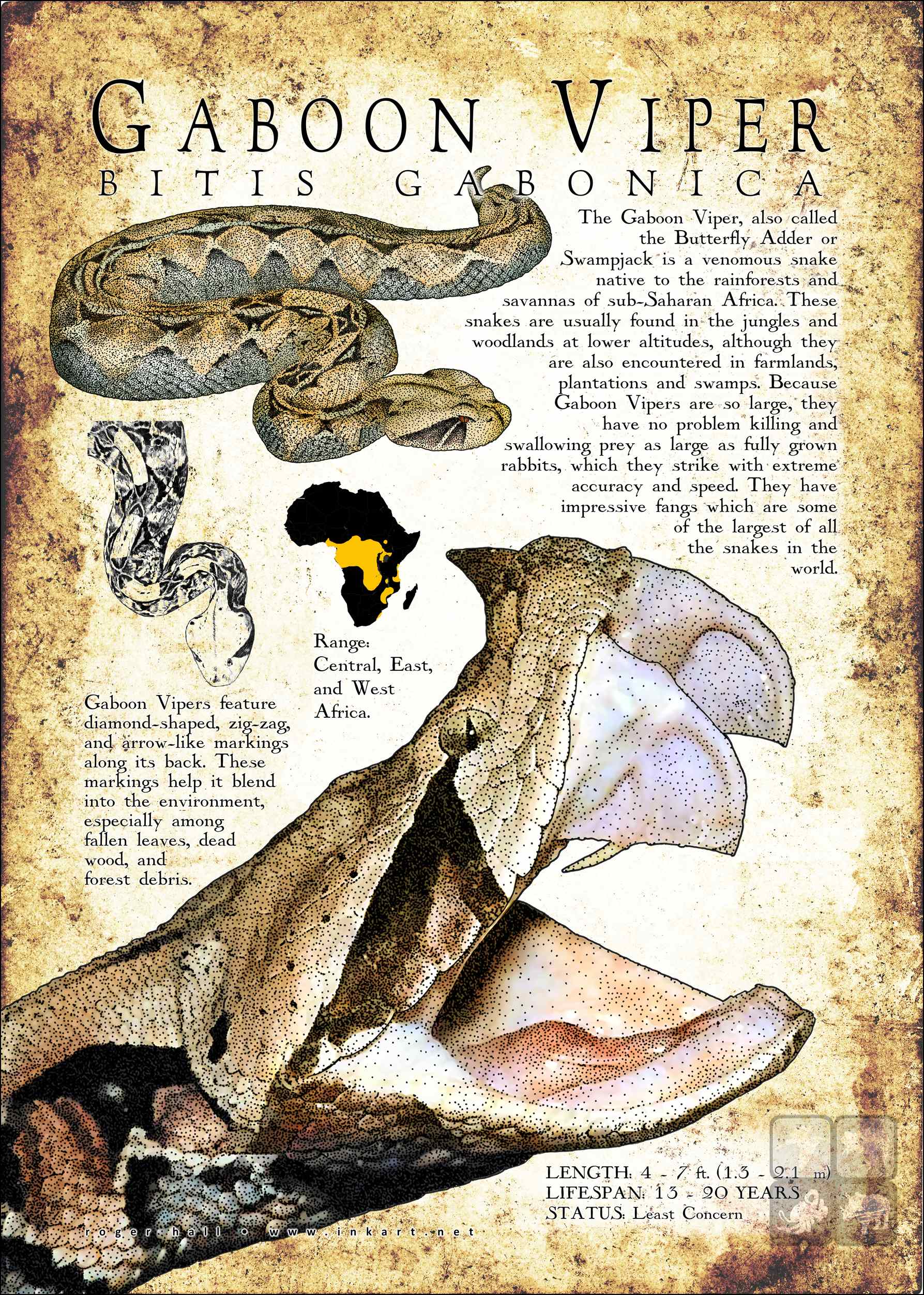 This poster features an informational graphic of the Gaboon Viper It includes a map of the snake’s range, along with three illustrations and a small paragraph with information about reptile.