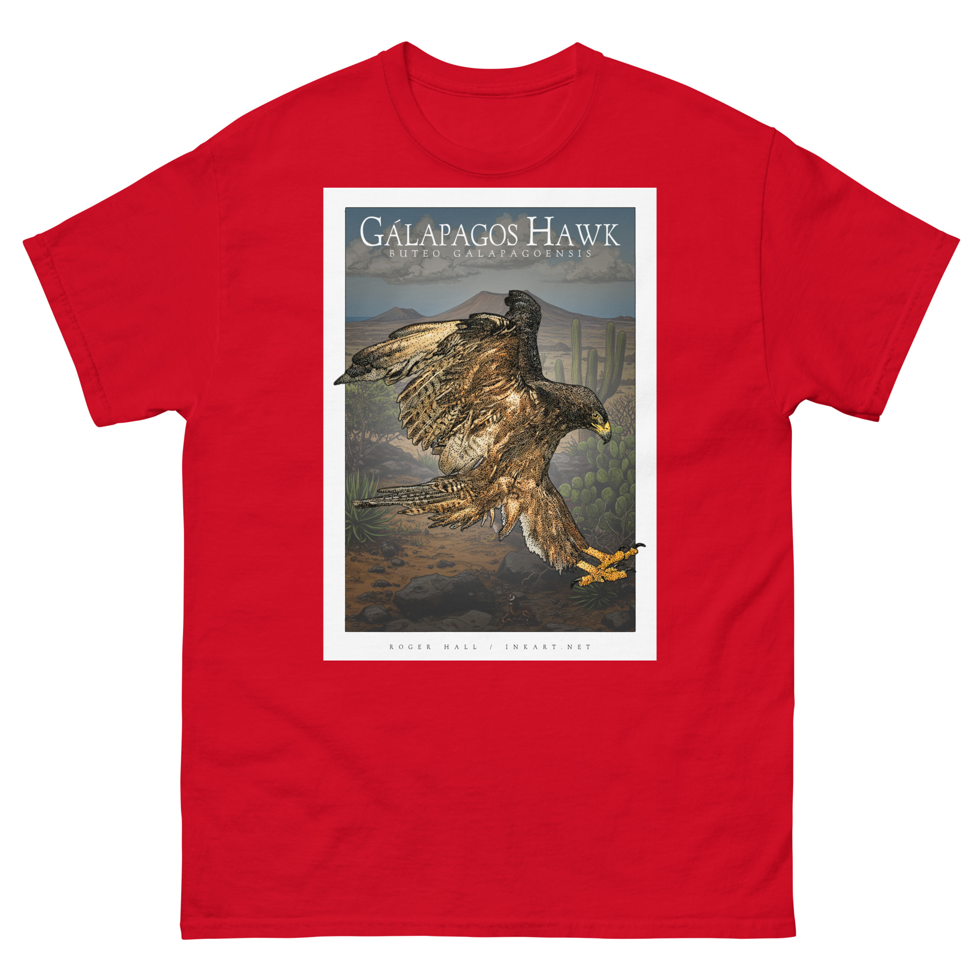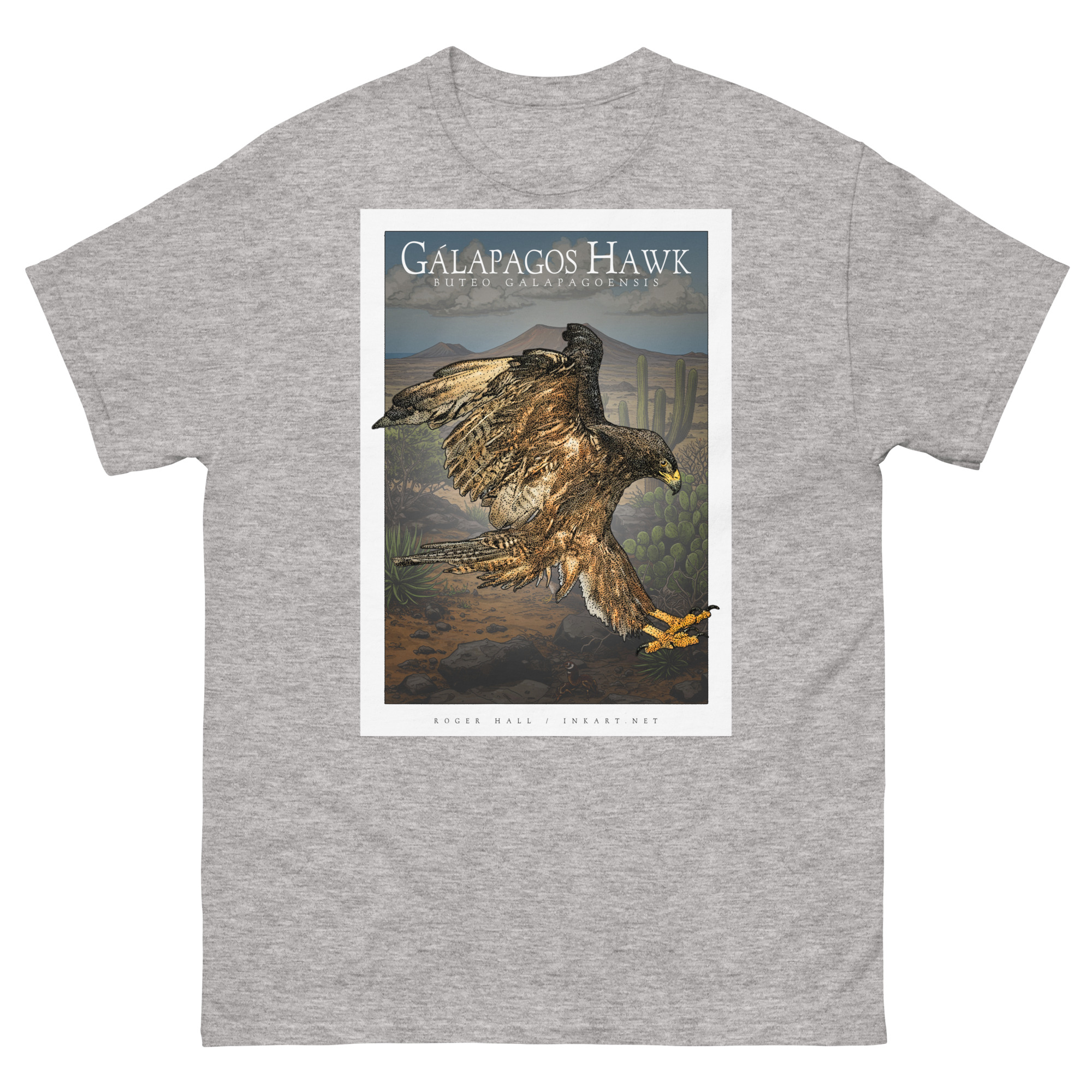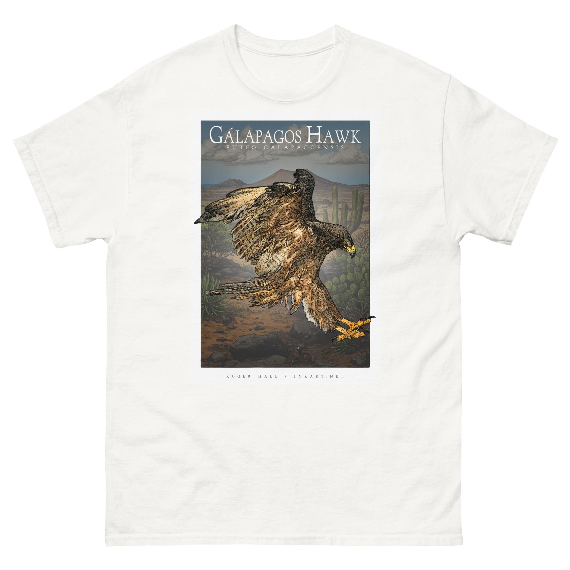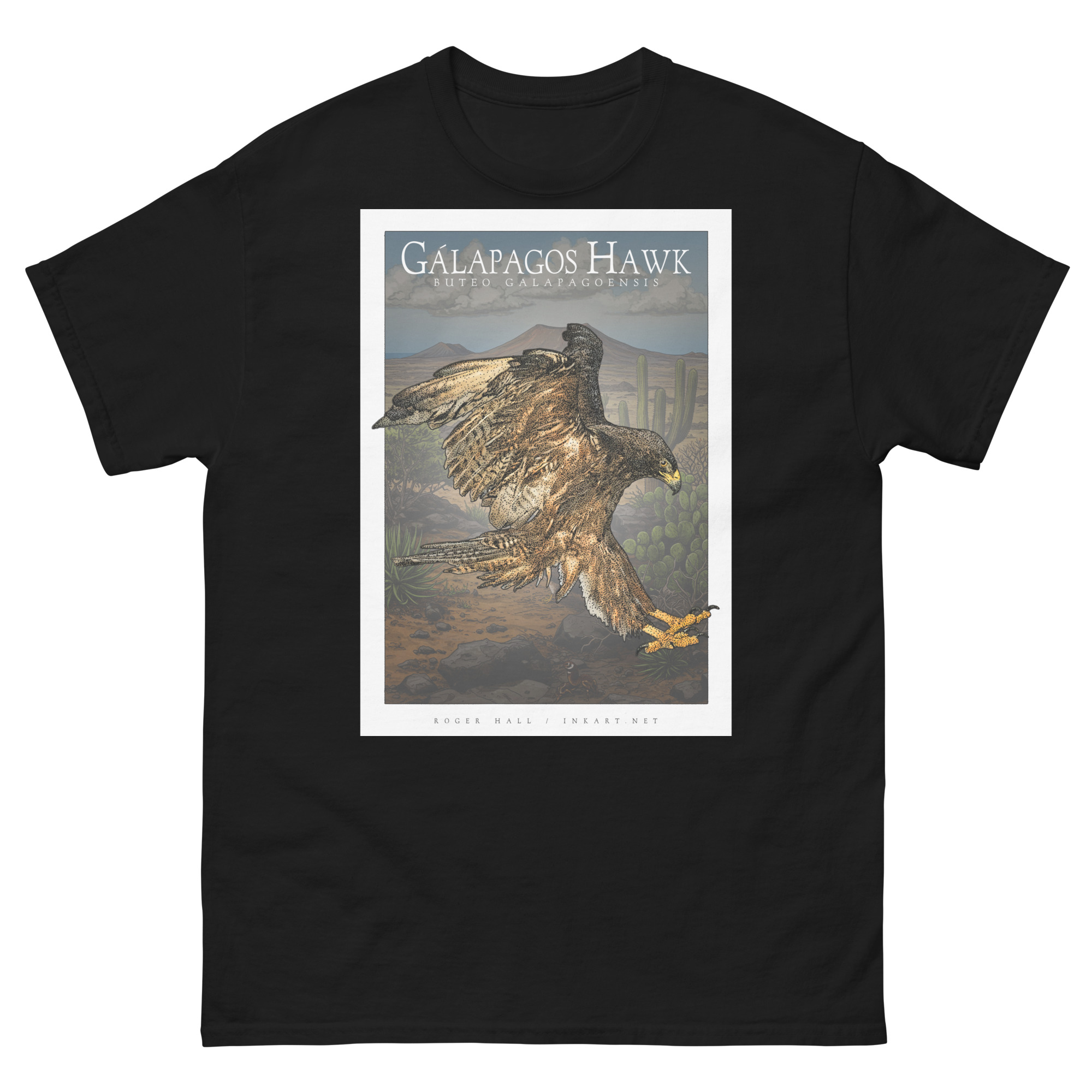 Scientifically accurate drawing of a Galapagos Hawk (Buteo galapagoensis.) The illustration of a printed on a high-quality 100% unisex cotton t-shirt.