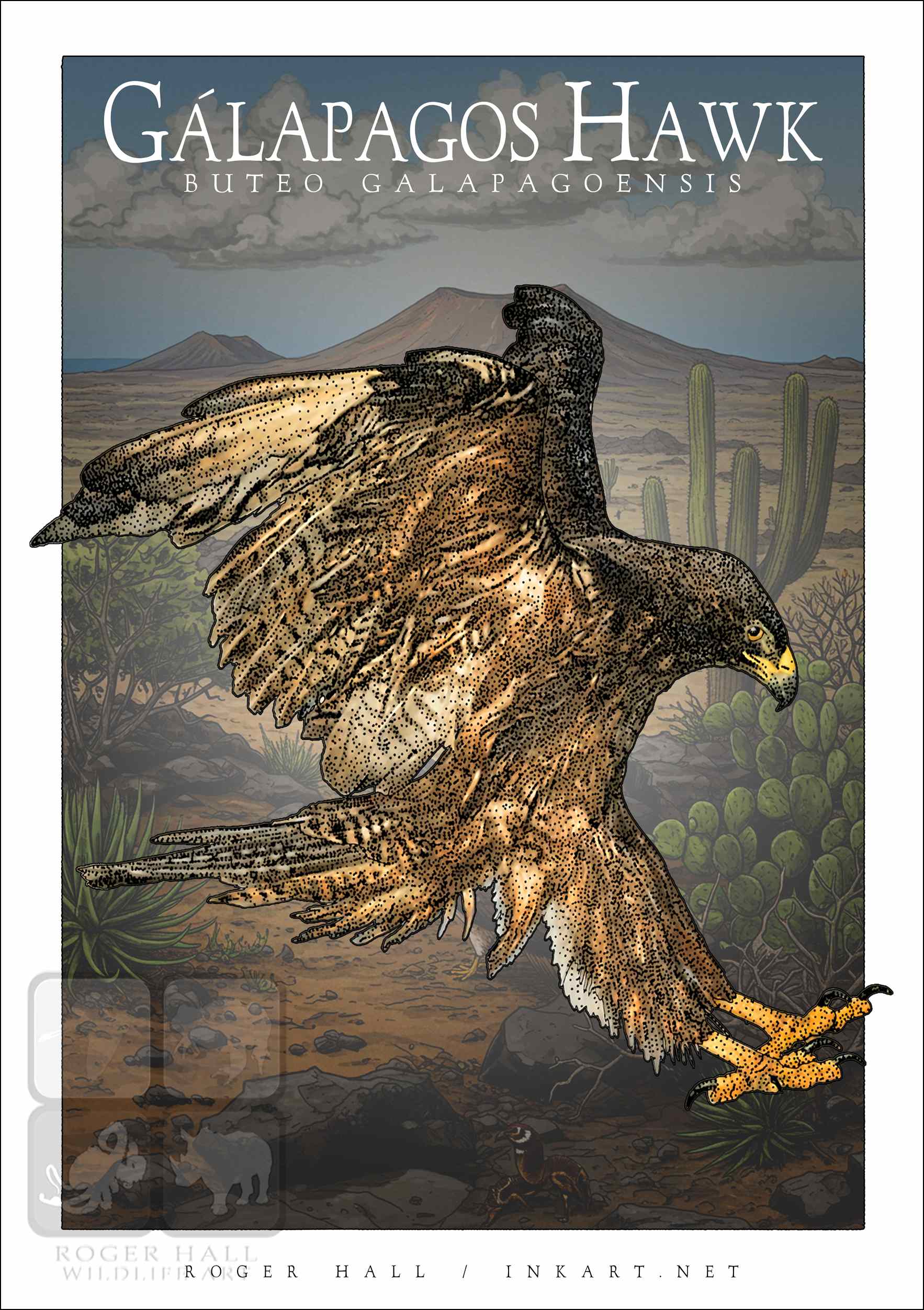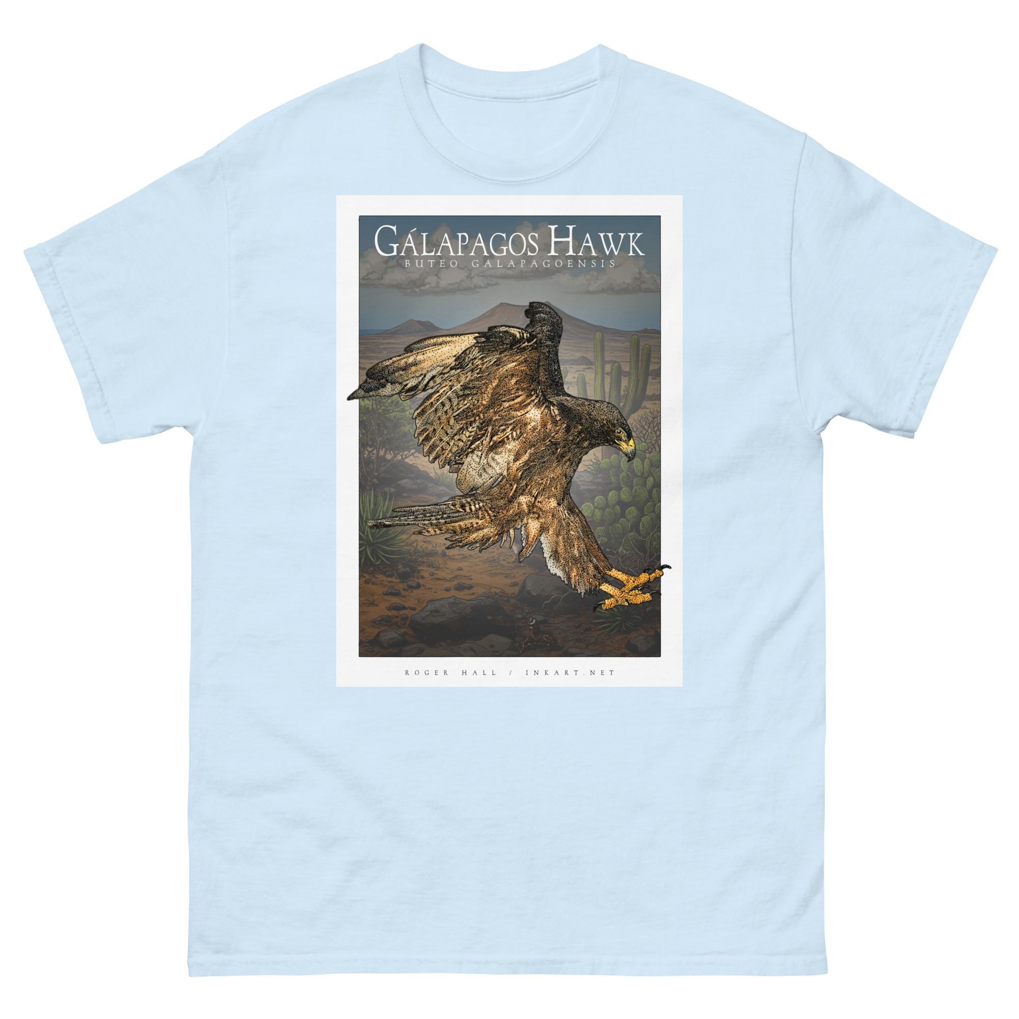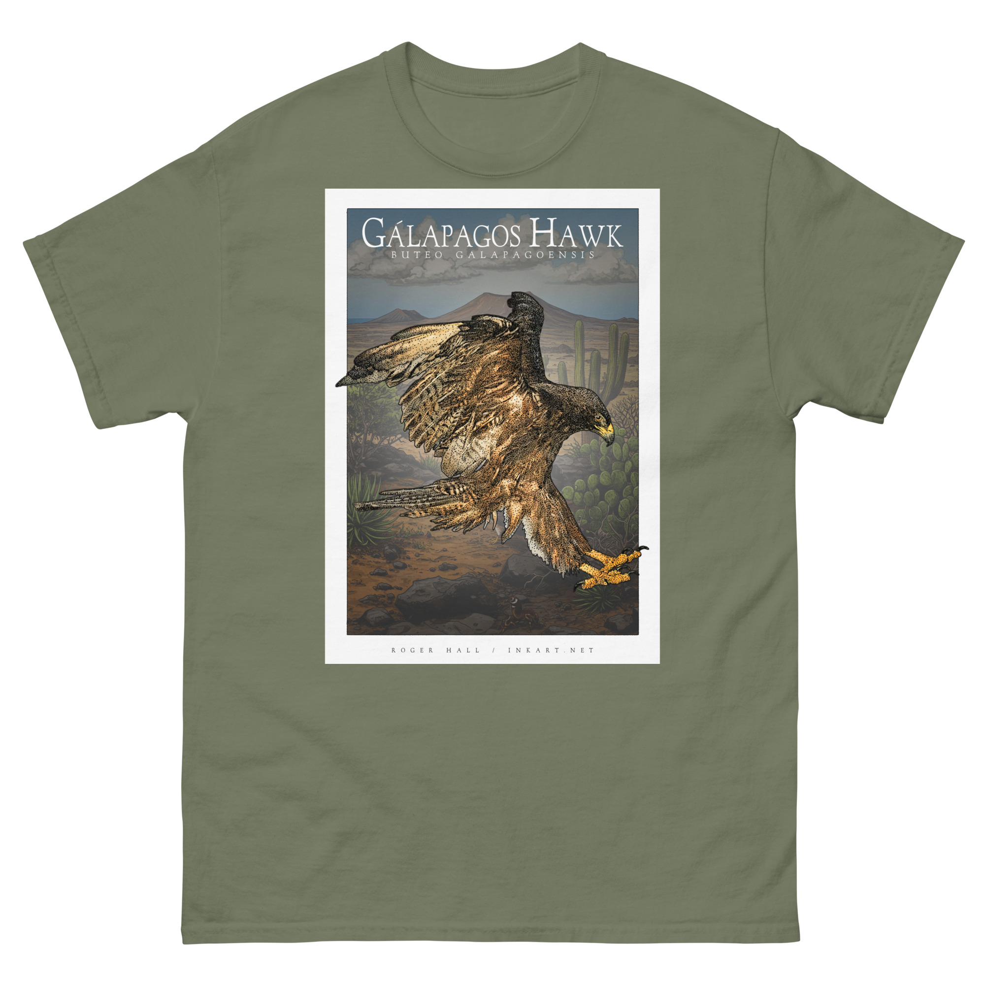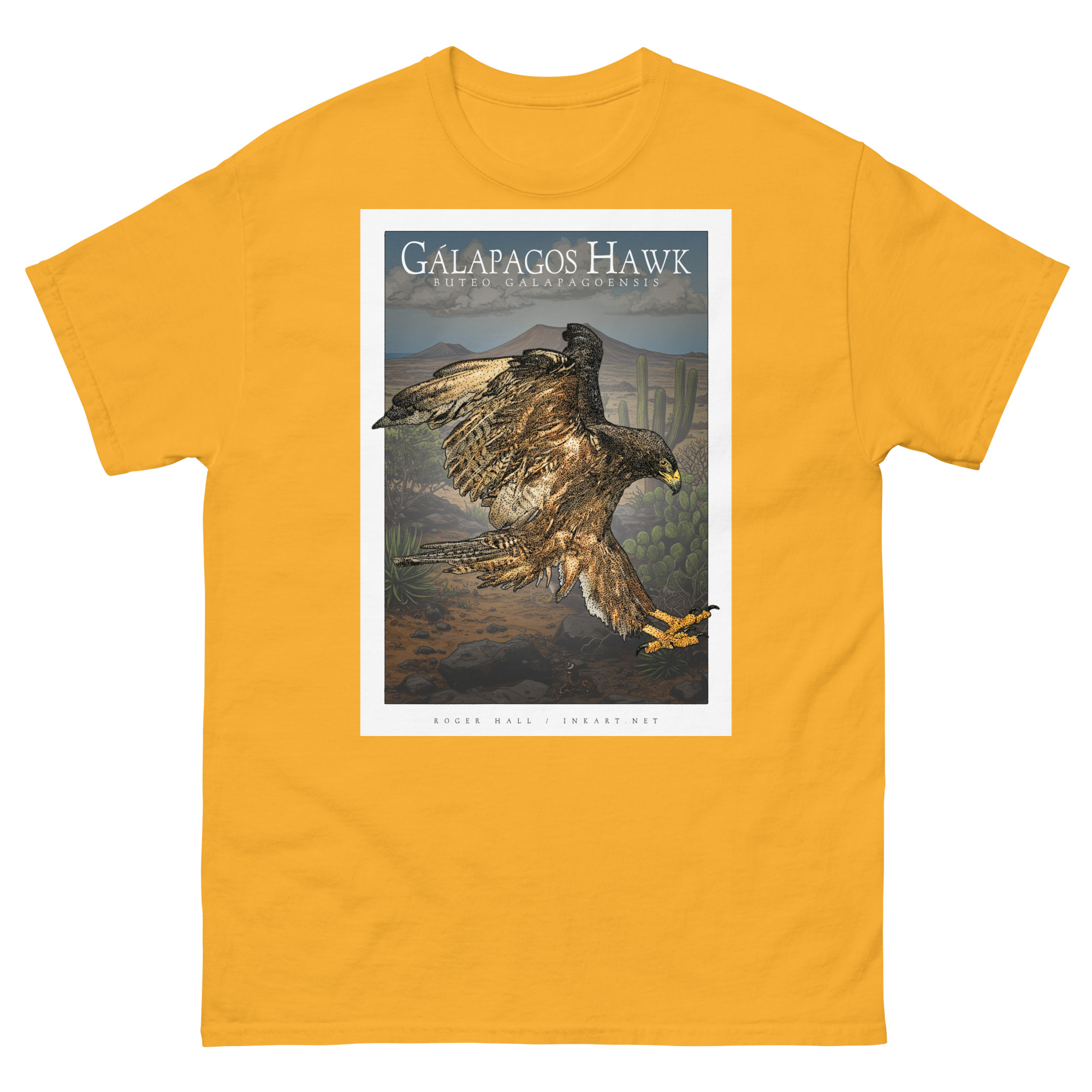 Scientifically accurate drawing of a Galapagos Hawk (Buteo galapagoensis.) The illustration of a printed on a high-quality 100% unisex cotton t-shirt.