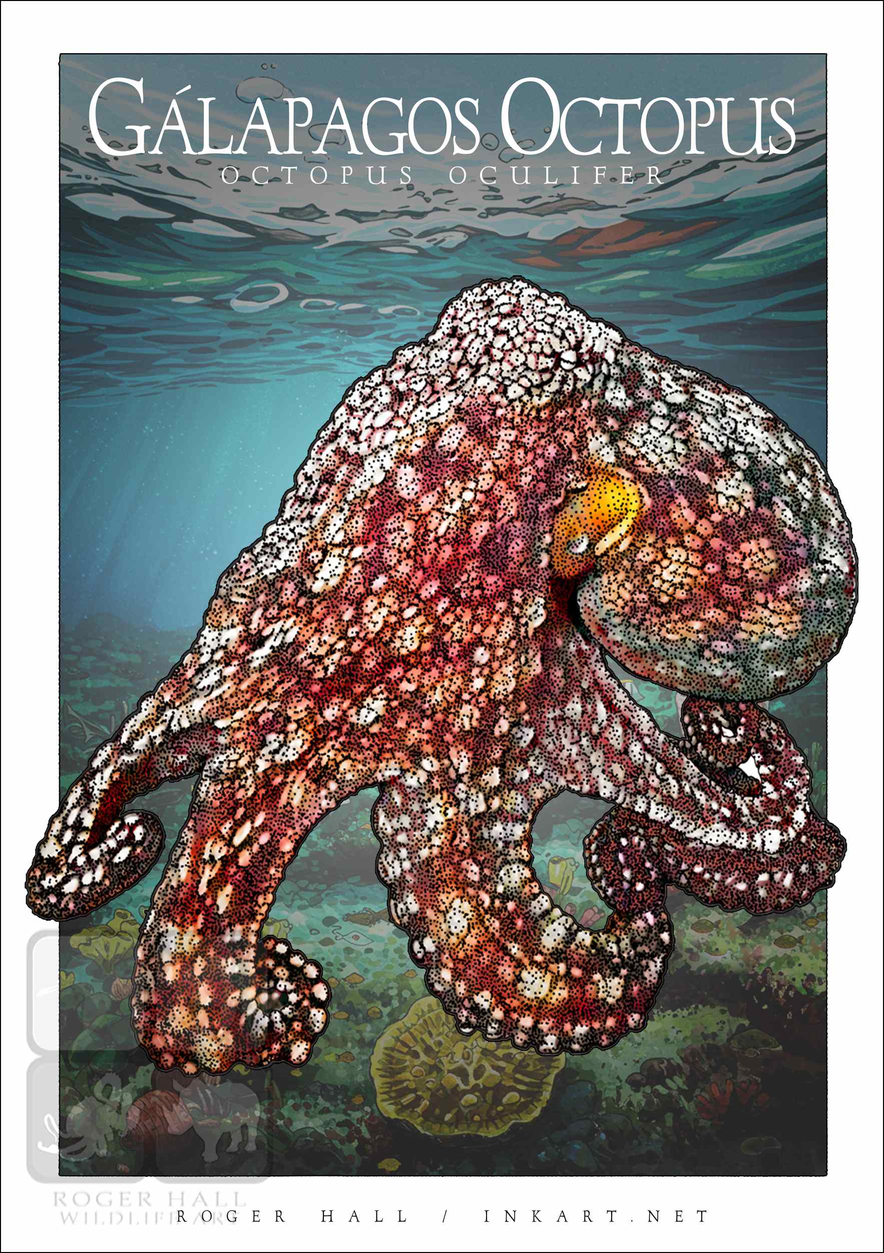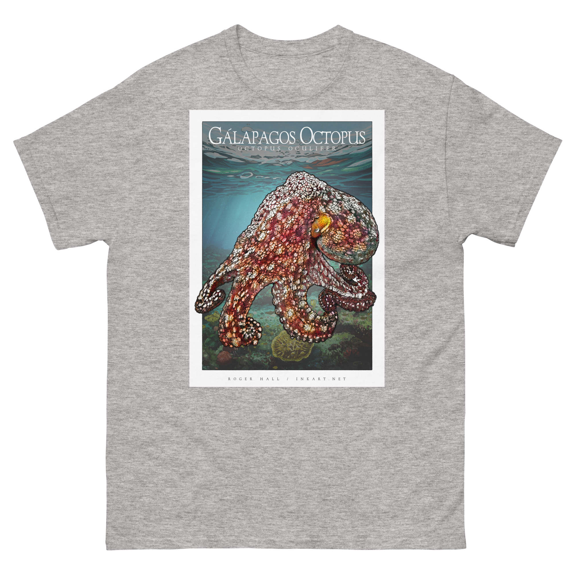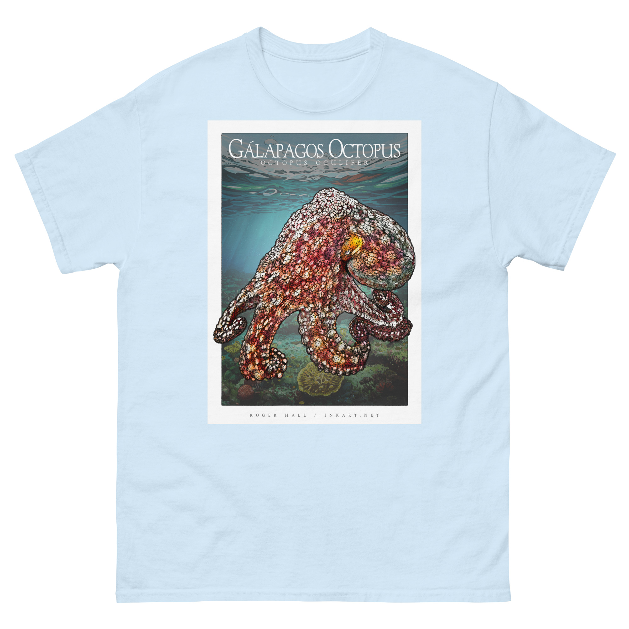 Scientifically accurate drawing of a Galapagos Octopus (Octopus oculifer.) The illustration of a printed on a high-quality 100% unisex cotton t-shirt.