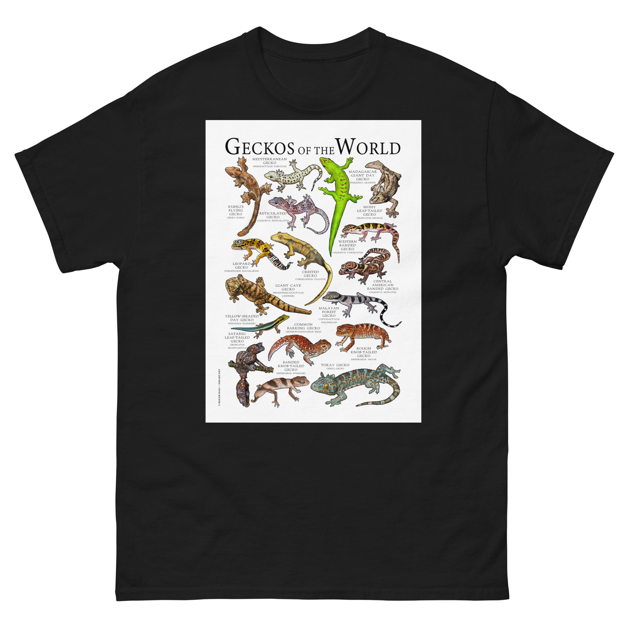 A colorful collage of scientifically accurate illustration of various species of gecko. The layout features seventeen different types of these lizards, including some of the world’s most vulnerable species printed on a high-quality 100% men’s cotton t-shirt.