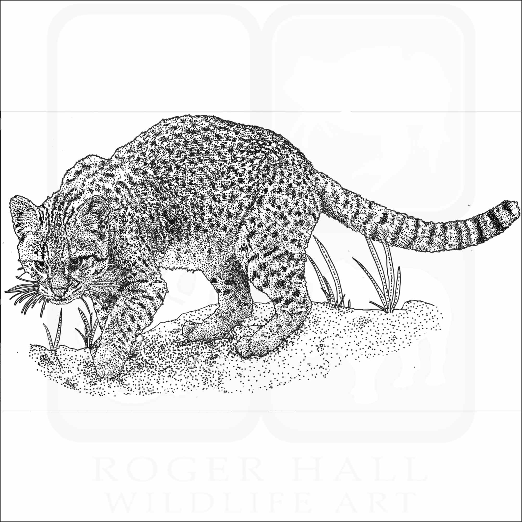 Fine art illustration of a Geoffroy’s Cat (Leopardus geoffroyi.) The illustration is available in black and white or color.
