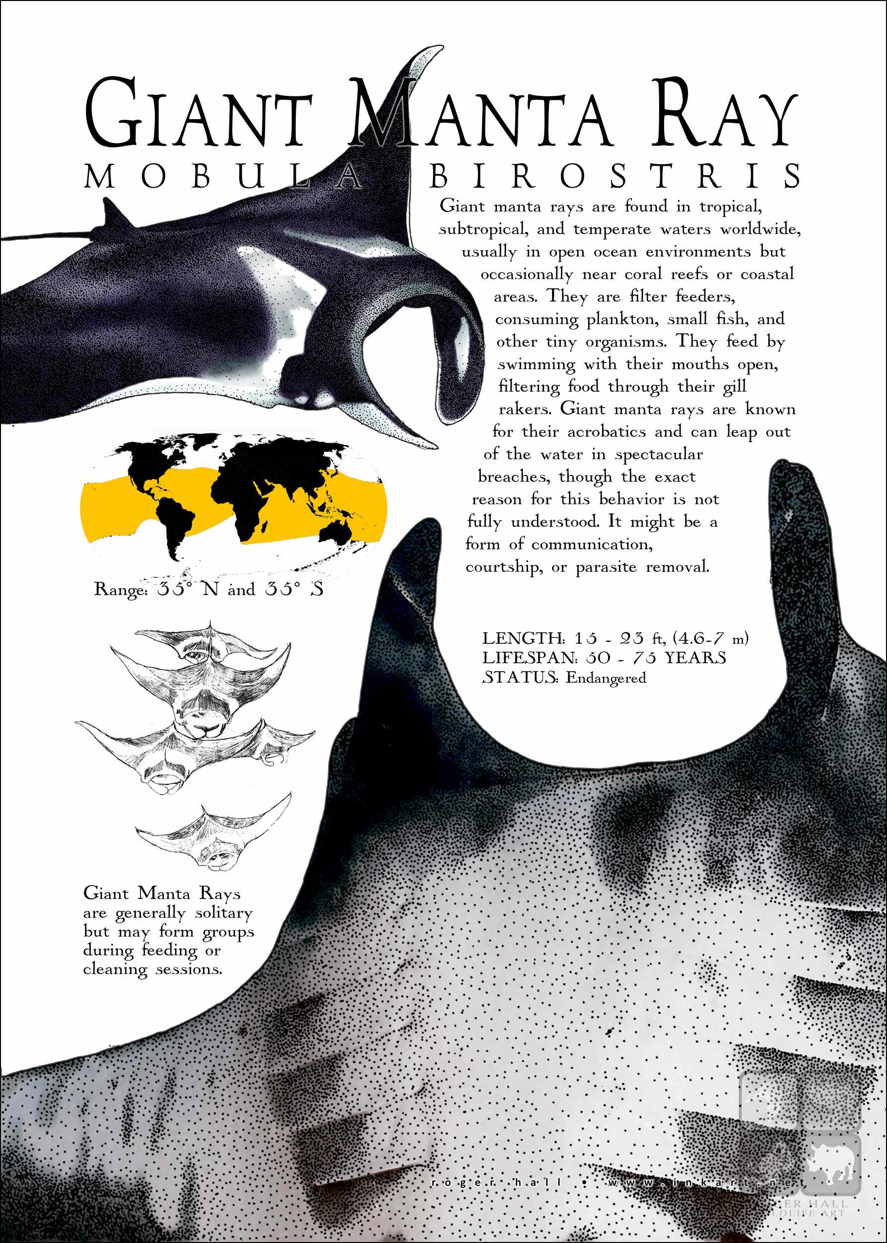 This poster features an informational graphic of the Giant Manta Ray (Mobula birostris). It includes a map of the fish’s range, along with three illustrations and a small paragraph with information.
