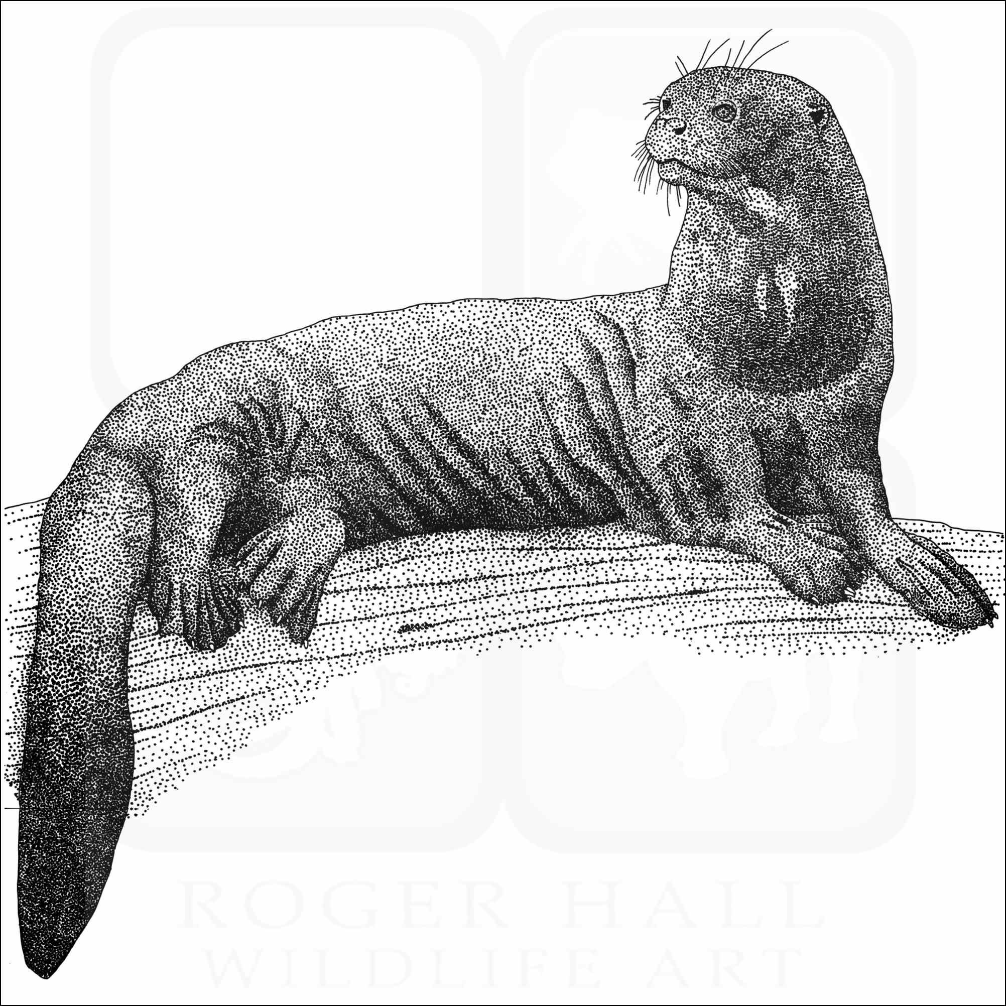 Fine art illustration of a Giant River Otter (Pteronura brasiliensis.) The illustration is available in black and white or color.