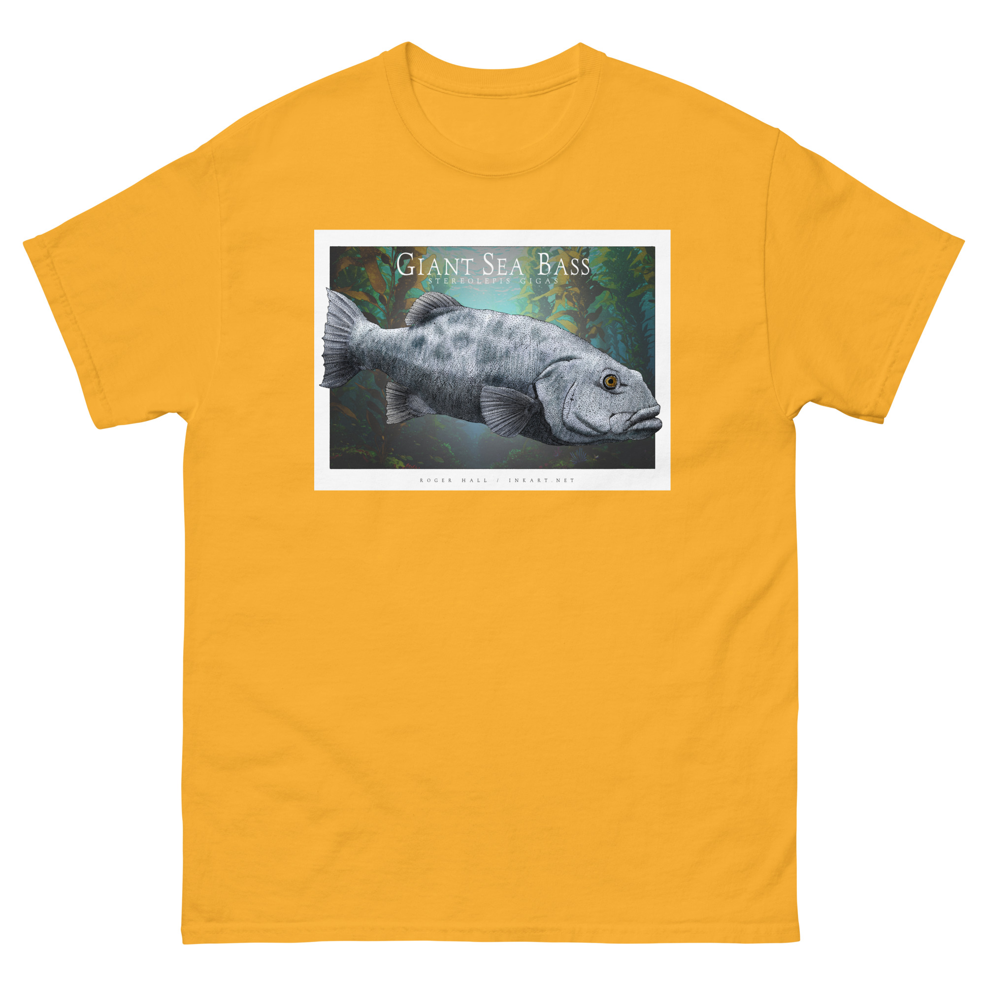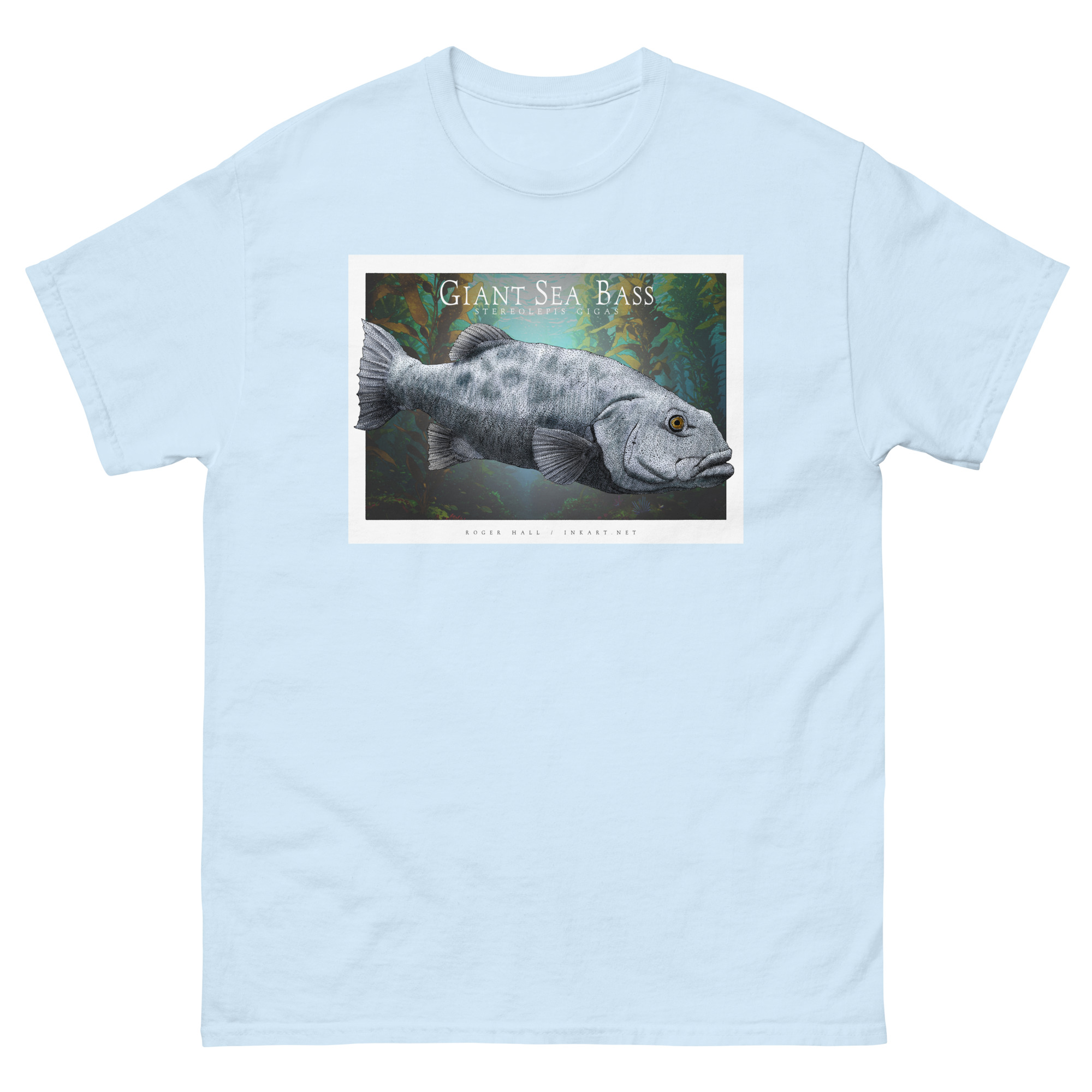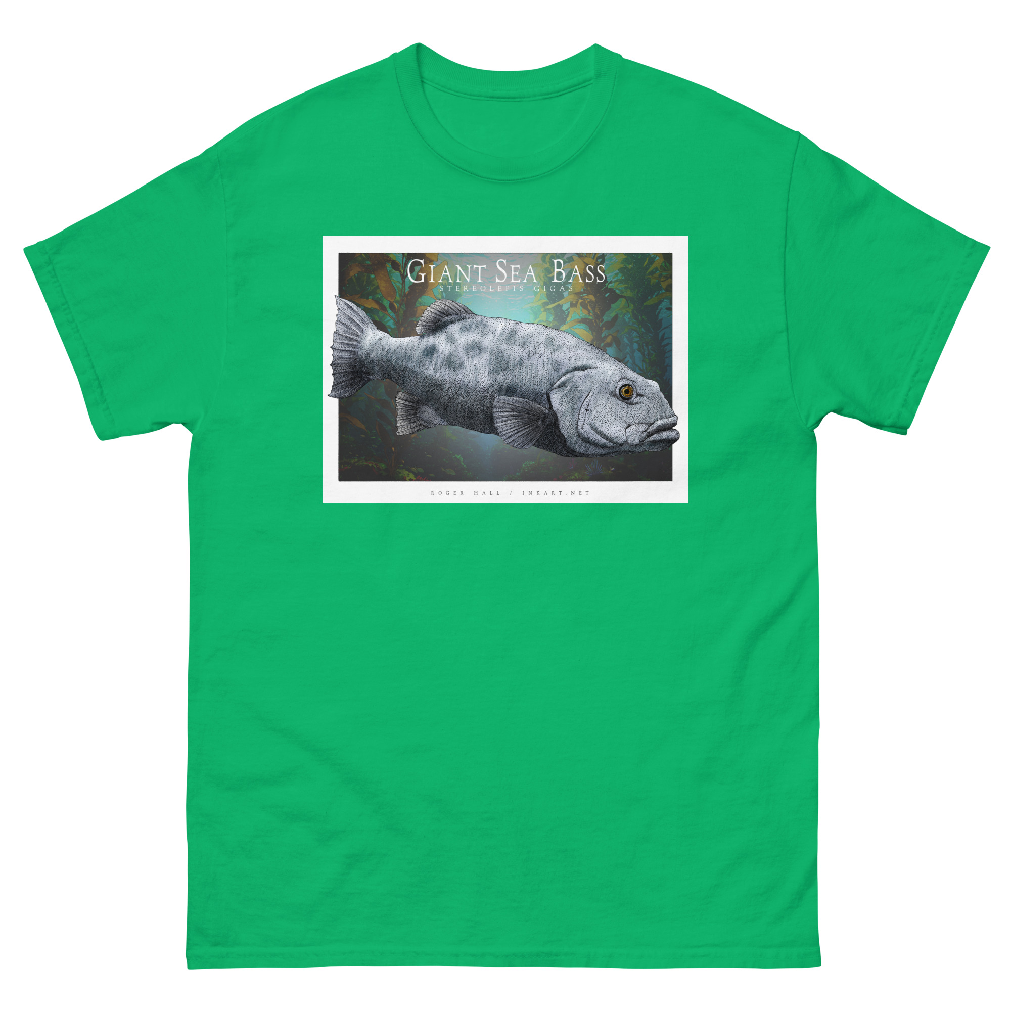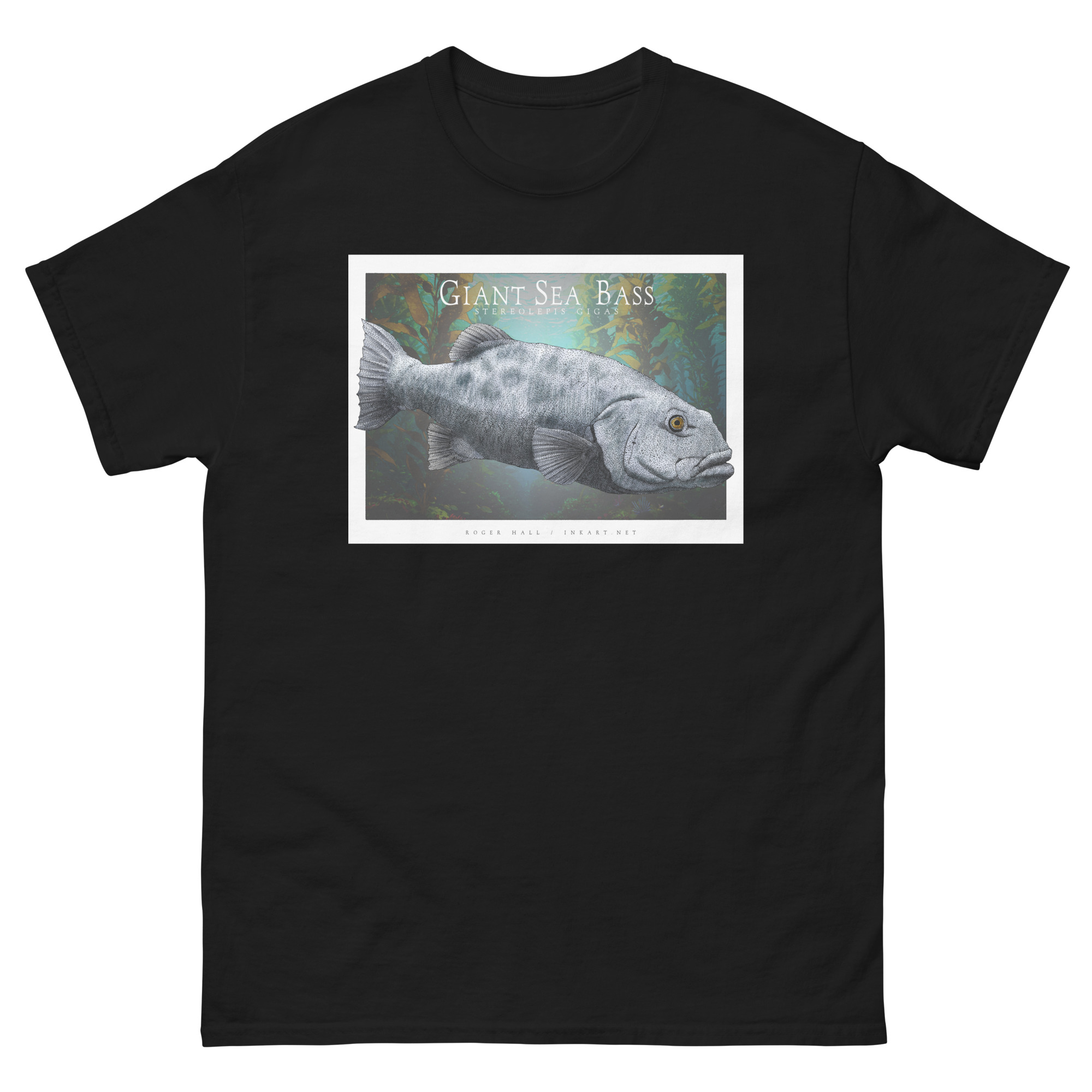 Scientifically accurate drawing of a Giant Sea Bass (Stereolepis gigas.) The illustration of a printed on a high-quality 100% unisex cotton t-shirt.