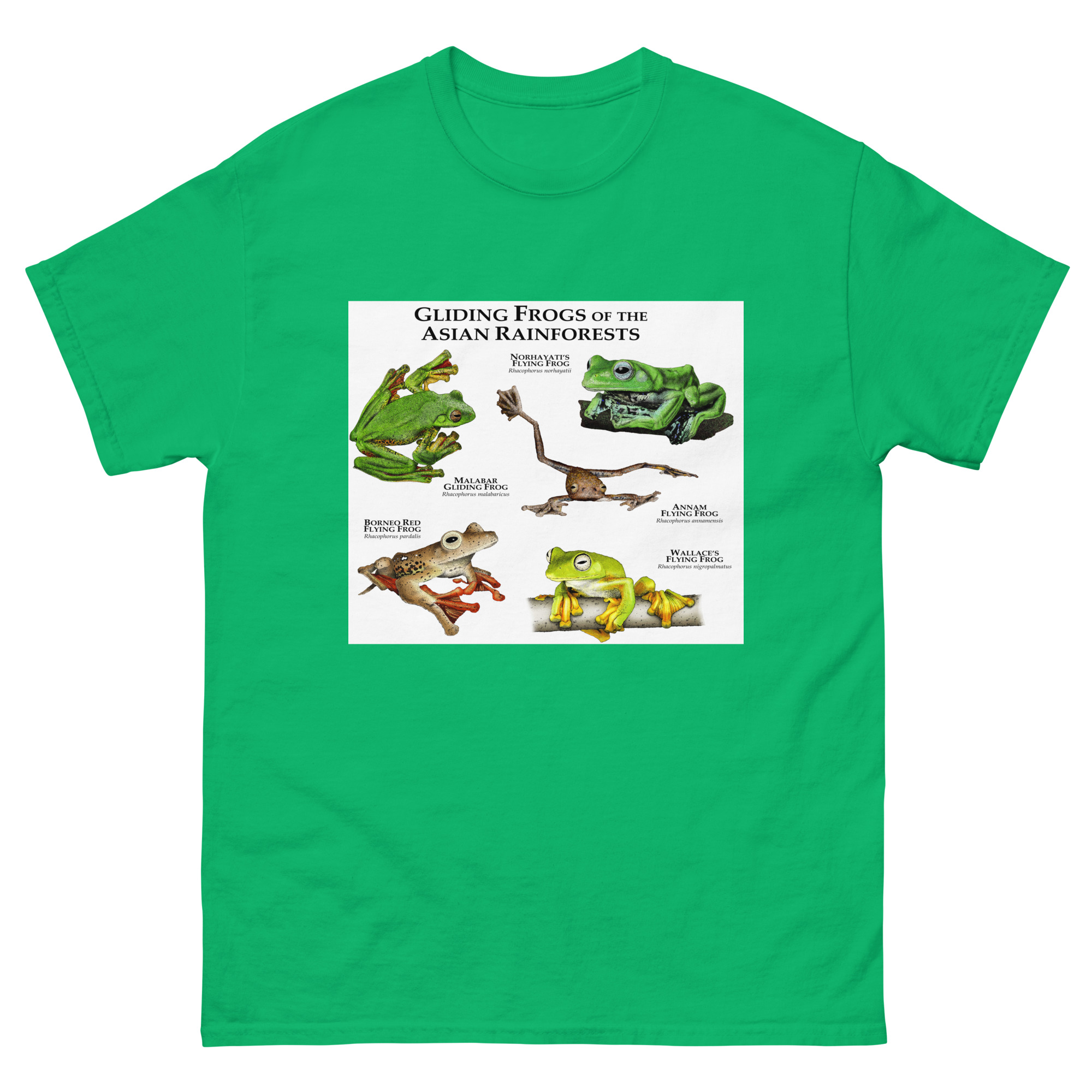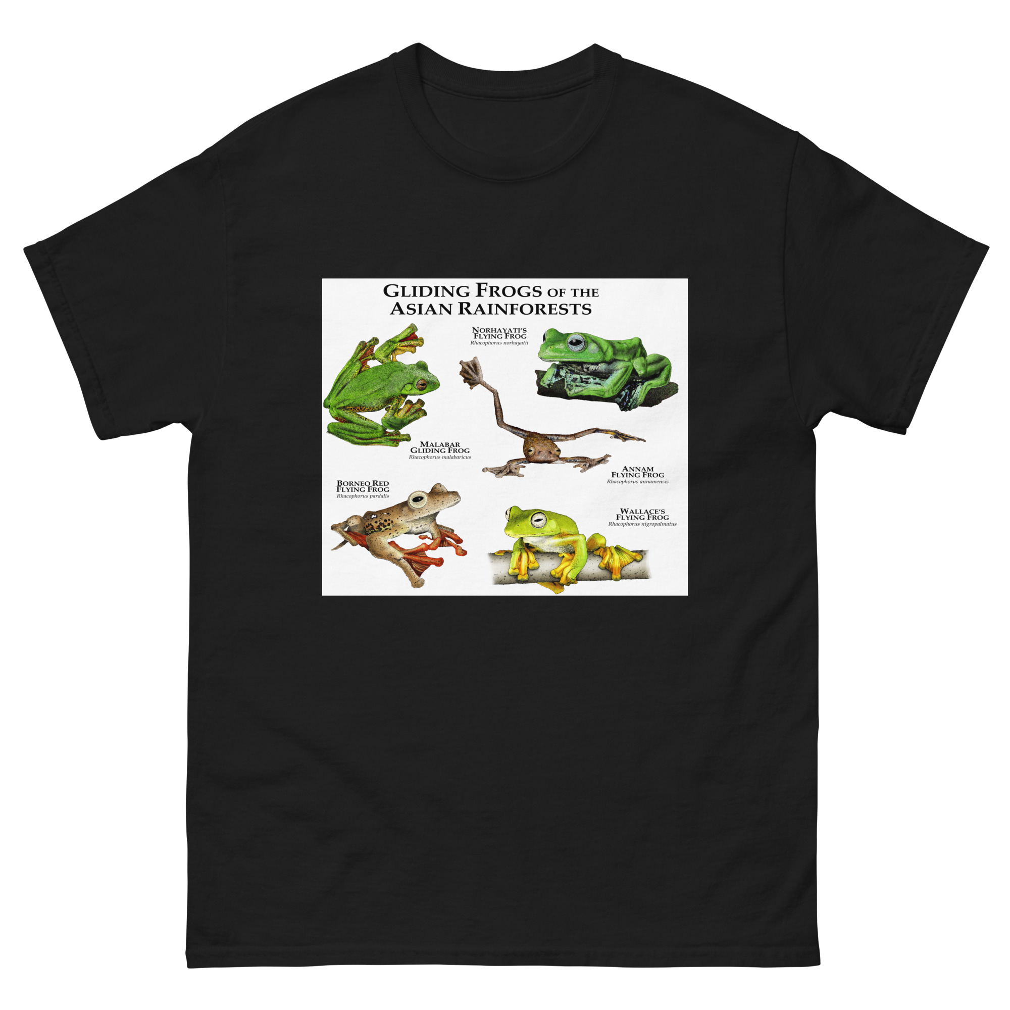 In the tropical rainforests of Southeast Asia, the frogs have evolved oversized webbing on their feet, which allows them to control their falls and glide from tree to tree. This image features fine art illustration of various species of gliding or flying frogs native to the tropical rainforests of Southeast Asia printed on a high-quality men’s t-shirt