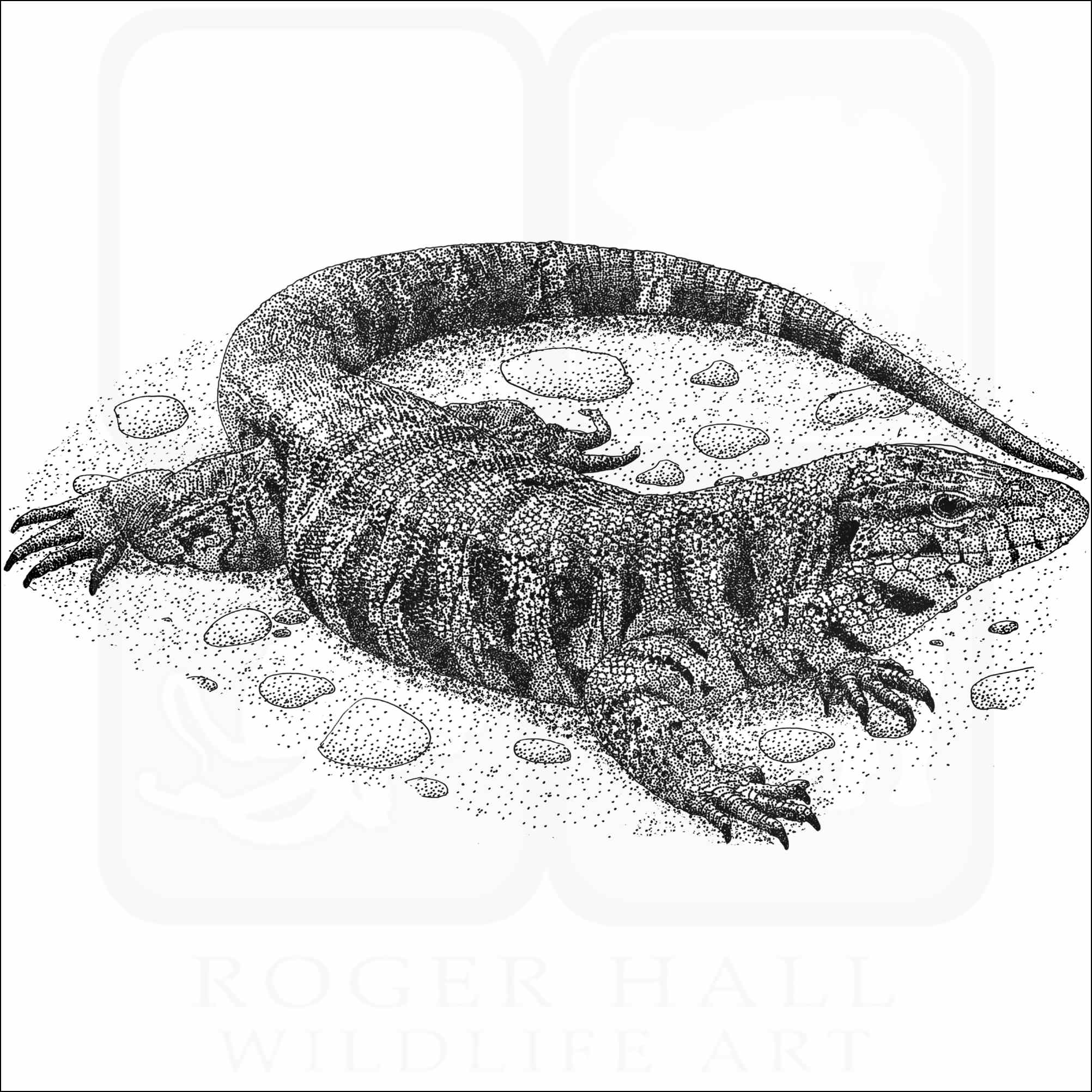 Fine art illustration of a Golden Tegu (Tupinambis teguixin.) The illustration is available in black and white or color.