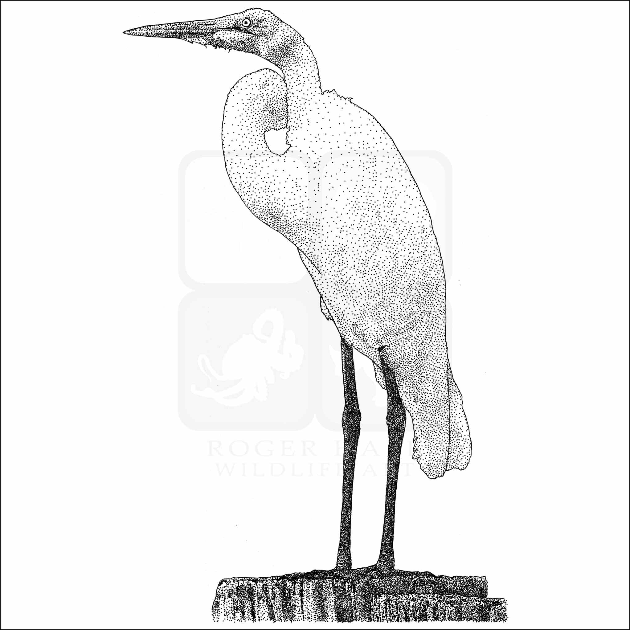 Fine art illustration of a Great Egret (Ardea alba.) The illustration is available in black and white or color.
