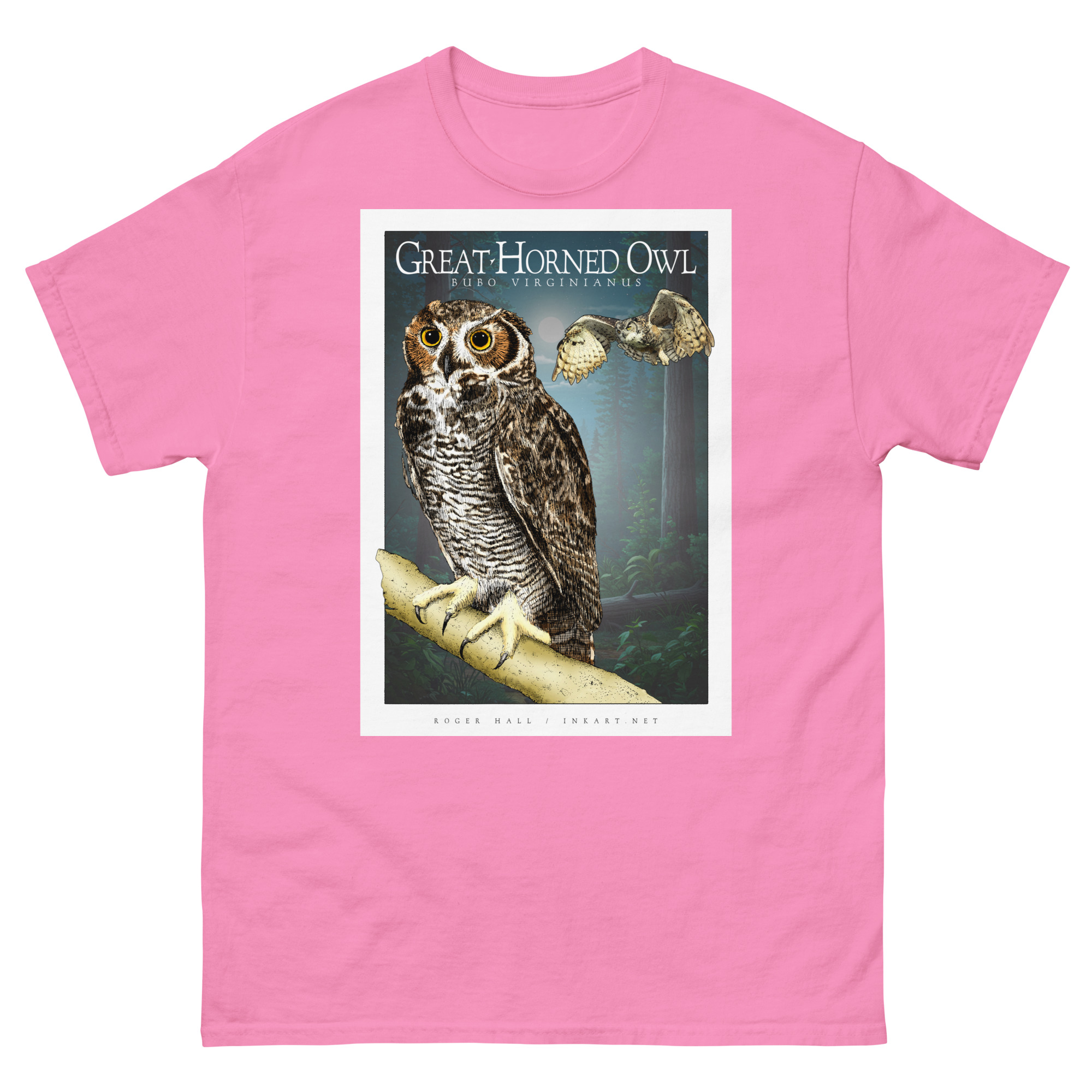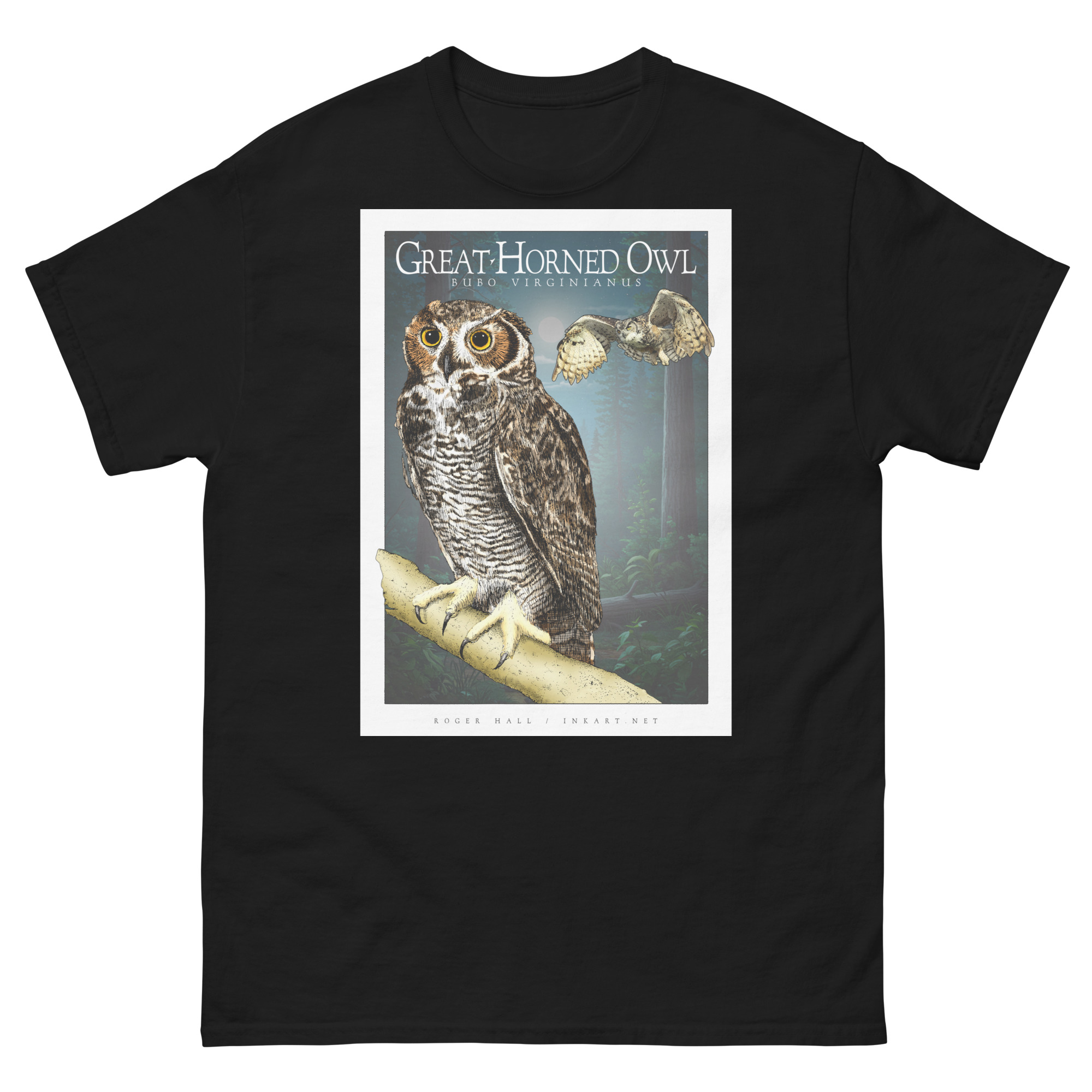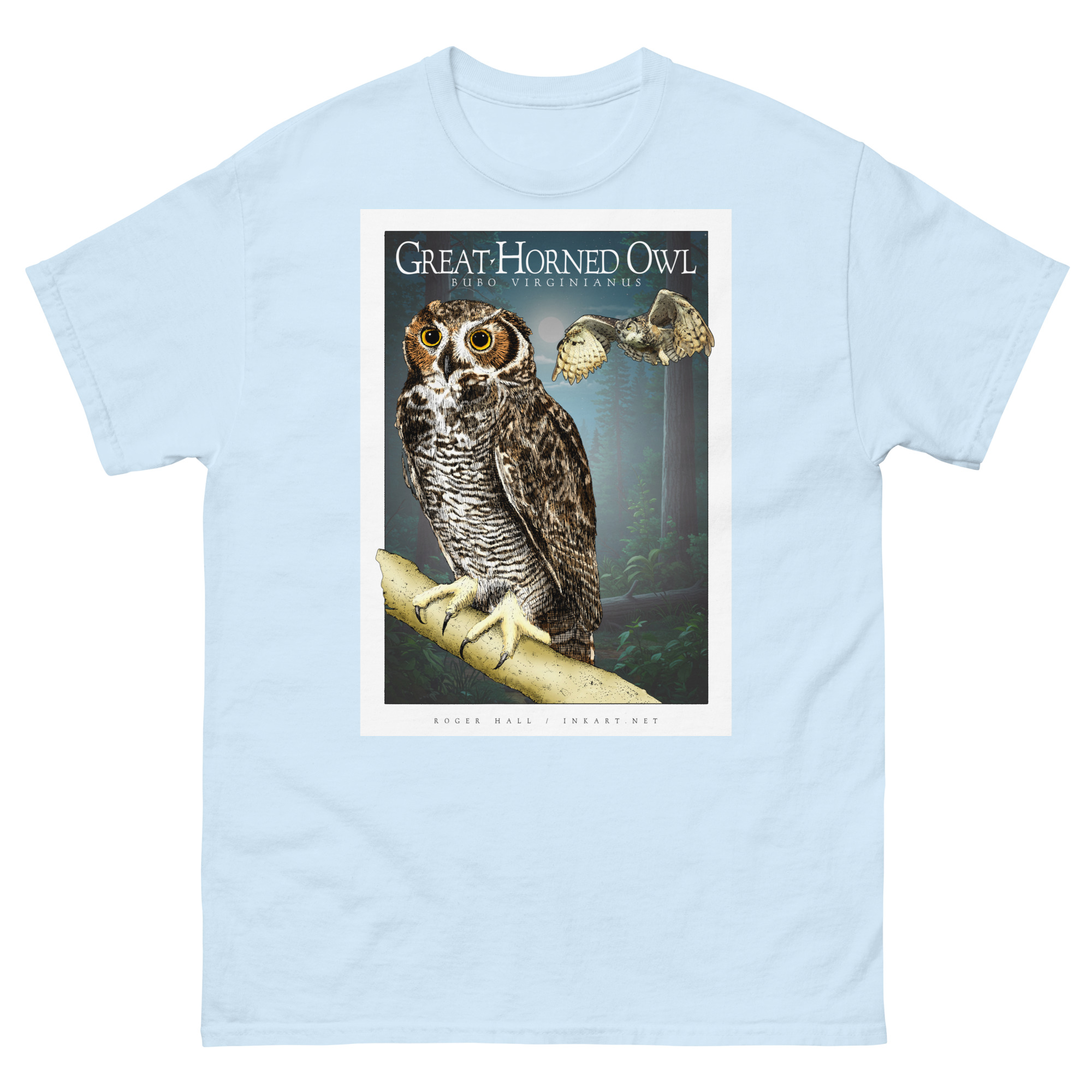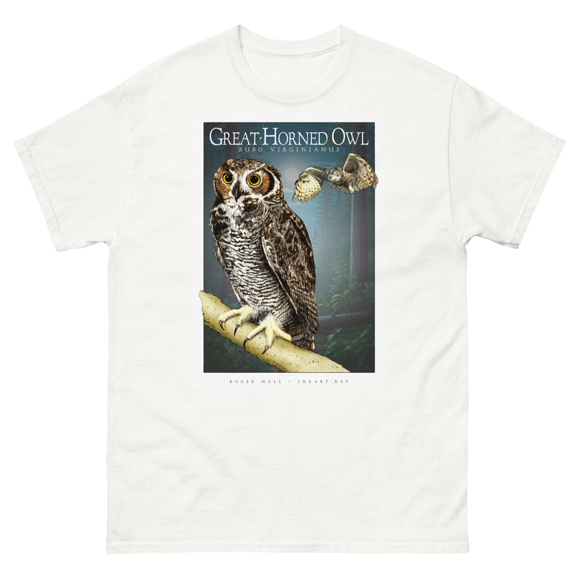Scientifically accurate drawing of a Great-Horned Owl (Bubo virginianus.) The illustration of a printed on a high-quality 100% unisex cotton t-shirt.