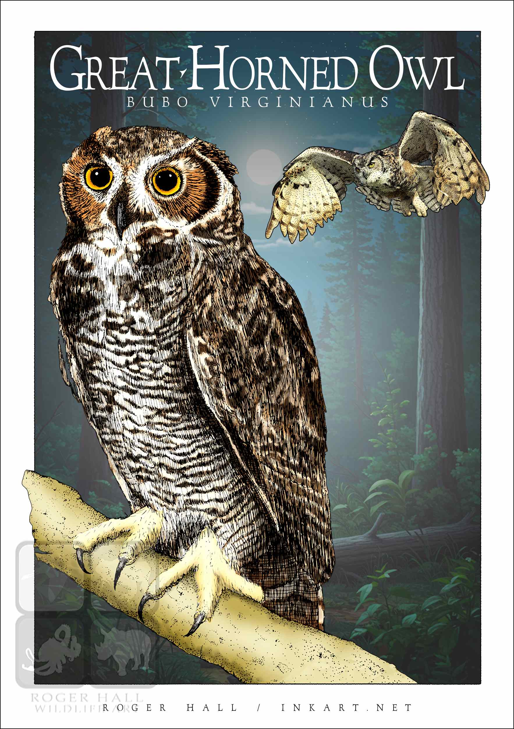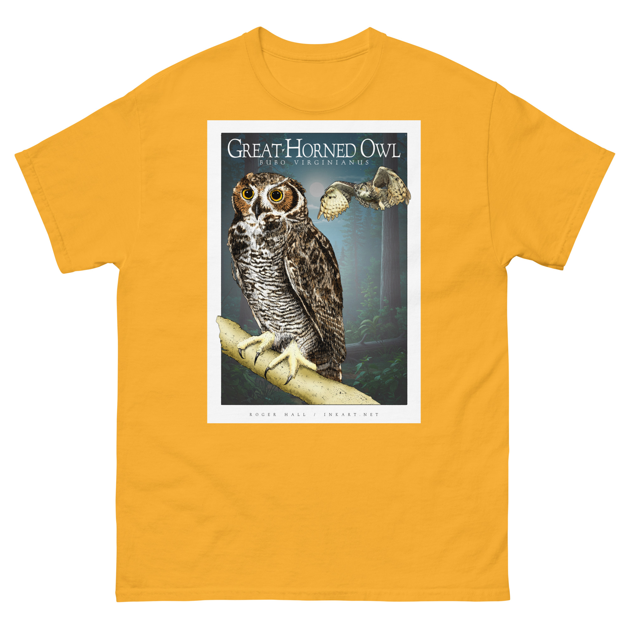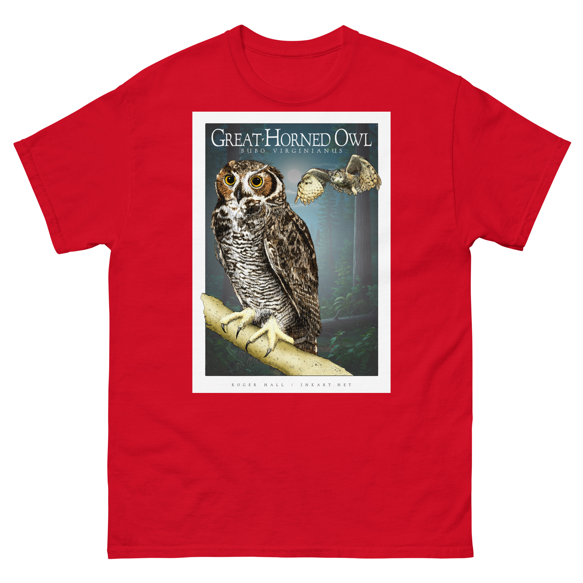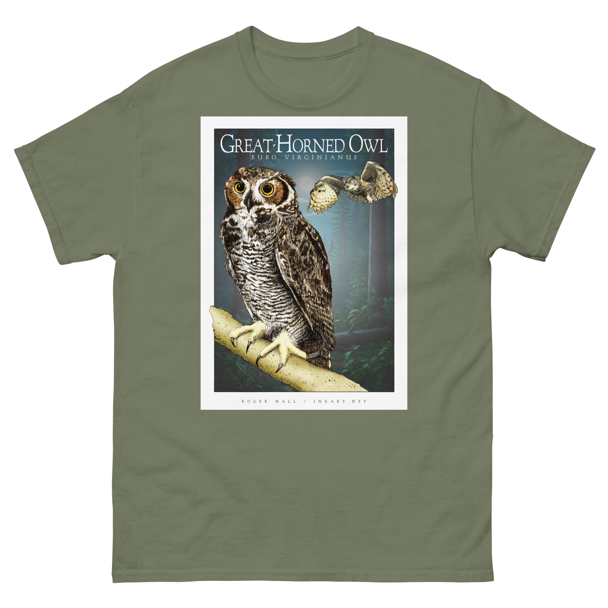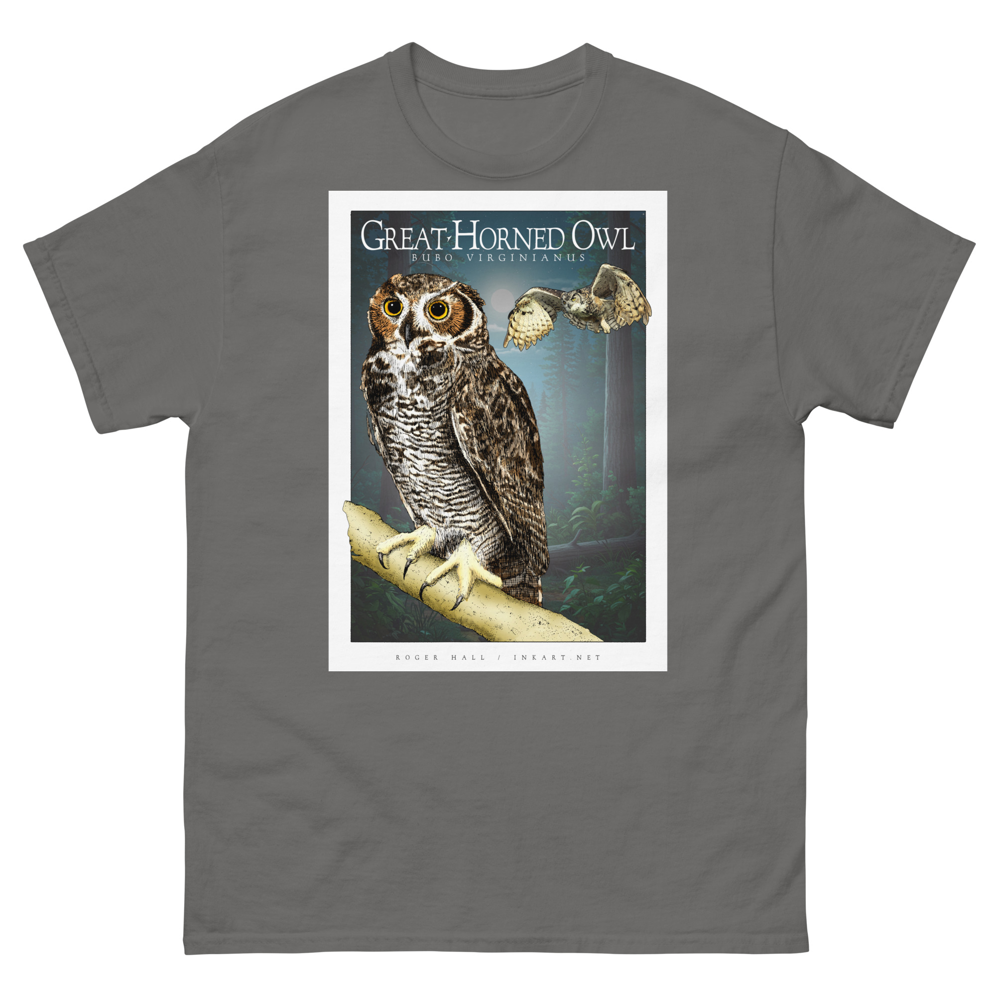 Scientifically accurate drawing of a Great-Horned Owl (Bubo virginianus.) The illustration of a printed on a high-quality 100% unisex cotton t-shirt.