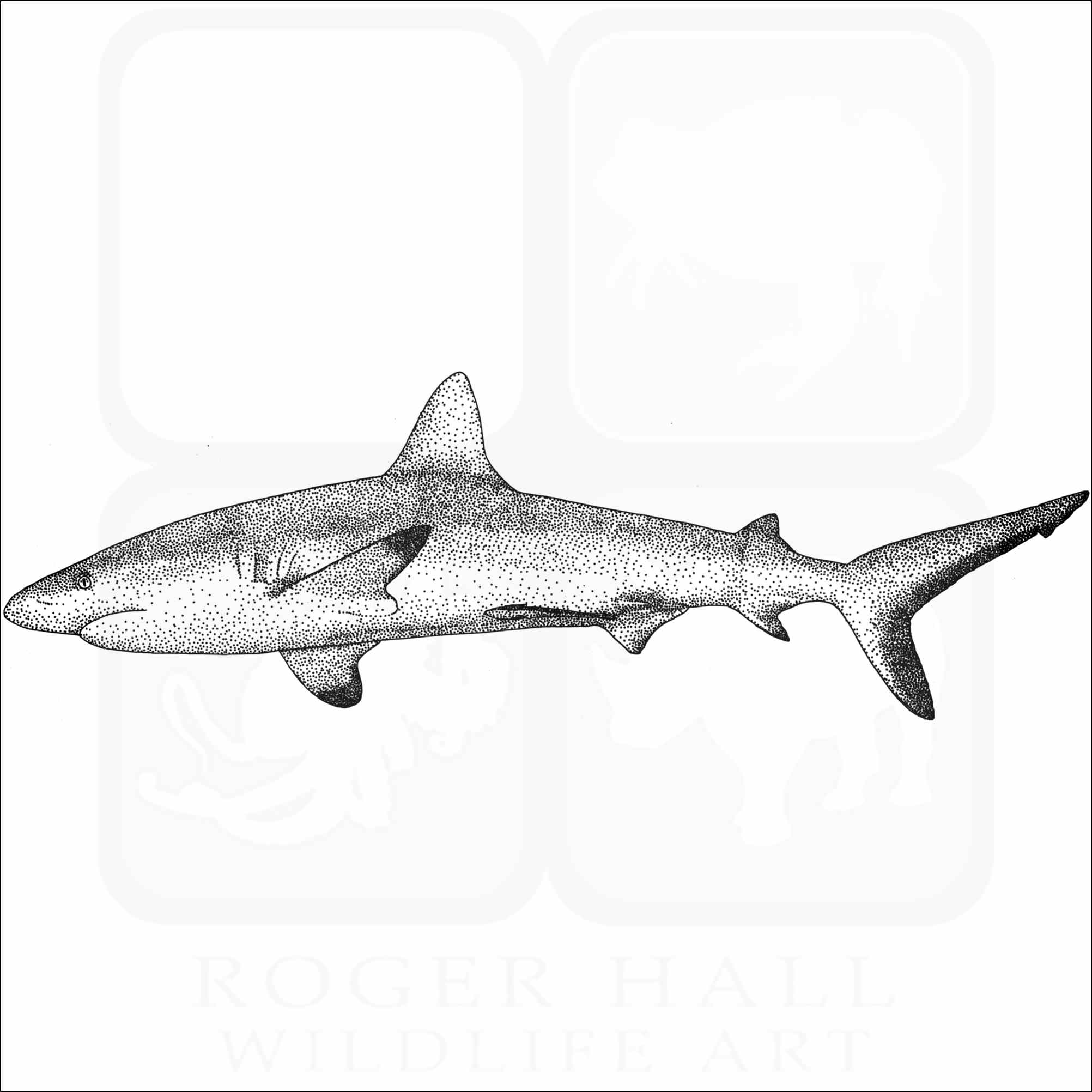 Fine art illustration of a Grey Reef Shark (Carcharhinus amblyrhynchos.) The illustration is available in black and white or color.