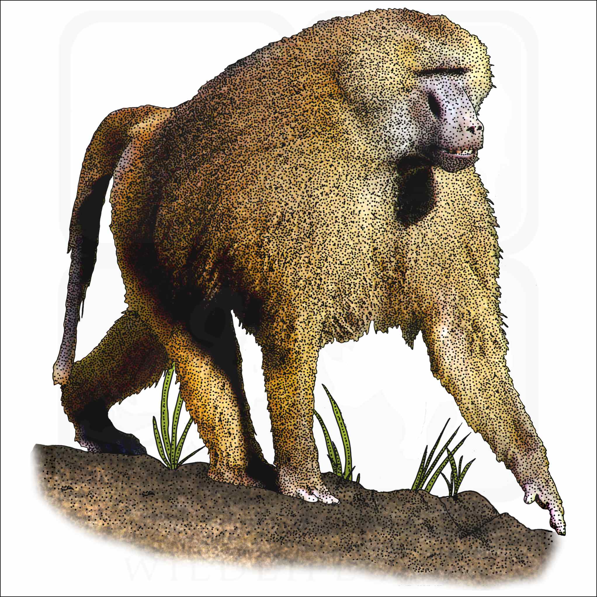 Fine art illustration of a Guinea Baboon (Papio Papio.) The illustration is available in black and white or color.