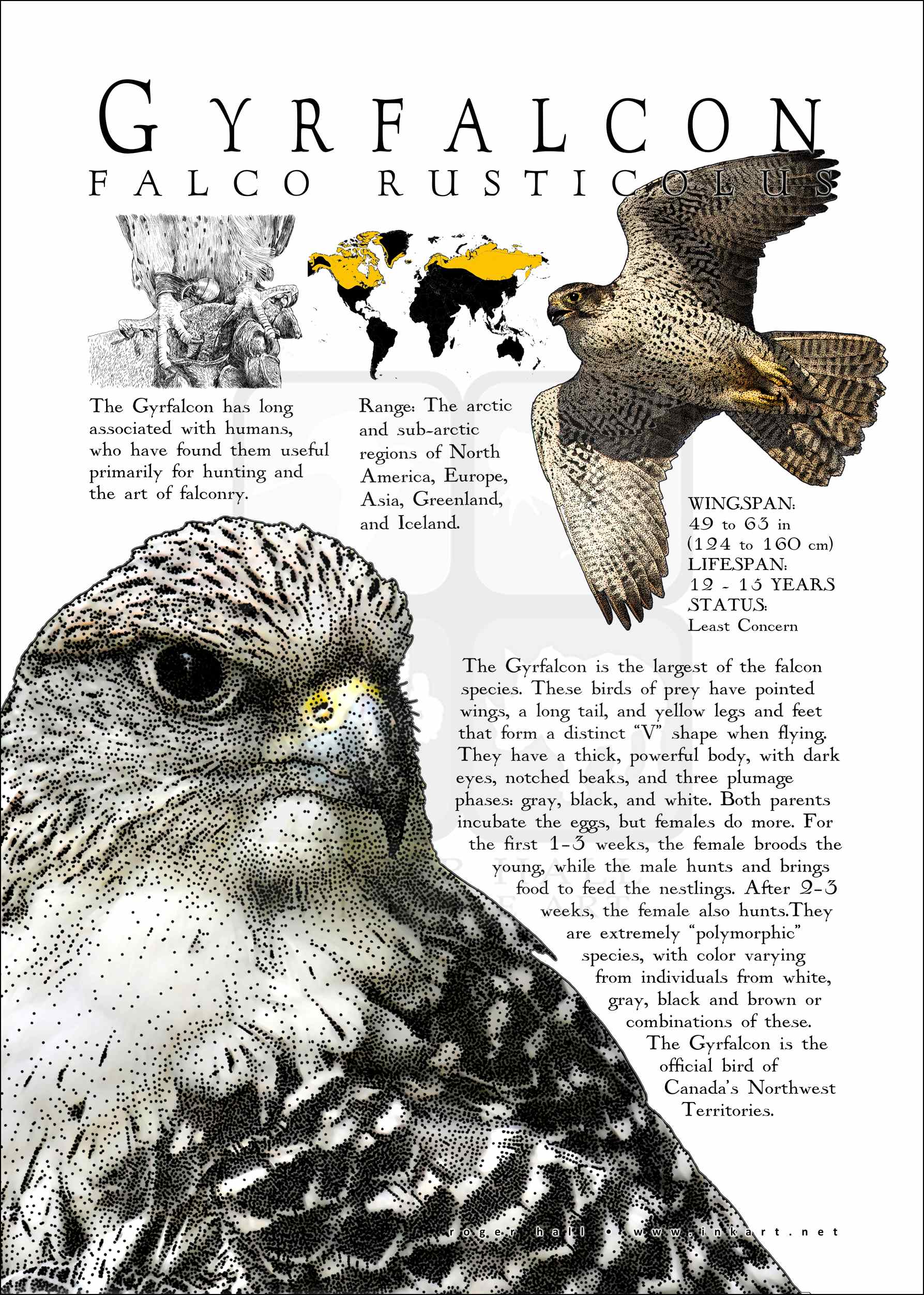 This poster features an informational graphic of the Gyrfalcon (Falco rusticolus). It includes a map of the falcon’s range, along with three illustrations and a small paragraph with information about this species of bird.