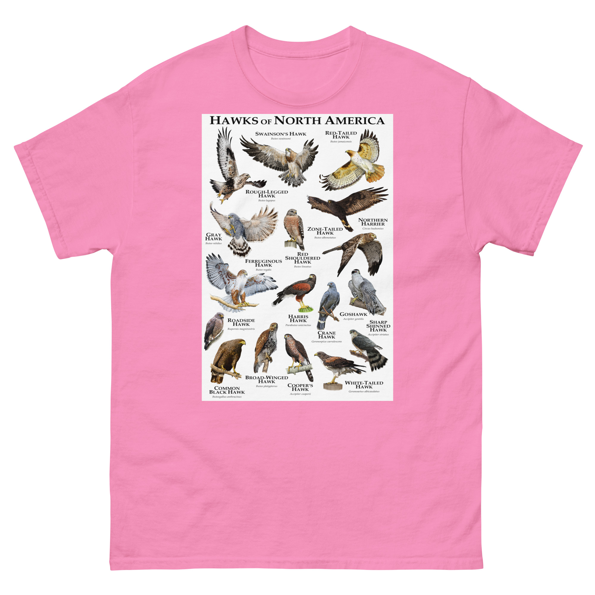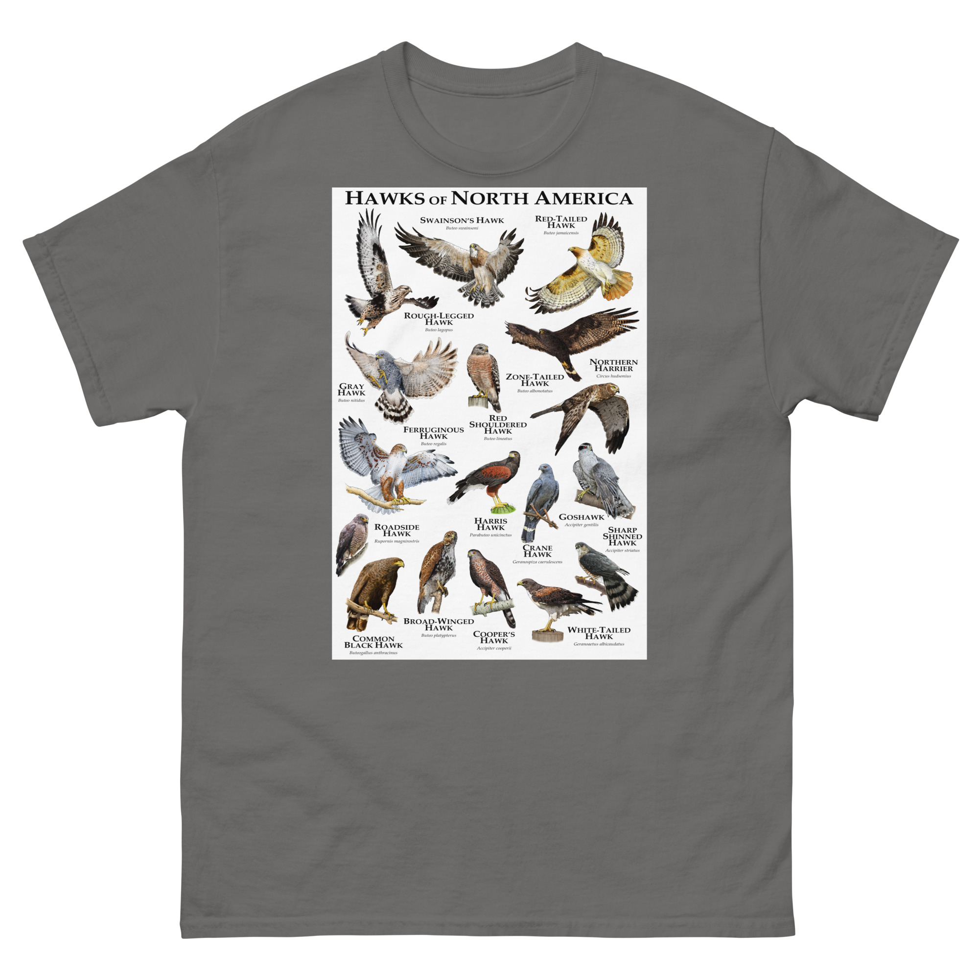 A colorful collage of scientifically accurate illustration of all extant (living) species of hawk native to North America printed on a high-quality 100% men’s cotton t-shirt.