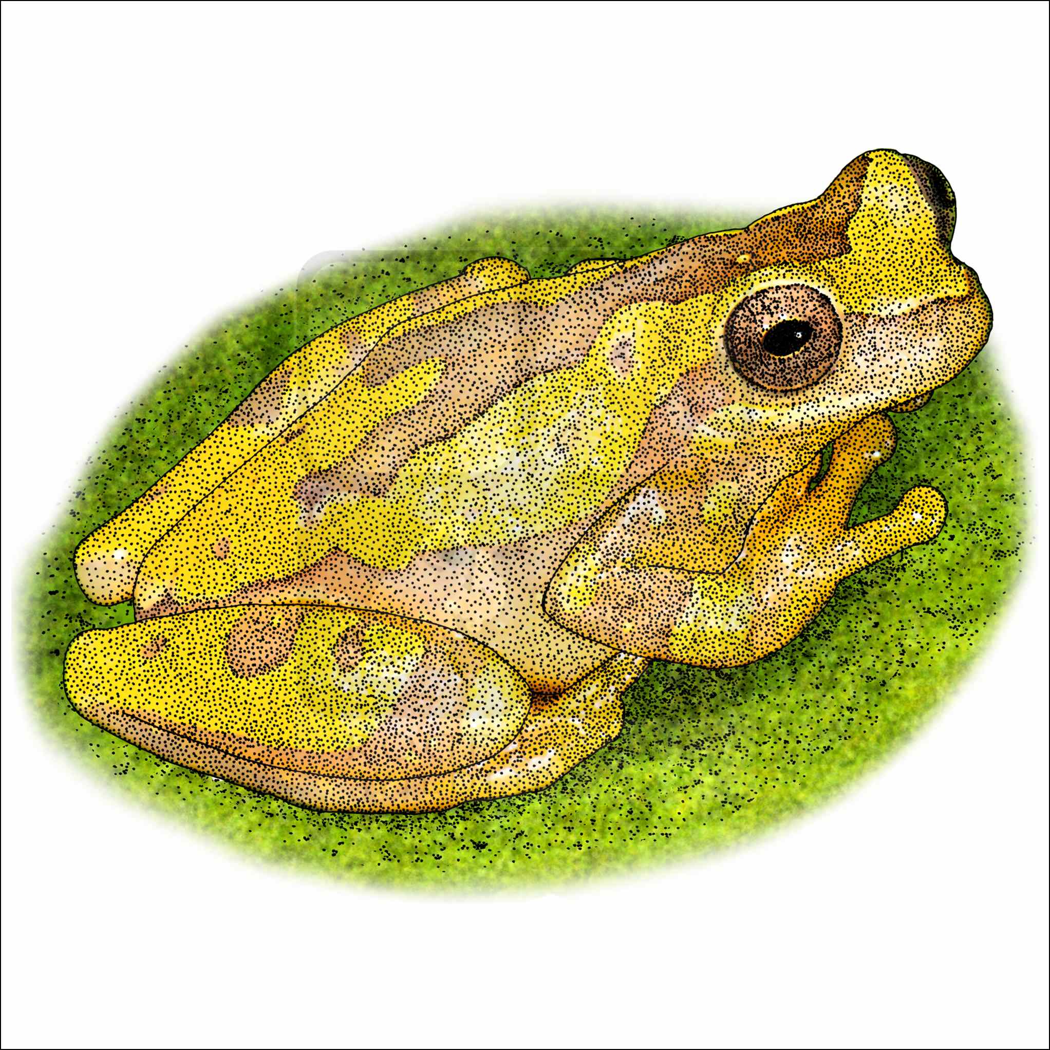 Fine art illustration of an Hourglass Tree Frog (Dendropsophus ebraccatus.) The illustration is available in black and white or color.