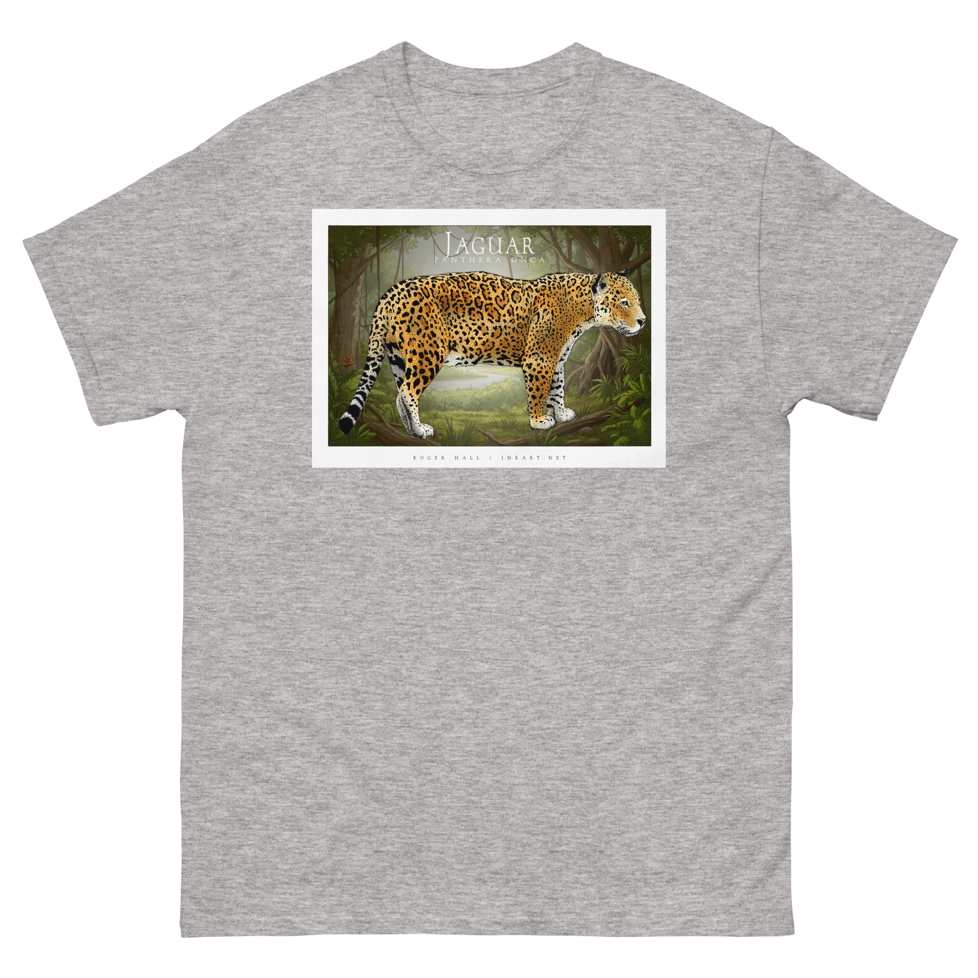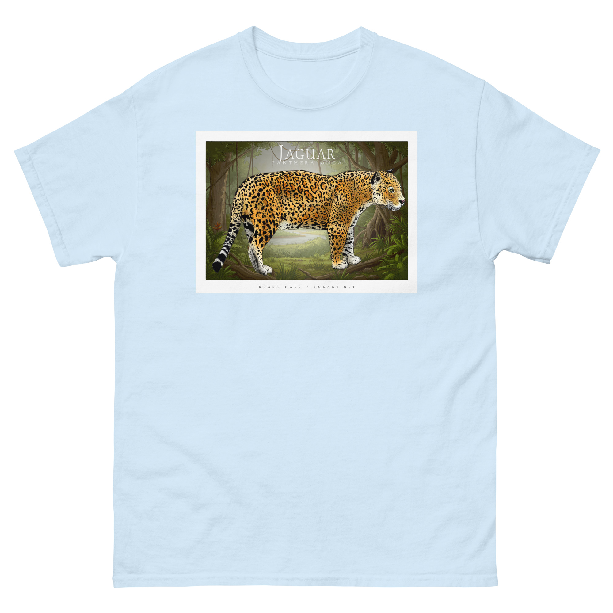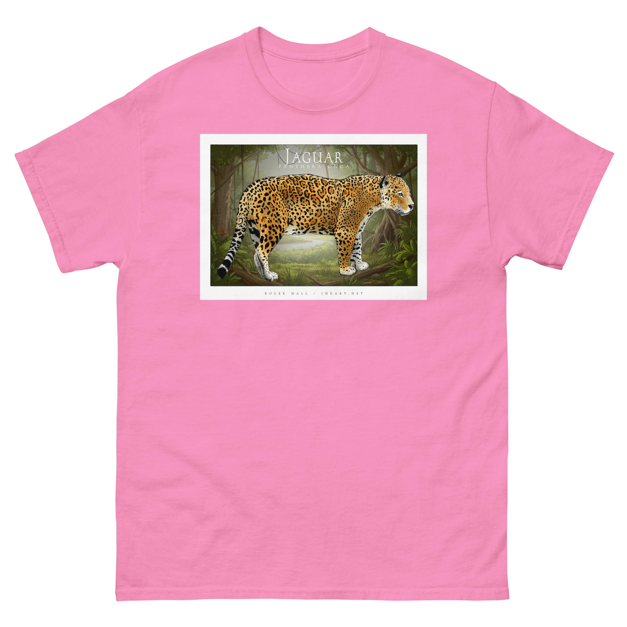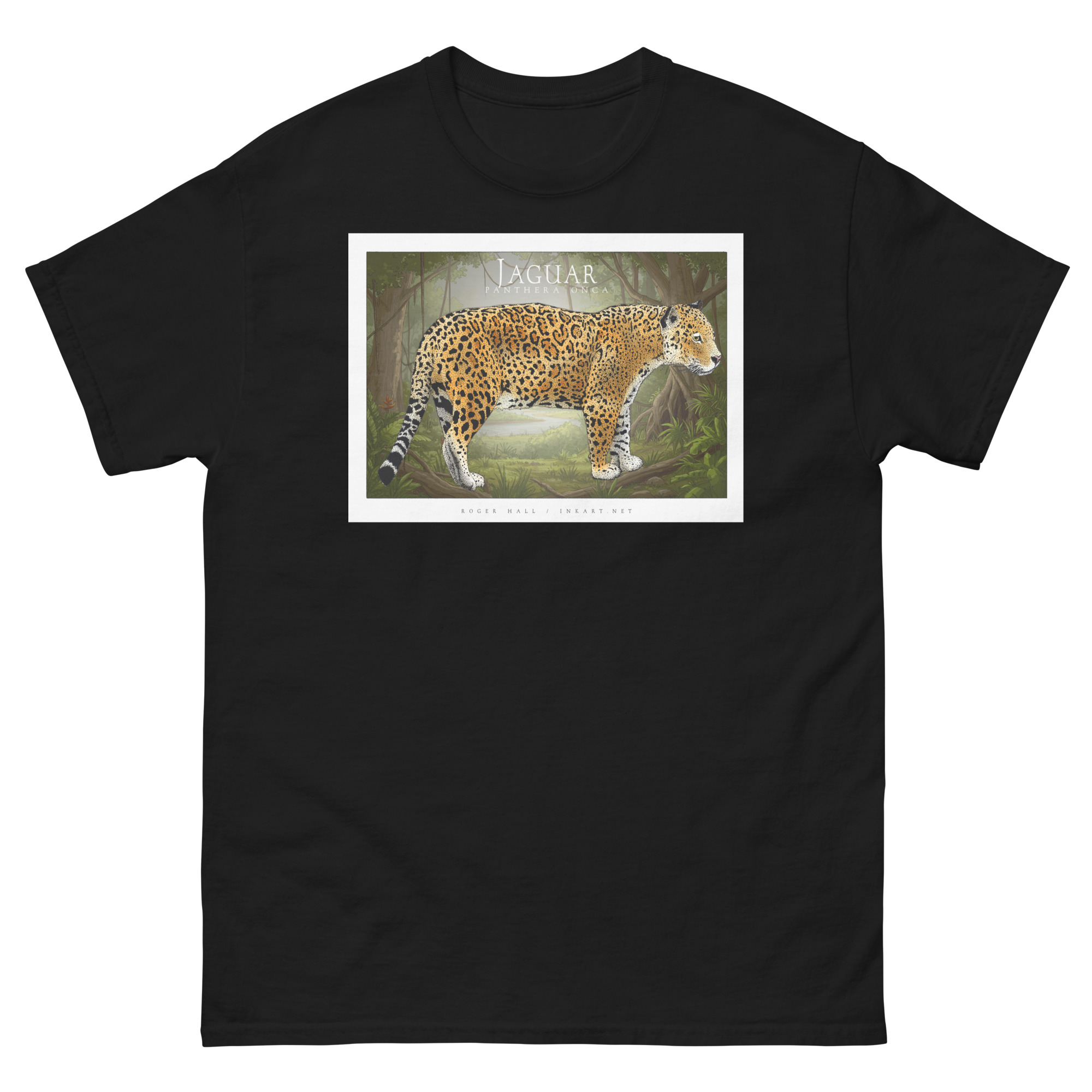 Fine art illustration of an endangered Jaguar (Panthera onca) printed on a high-quality 100% men’s cotton t-shirt.