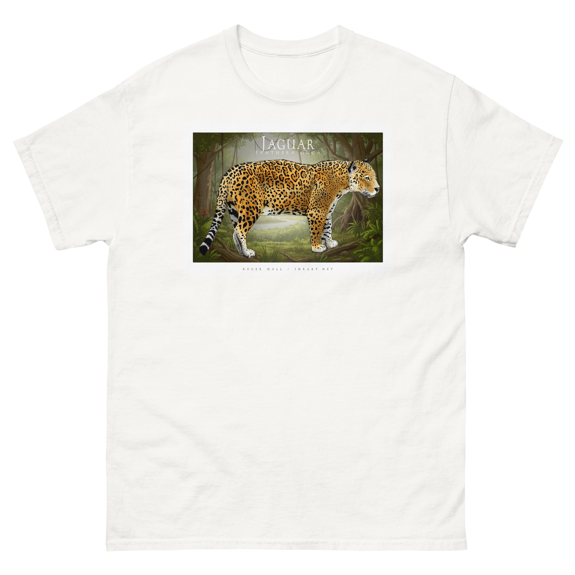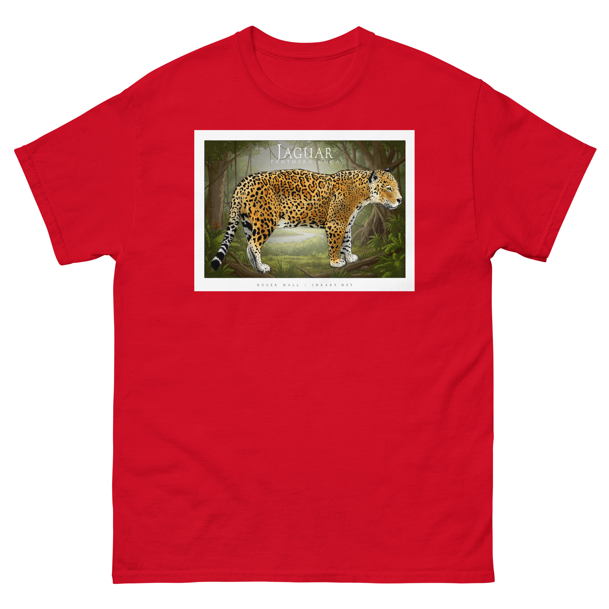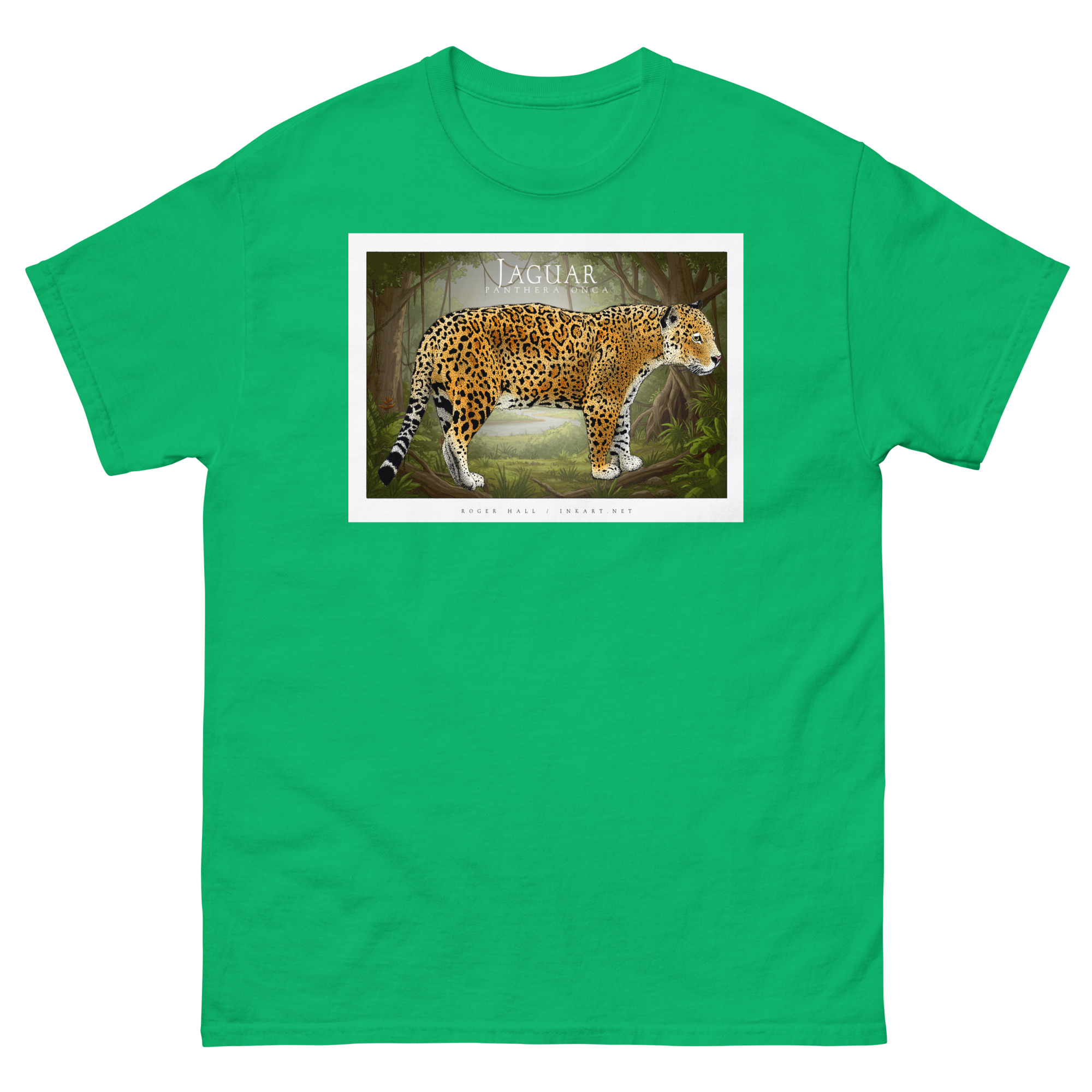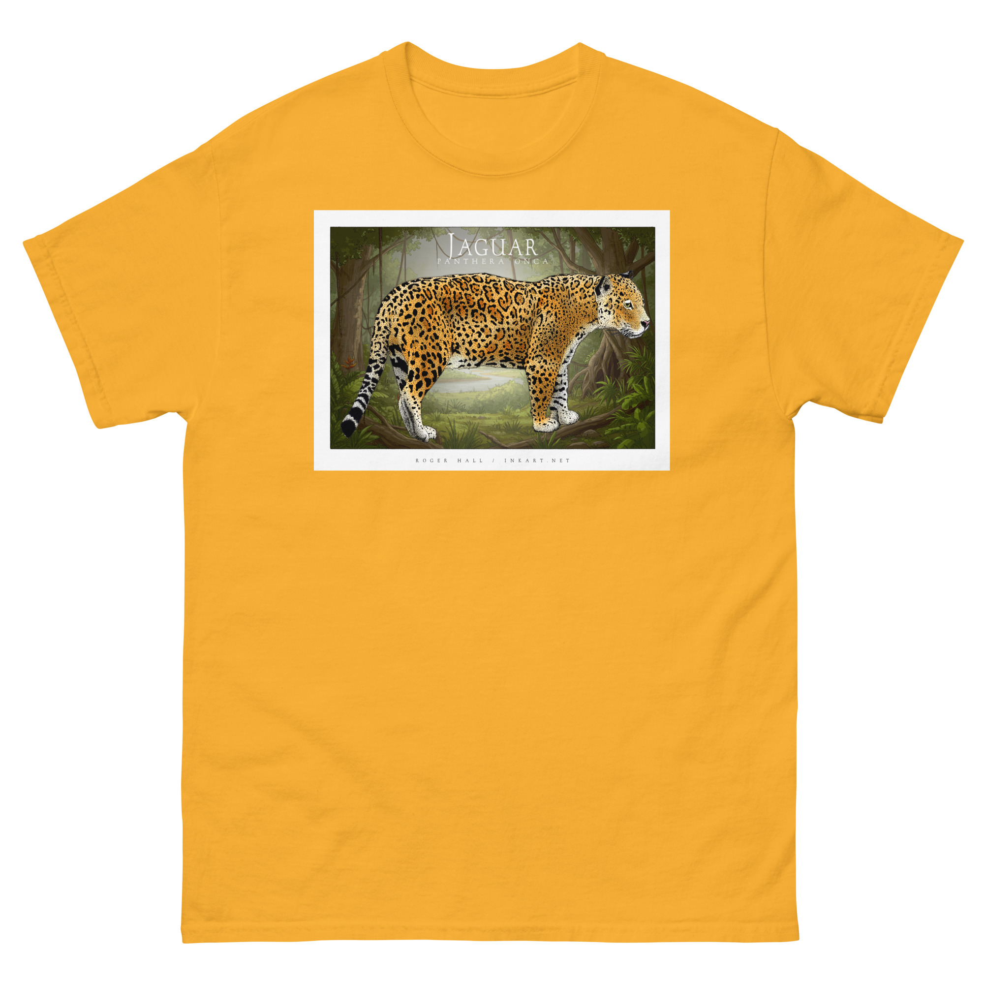Fine art illustration of an endangered Jaguar (Panthera onca) printed on a high-quality 100% men’s cotton t-shirt.