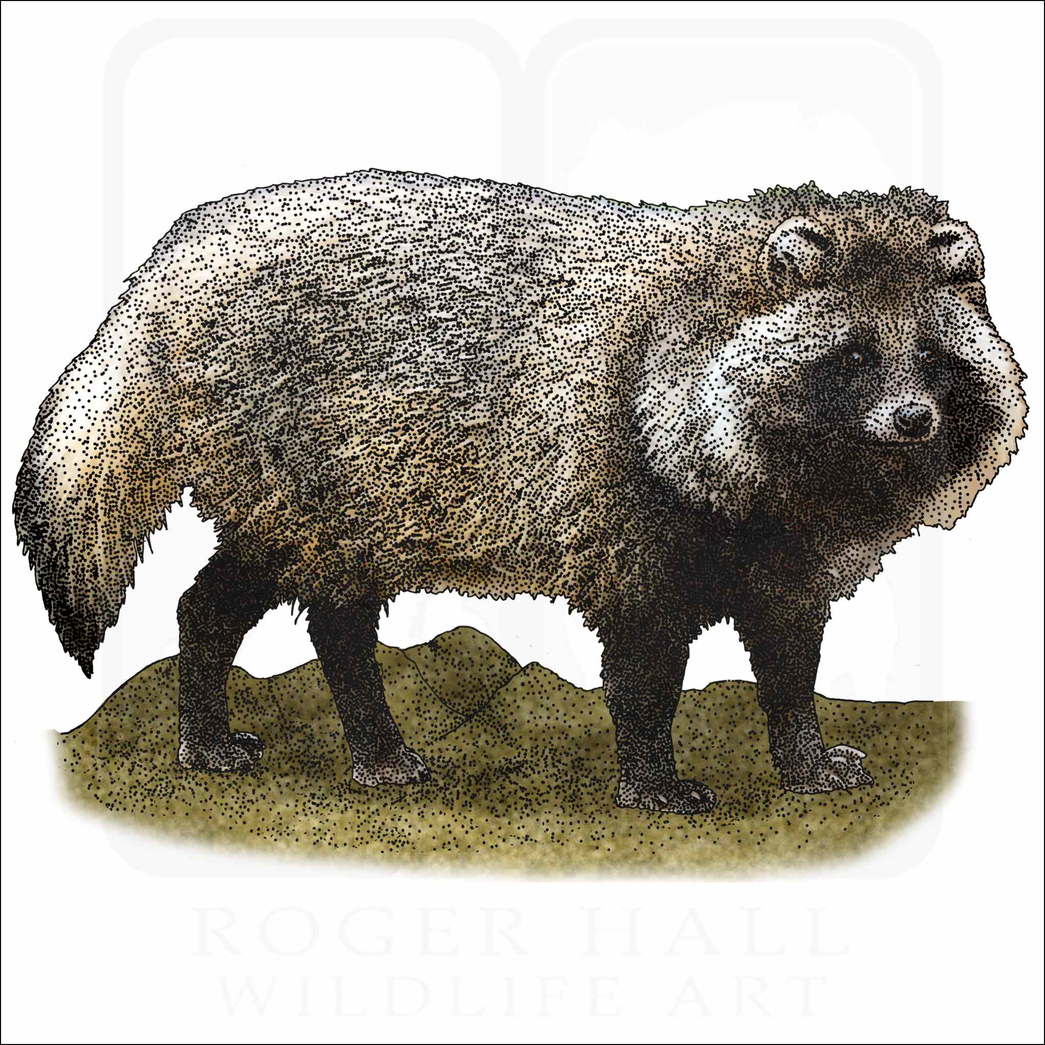 Fine art illustration of a Japanese Raccoon Dog (Nyctereutes viverrinus.) The illustration is available in black and white or color.