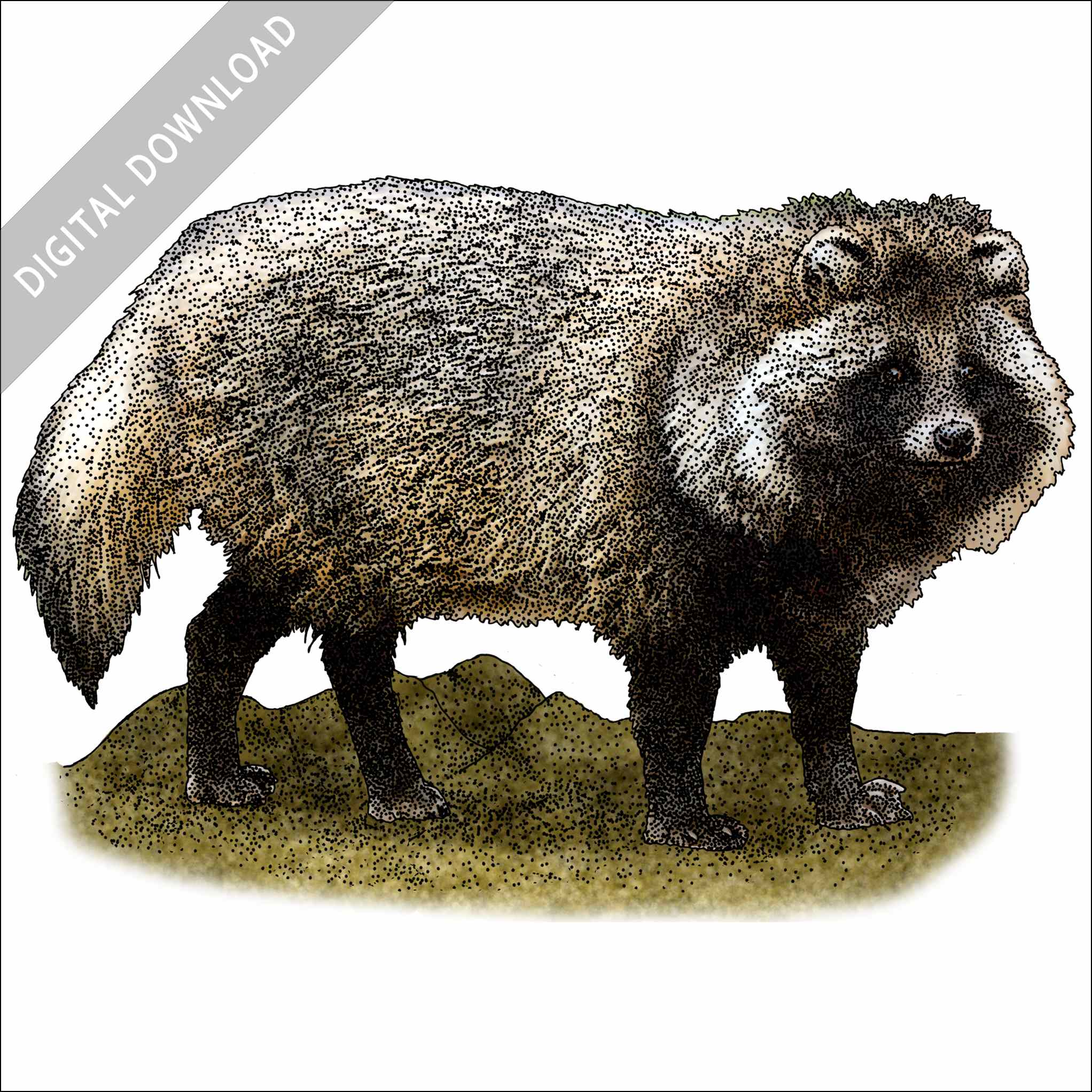 Stock art illustration of a Japanese Raccoon Dog (Nyctereutes viverrinus.)Â The illustration is available in black and white or color for immediate download.