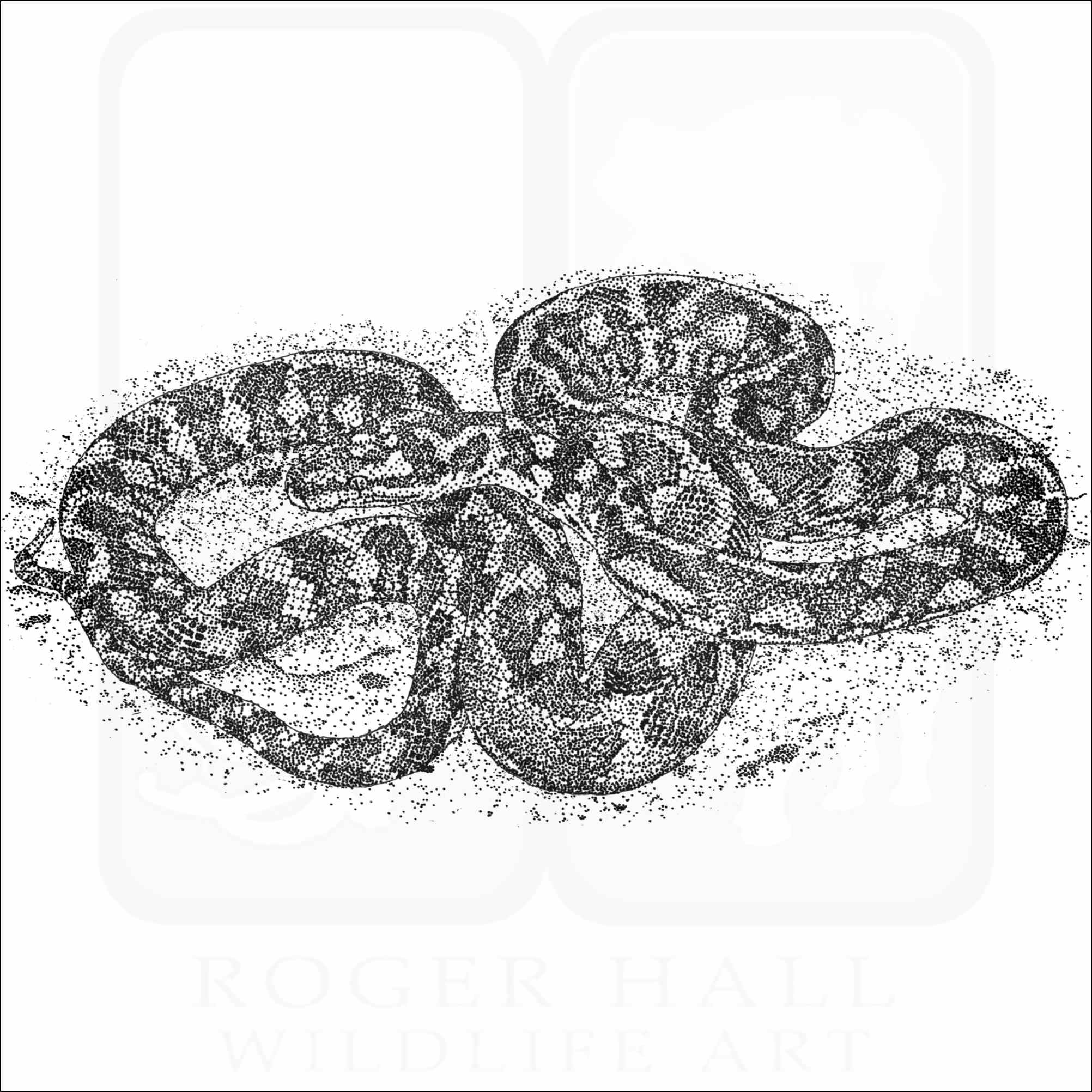 Fine art illustration of a Jungle Carpet Python (Morelia spilota cheynei.) The illustration is available in black and white or color.