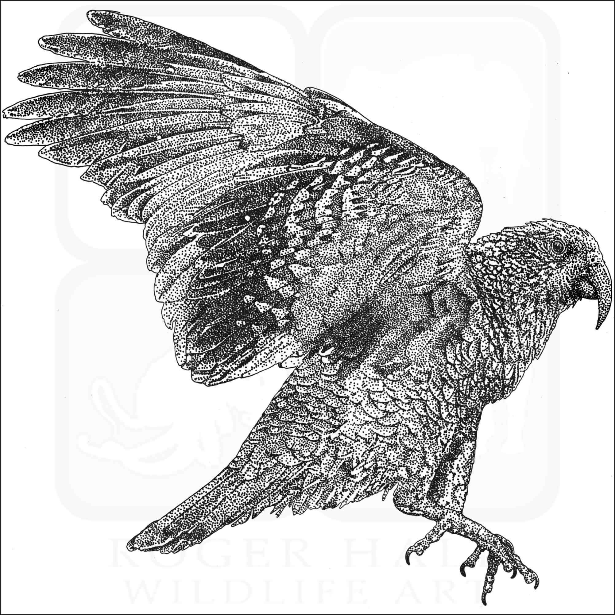 Fine art illustration of a Kea (Nestor notabilis.) The illustration is available in black and white or color.