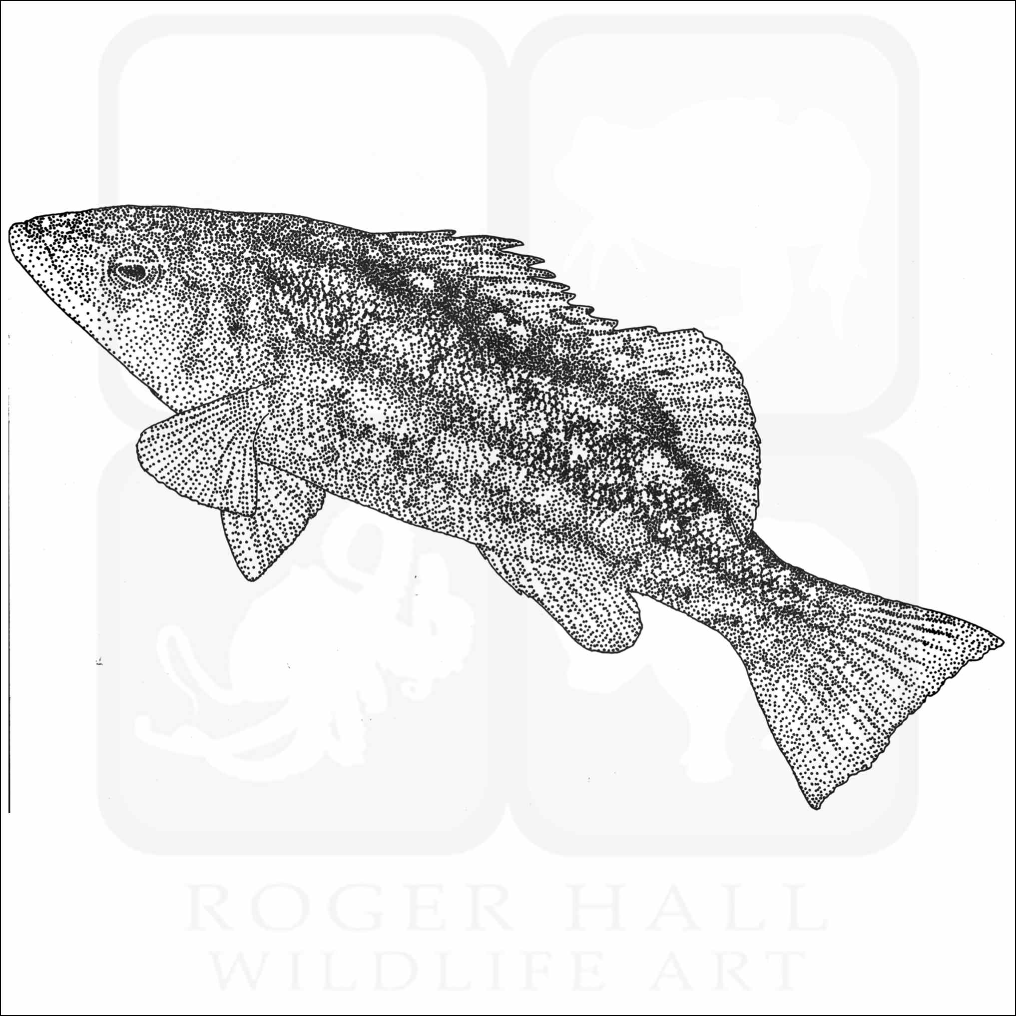 Fine art illustration of an Kelp Bass (Paralabrax clathratus.) The illustration is available in black and white or color.