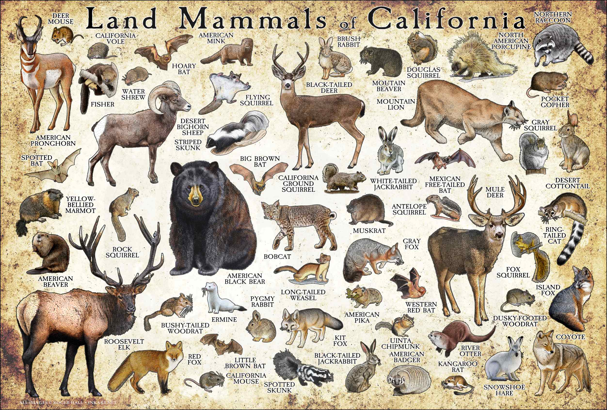 High quality fine art poster featuring all current living genus of mammals in the state of California in the United States. The poster is printed on durable museum quality matte paper.