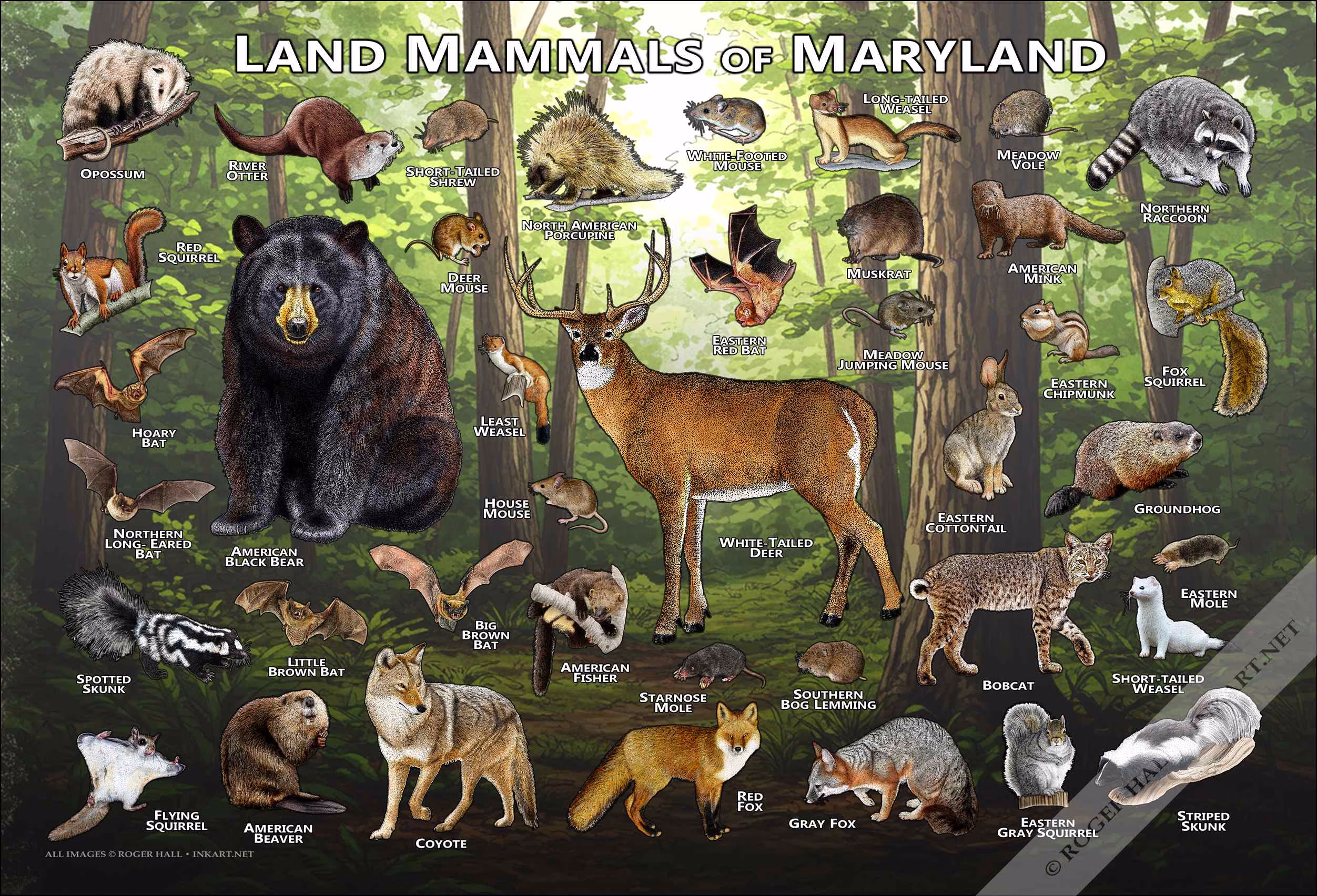 The state of Maryland is home to many amazing mammals. On this poster-print are many of them, including all genus currently living and native to the state.