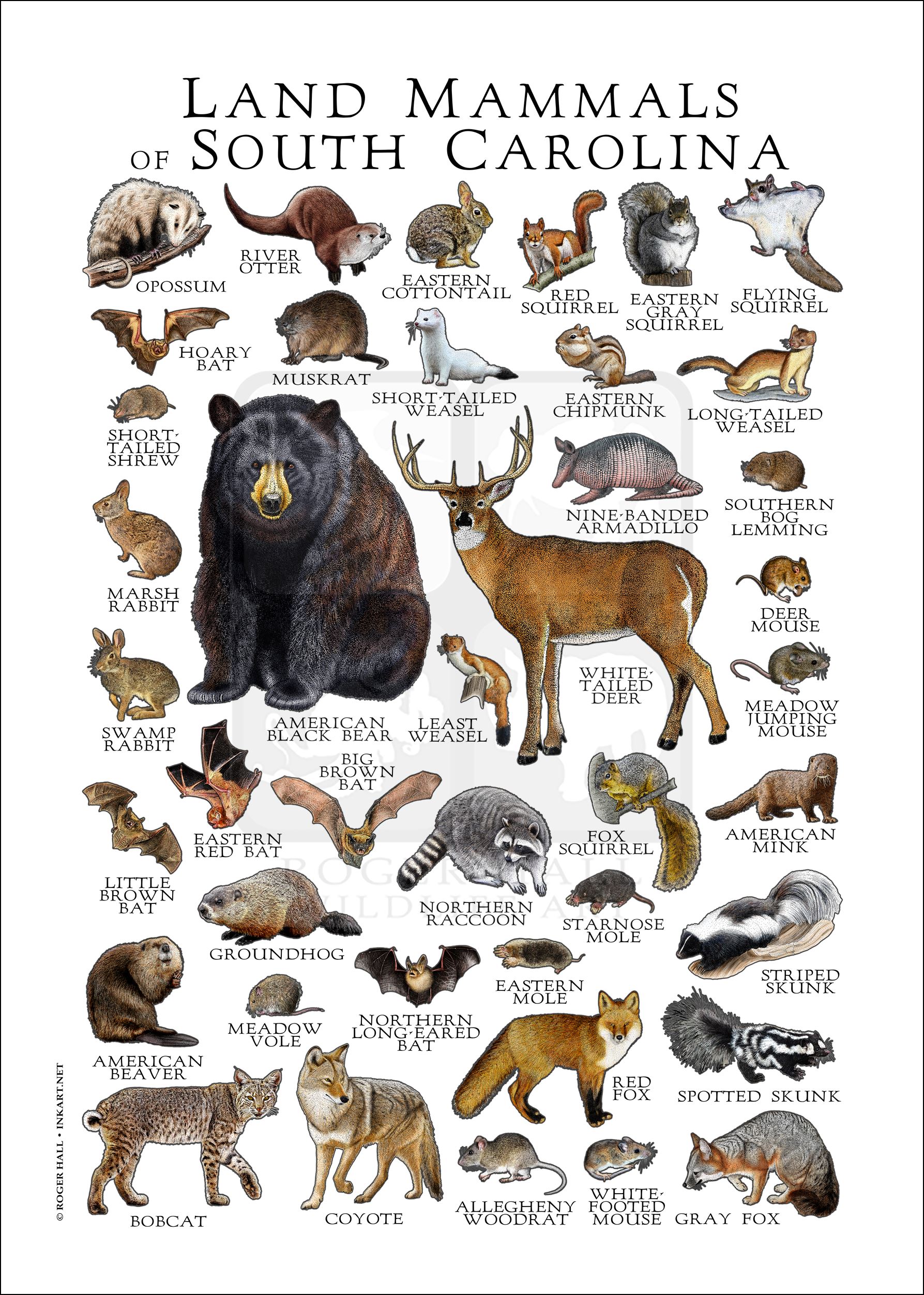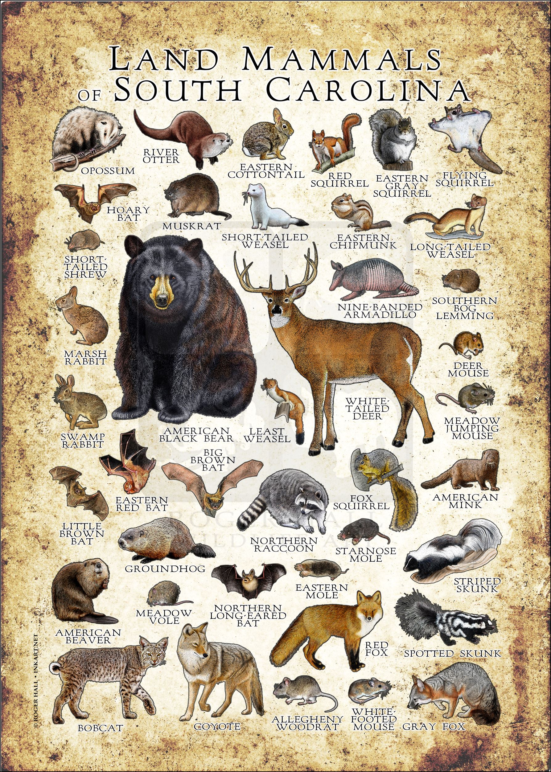 High quality fine art poster featuring all current living genus of mammals in the state of South Carolina in the United States. The poster is printed on durable museum quality matte paper.