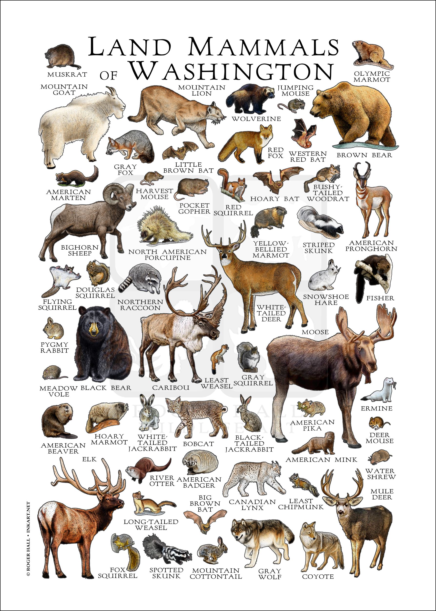 High quality fine art poster featuring all current living genus of mammals in the state of Washington in the United States. The poster is printed on durable museum quality matte paper.