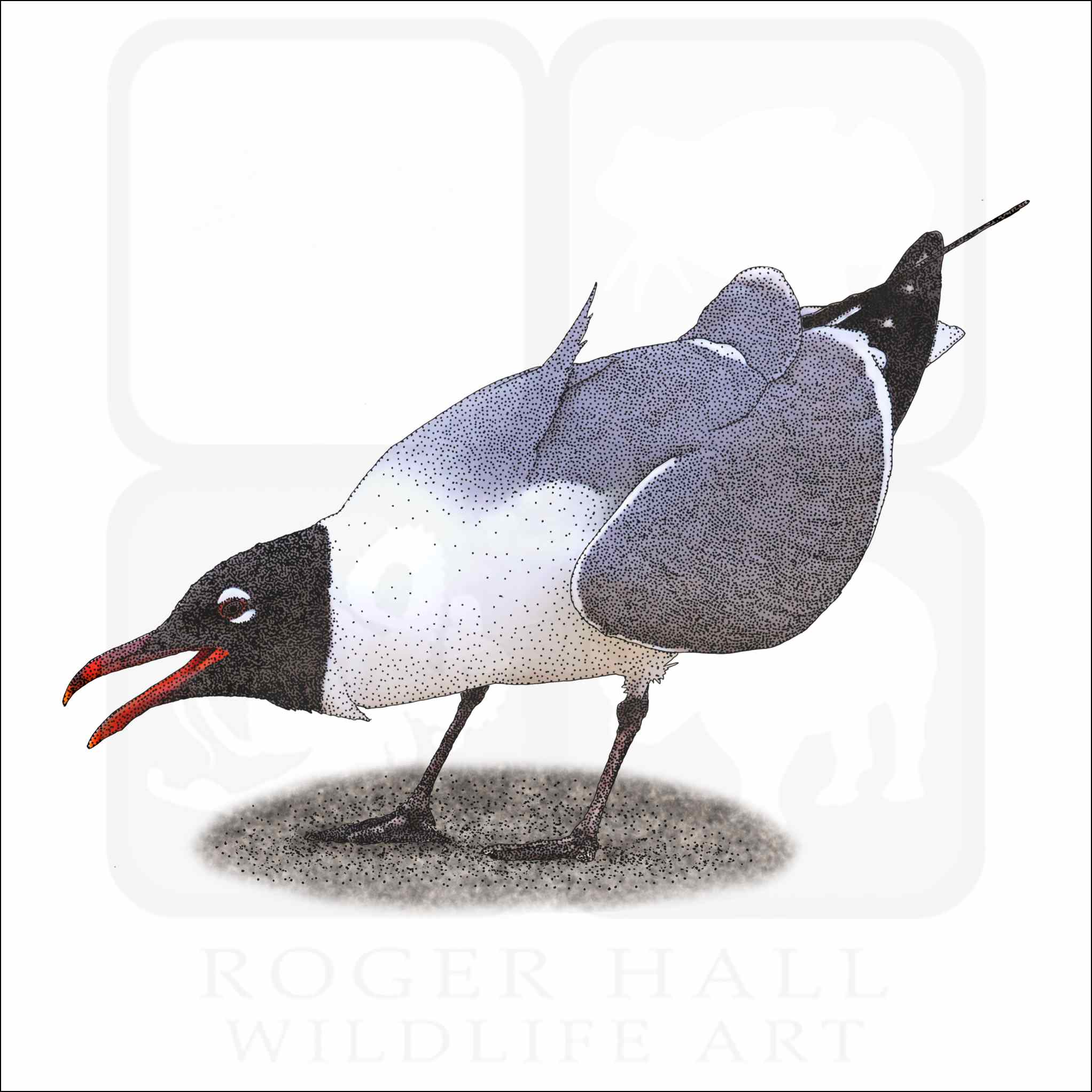 Fine art illustration of a Laughing Gull (Leucophaeus atricilla.) The illustration is available in black and white or color.