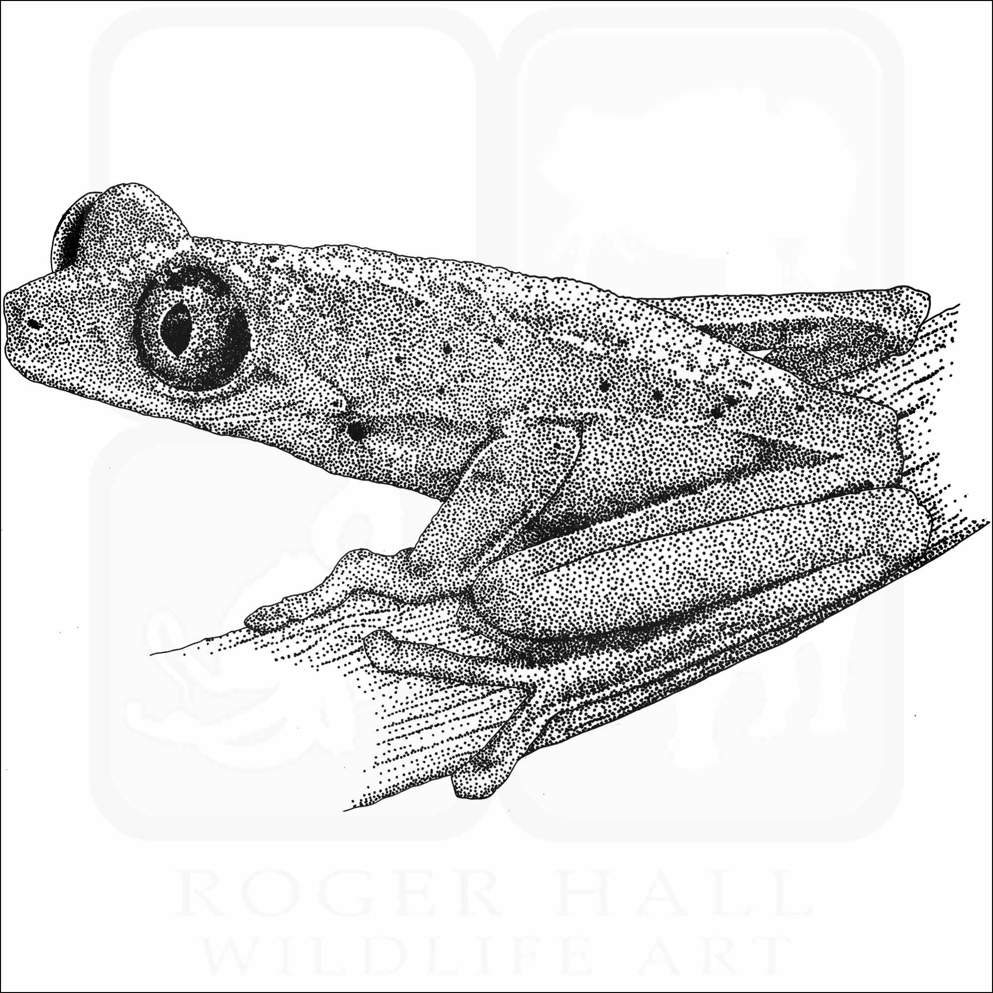 Fine art illustration of a Lemur Leaf Frog (Hylomantis lemur.) The illustration is available in black and white or color.
