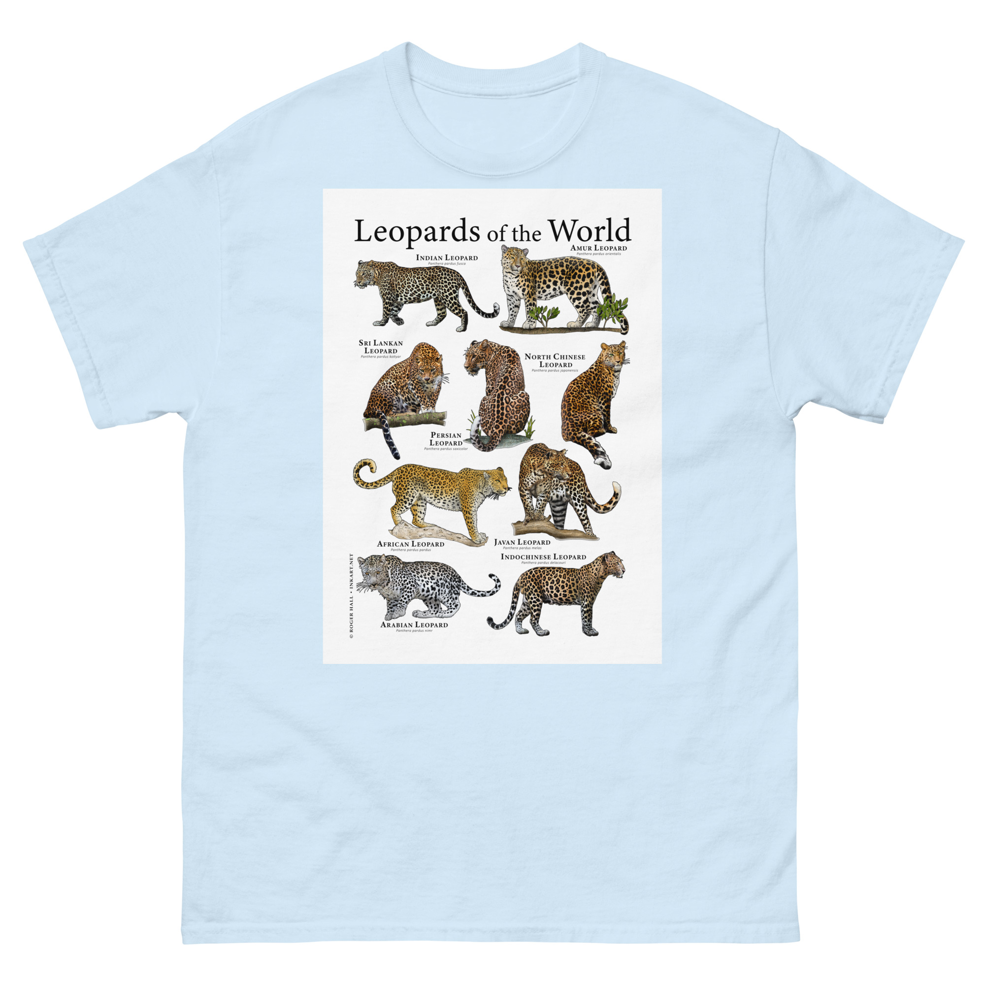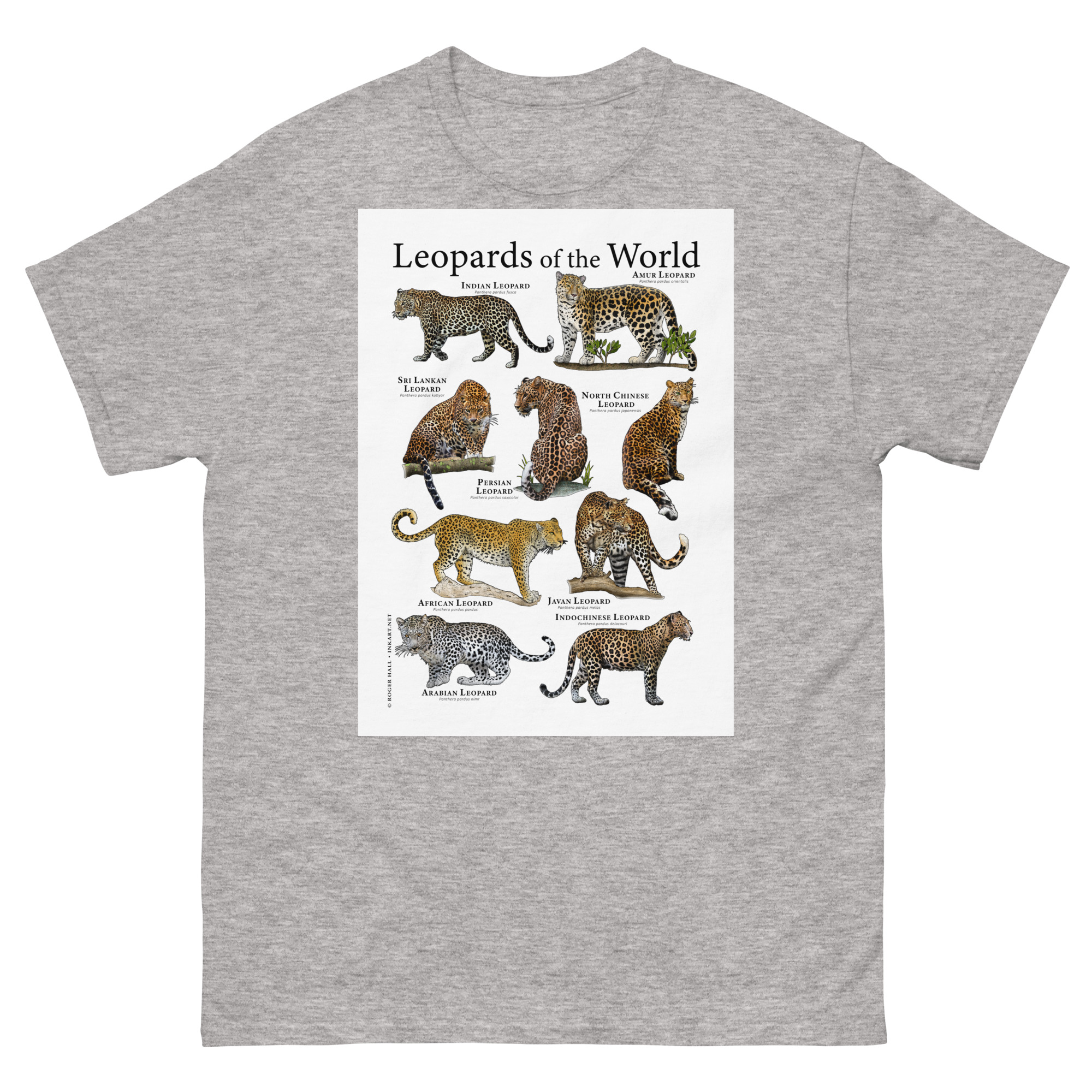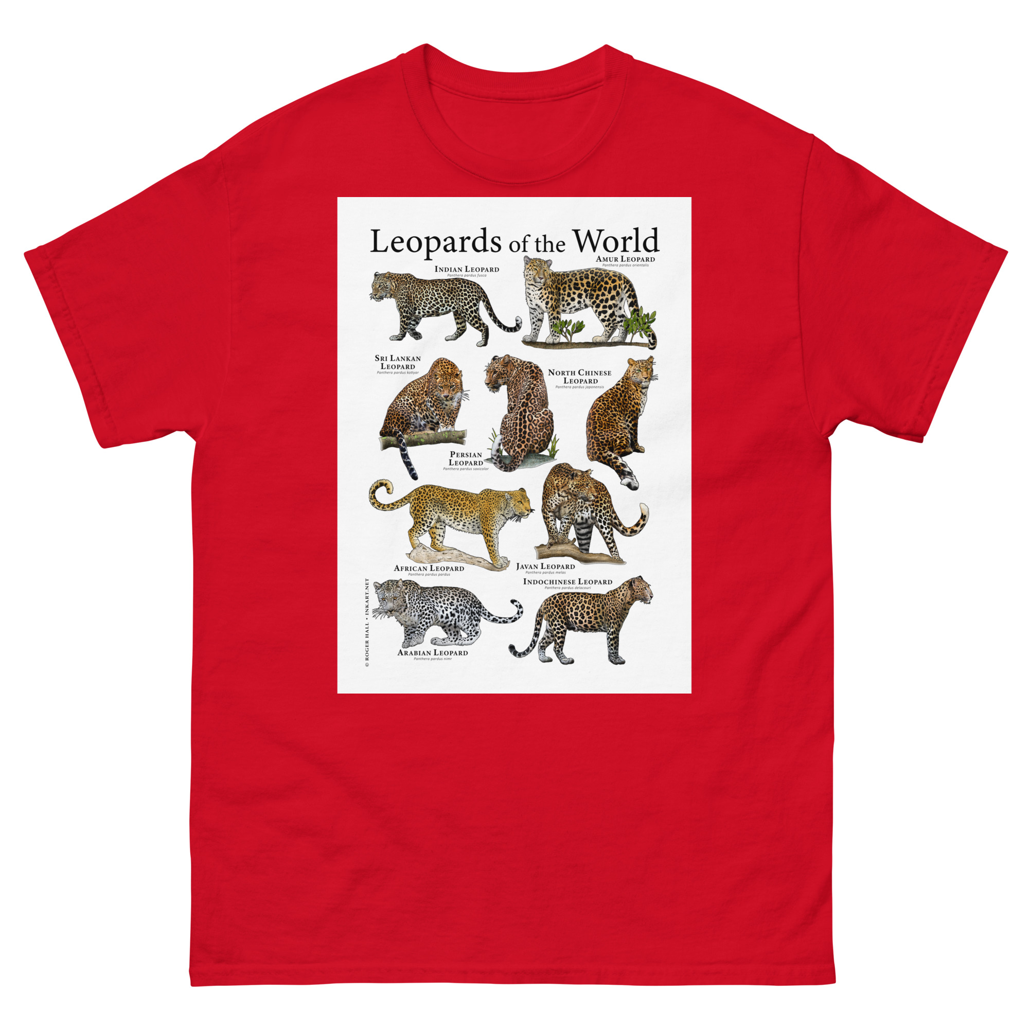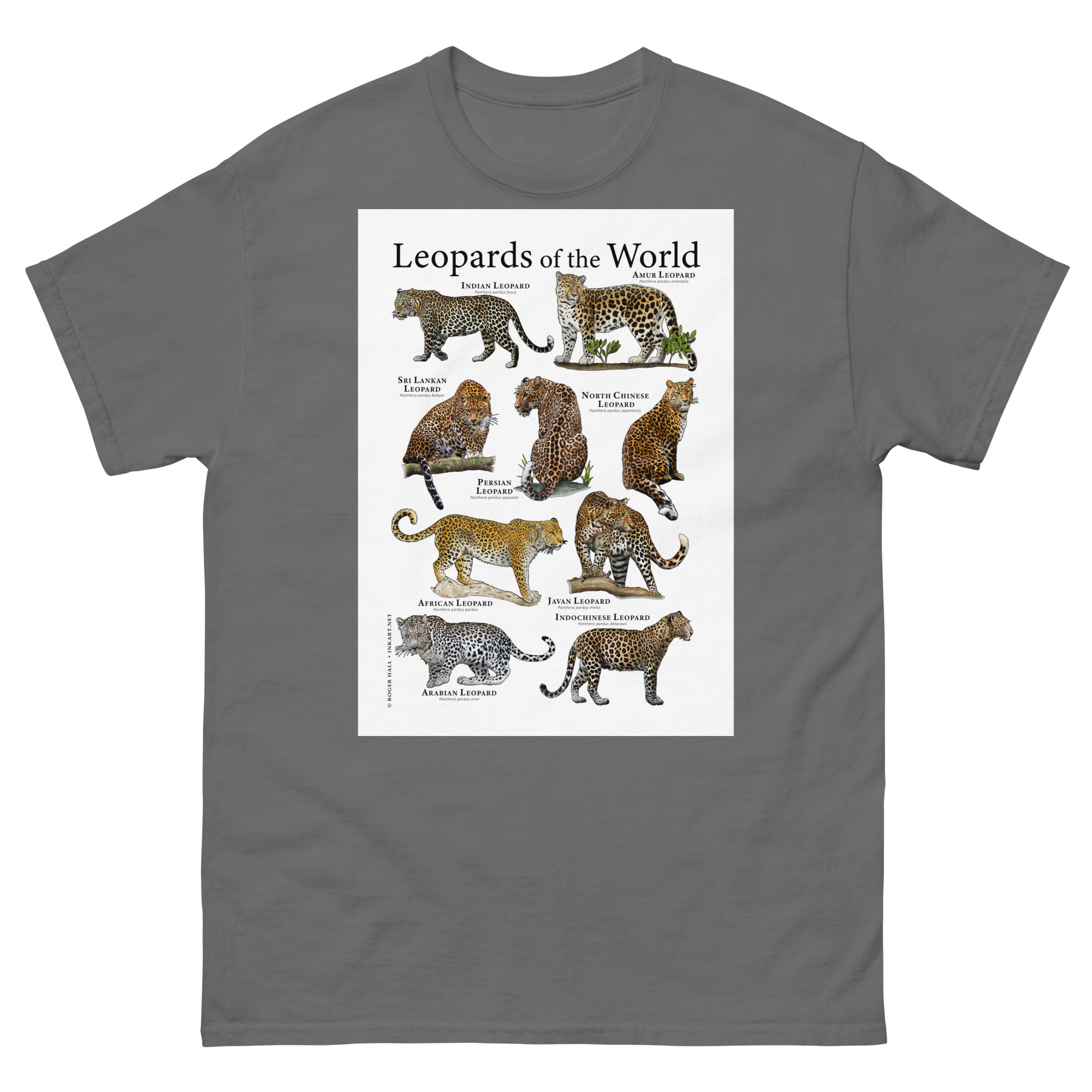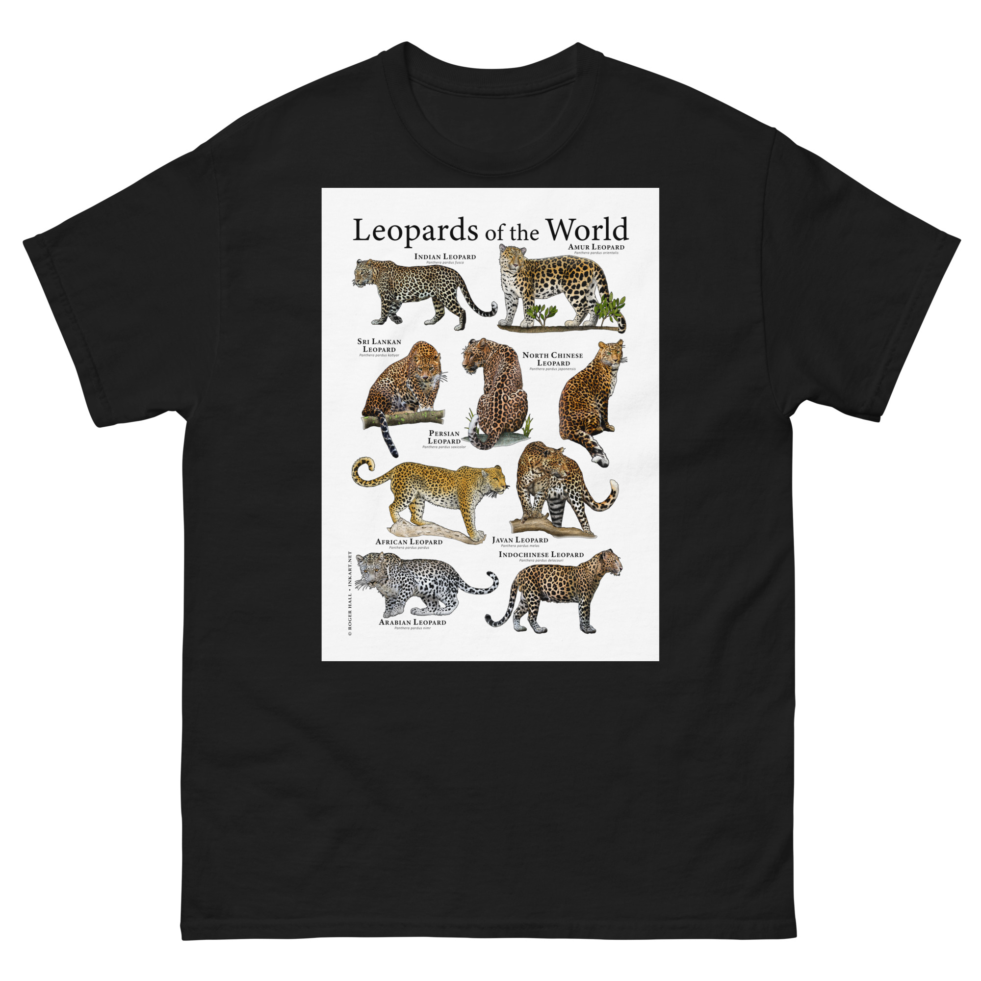 A colorful collage of scientifically accurate illustration of all extant species of Panthera Pardus. The layout features nine different types of leopard, including some of the world’s most endangered species printed on a high-quality 100% men’s cotton t-shirt.