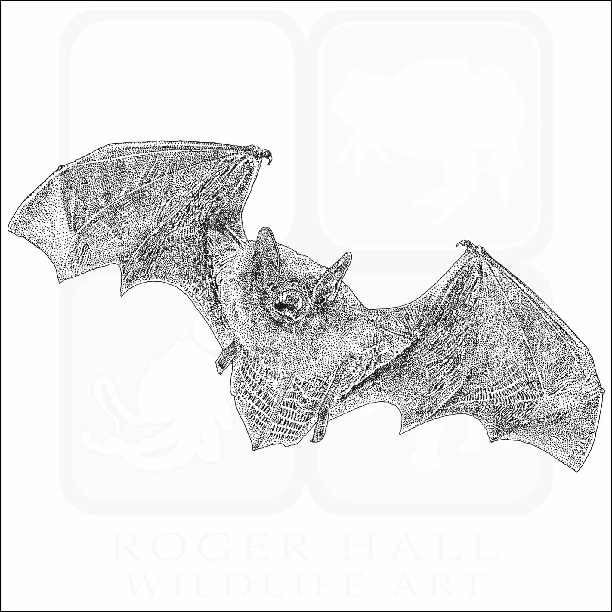 Fine art illustration of a Little Brown Bat (Myotis lucifugus.) The illustration is available in black and white or color.