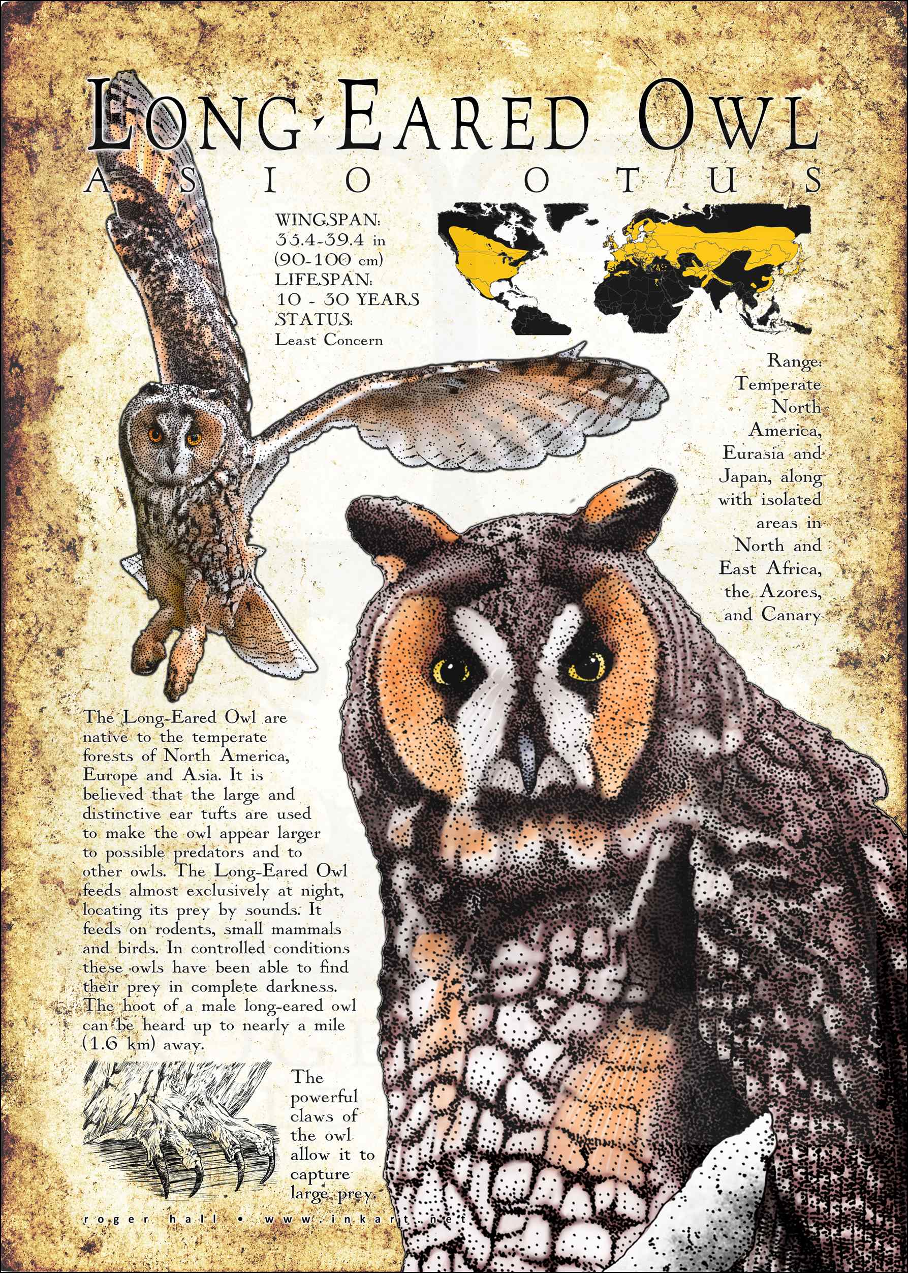 This poster features an informational graphic of the Long-Eared Owl. It includes a map of the owl’s range, along with three illustrations and a small paragraph with information about the owl.