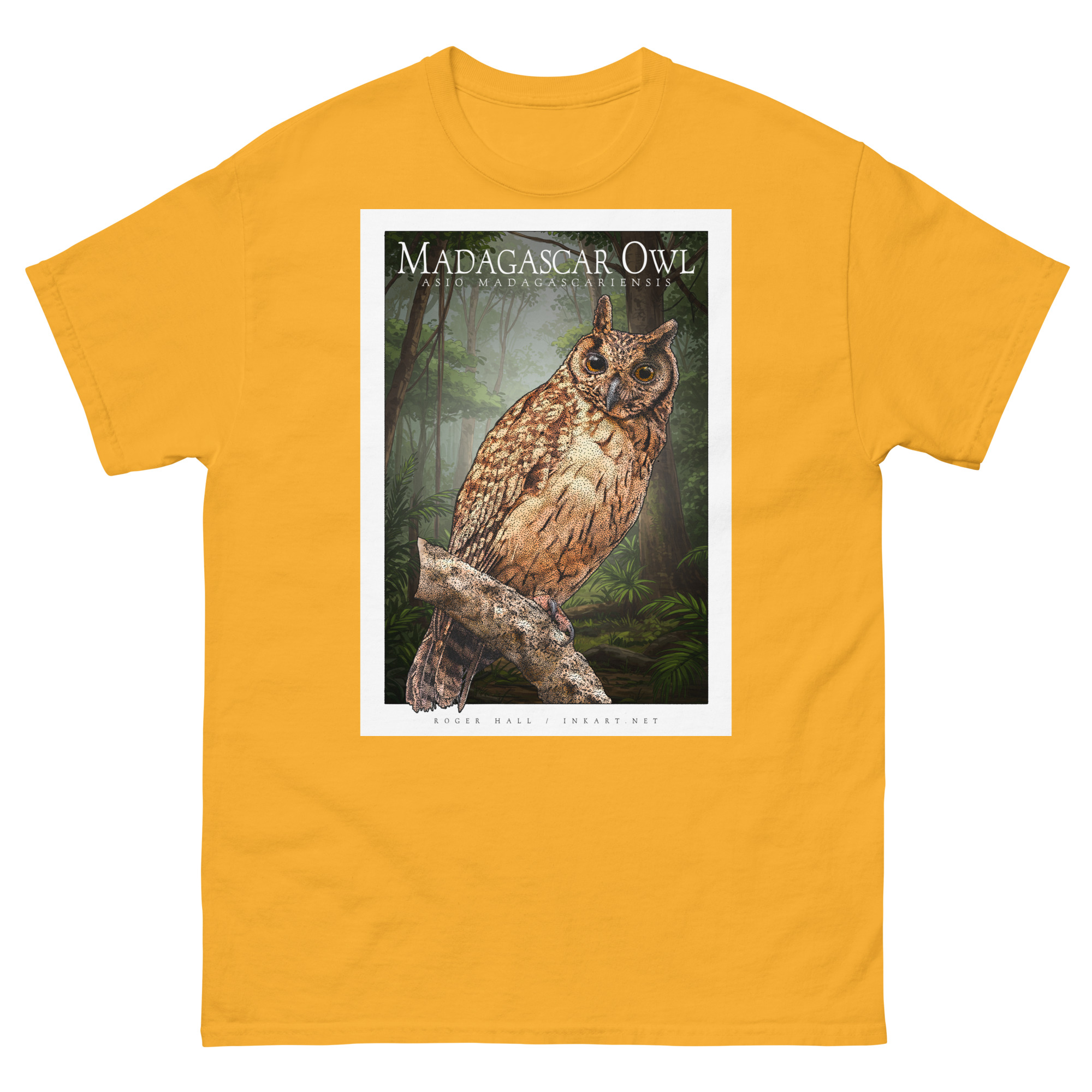 Scientifically accurate drawing of a Madagascar Owl (Asio madagascariensis.) The illustration of a printed on a high-quality 100% unisex cotton t-shirt.