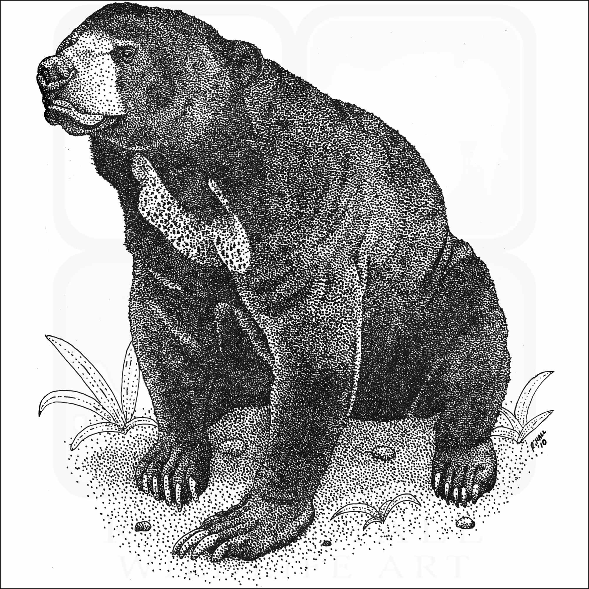 Fine art illustration of a Malayan Sun Bear (Helarctos malayanus malayanus.) The illustration is available in black and white or color.