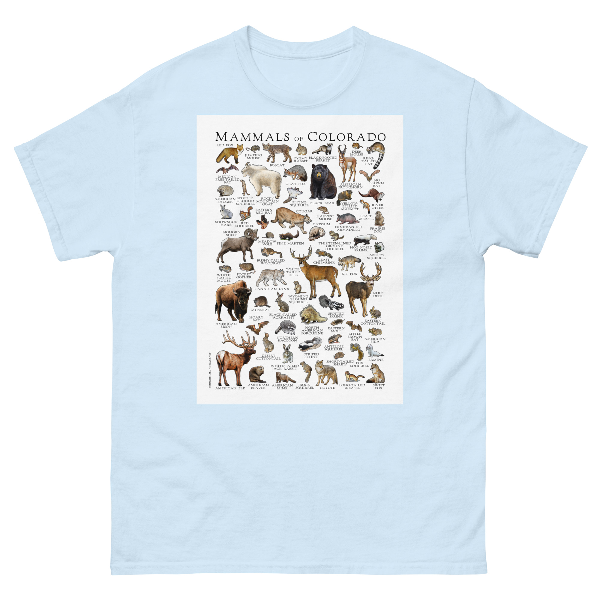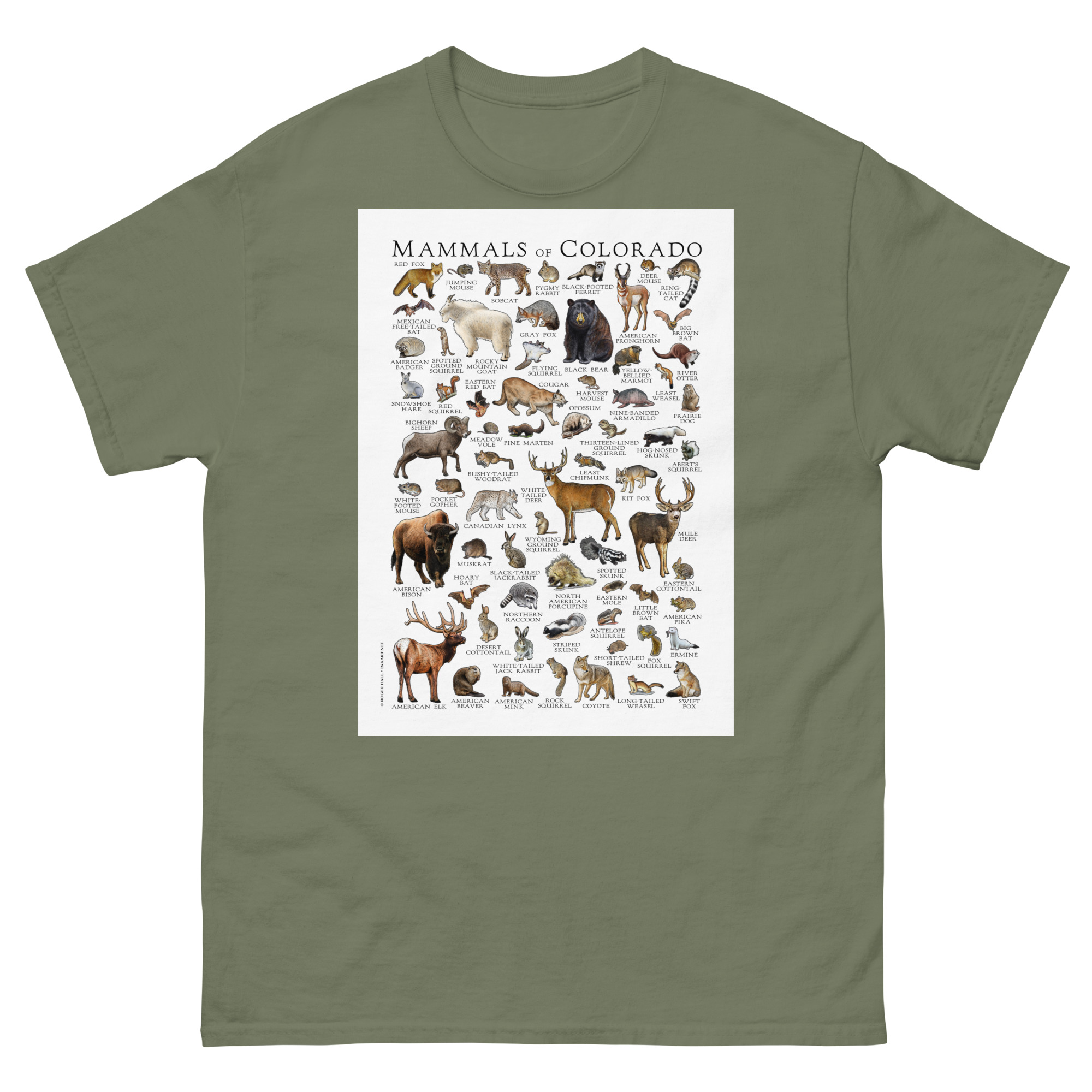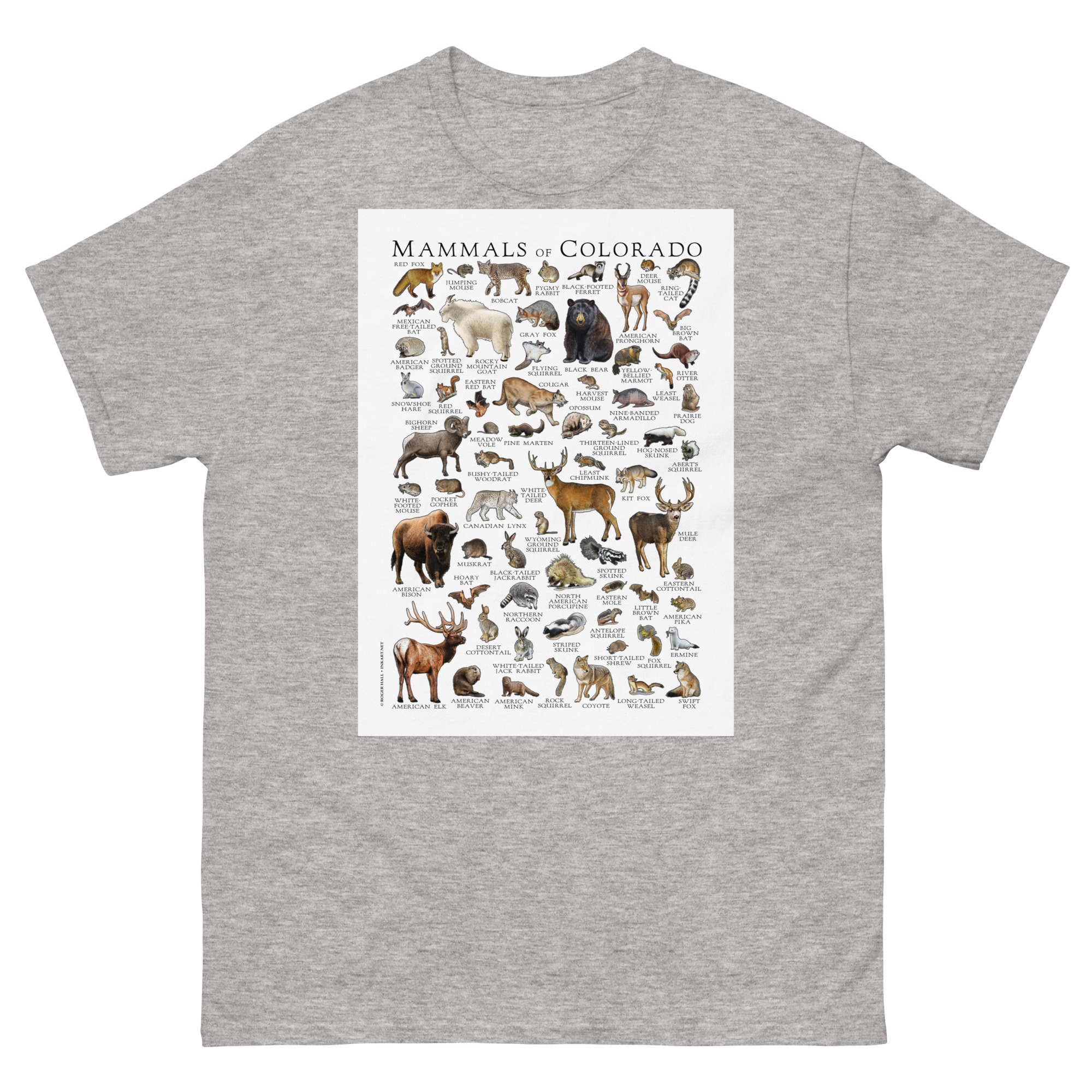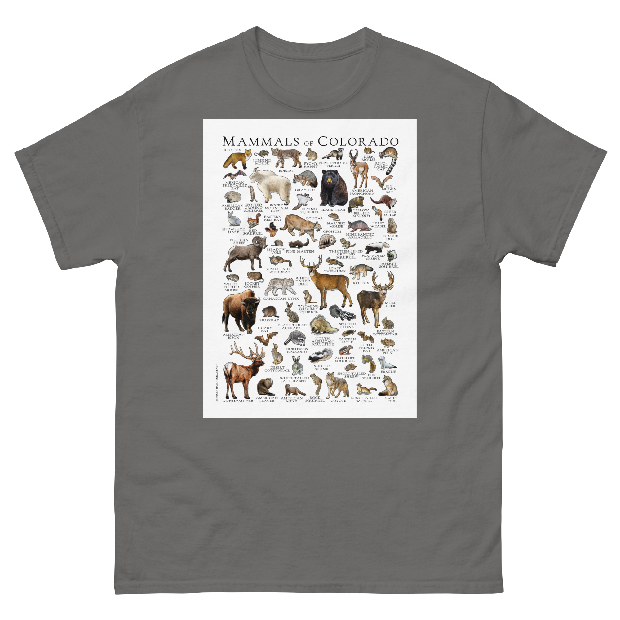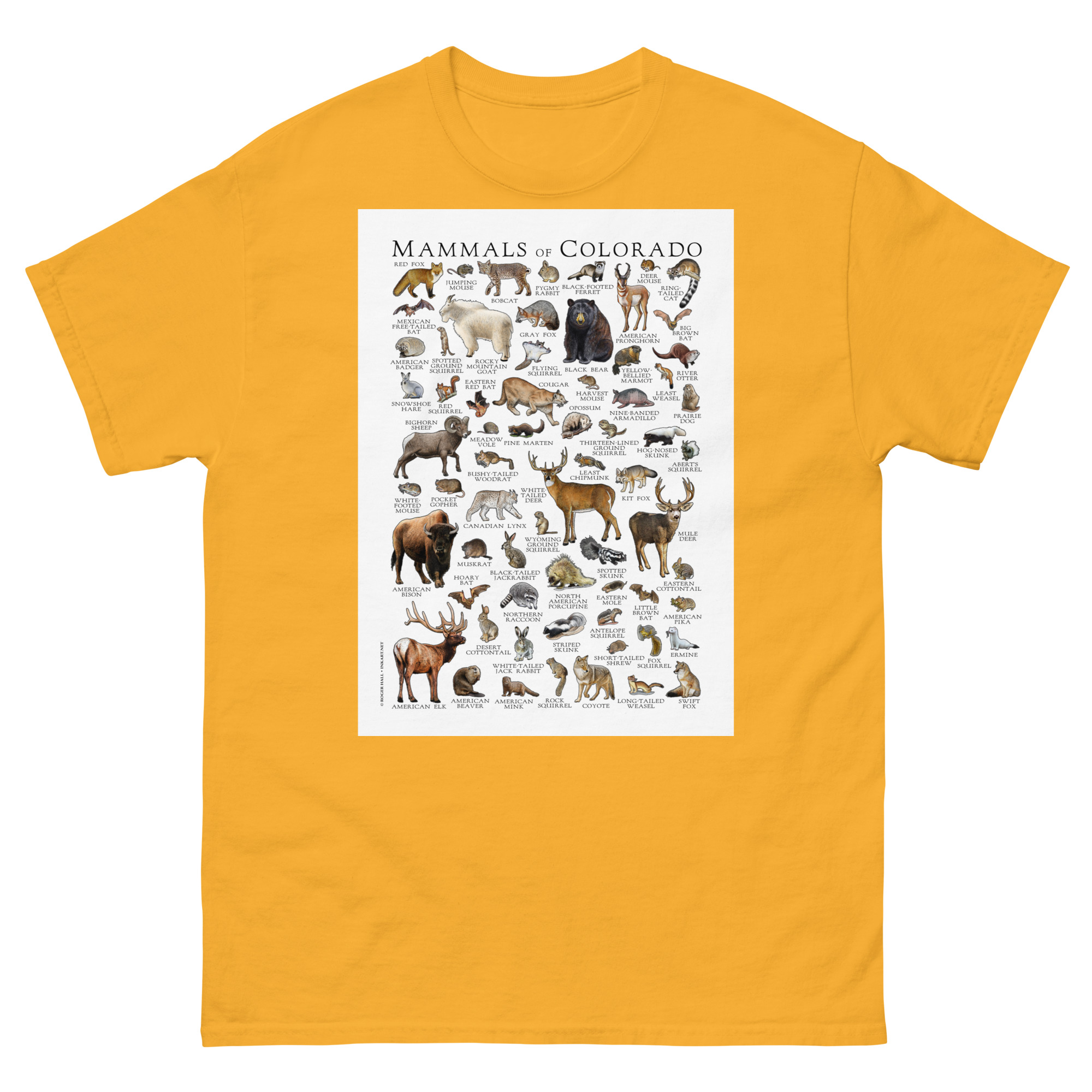 The state of Colorado is home to many amazing mammals. On this poster-print are many of them, including all genus currently living and native to the state printed on a high-quality 100% men’s cotton t-shirt.