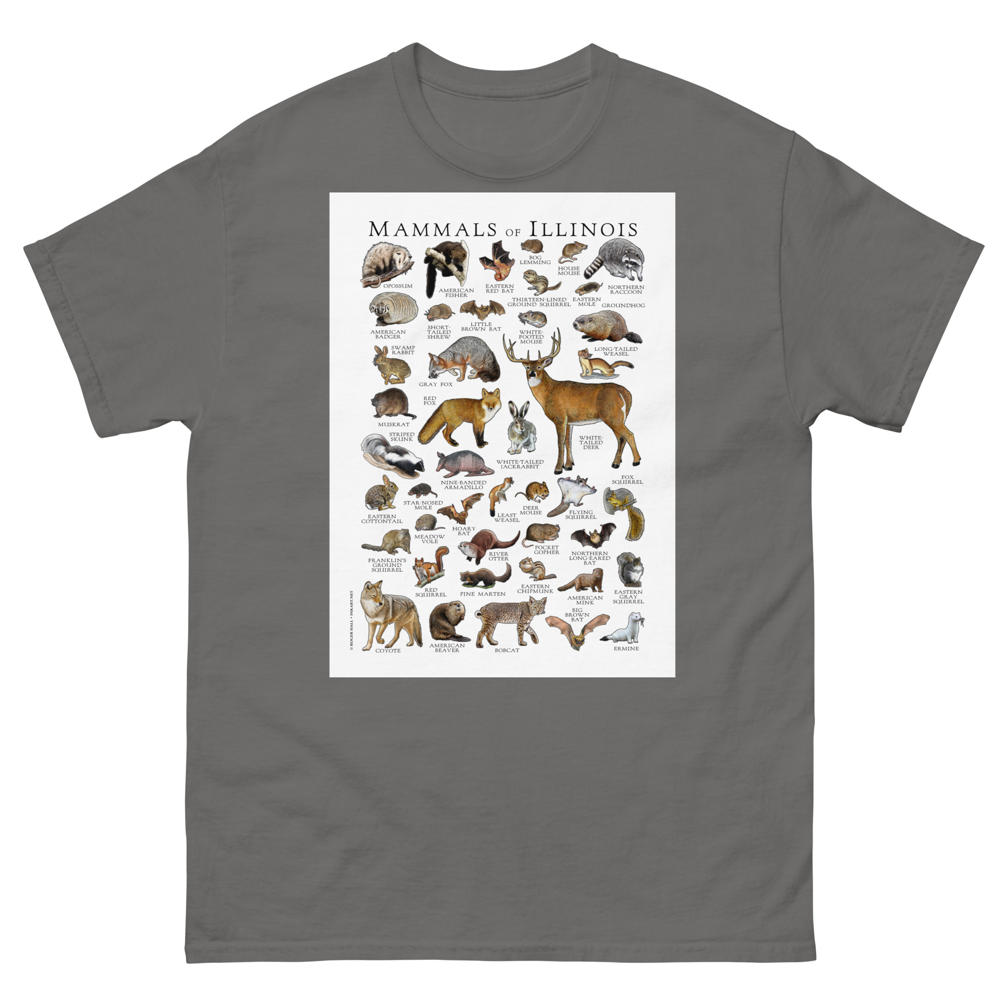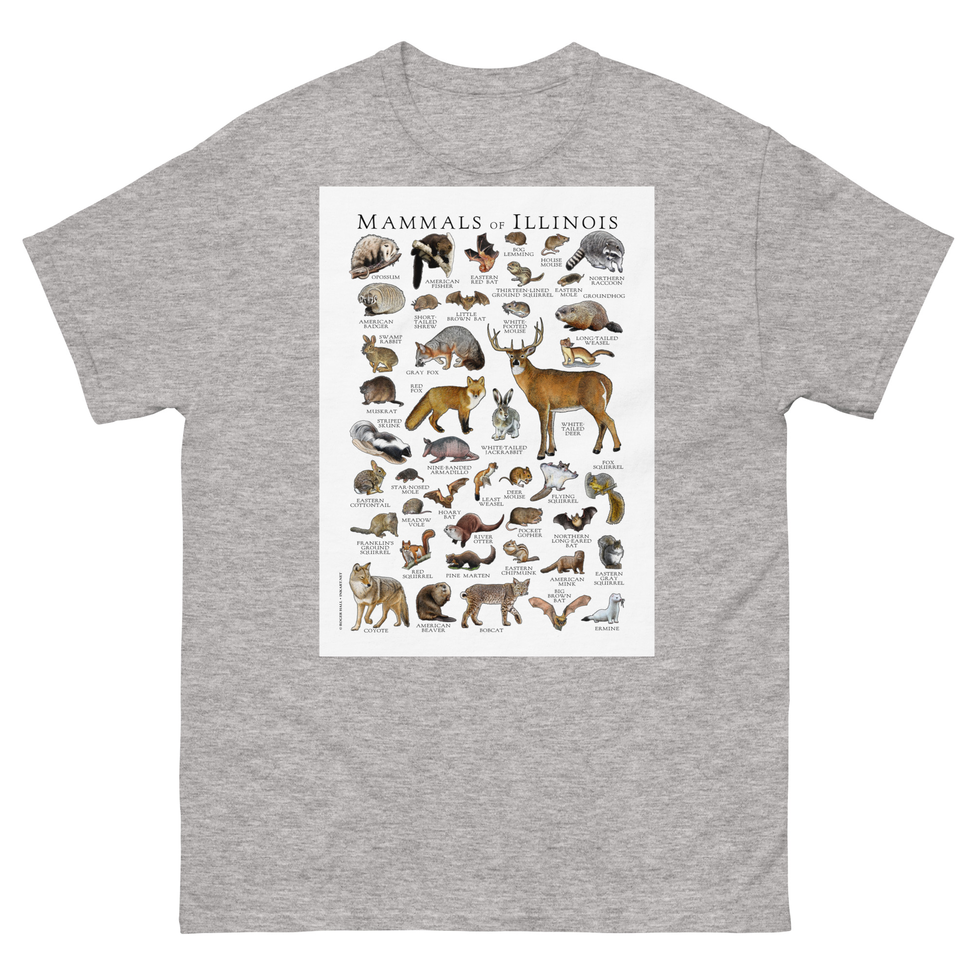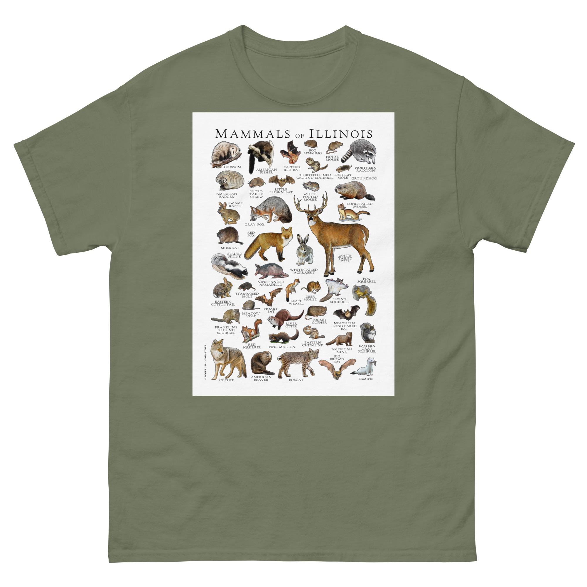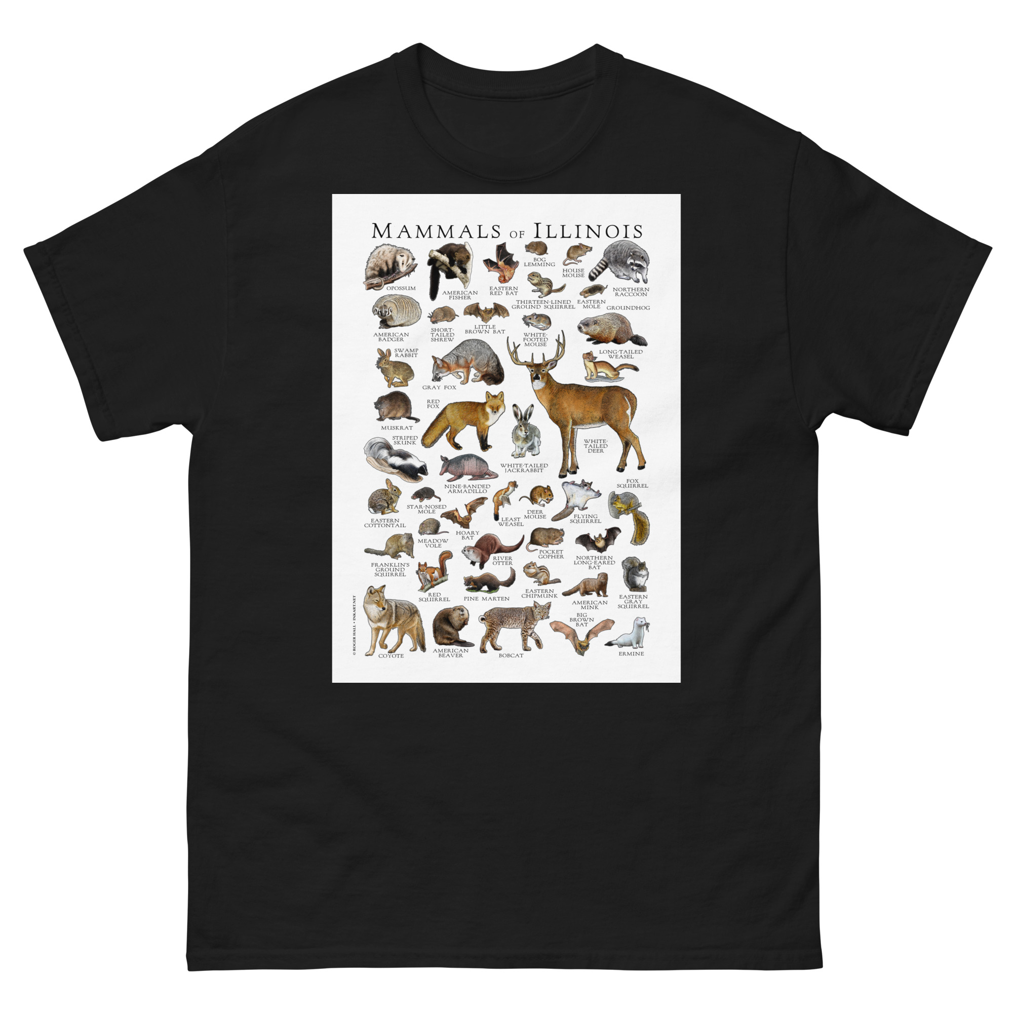 The state of Illinois is home to many amazing mammals. On this layout are many of them, including all genus currently living and native to the state printed on a high-quality 100% men’s cotton t-shirt.