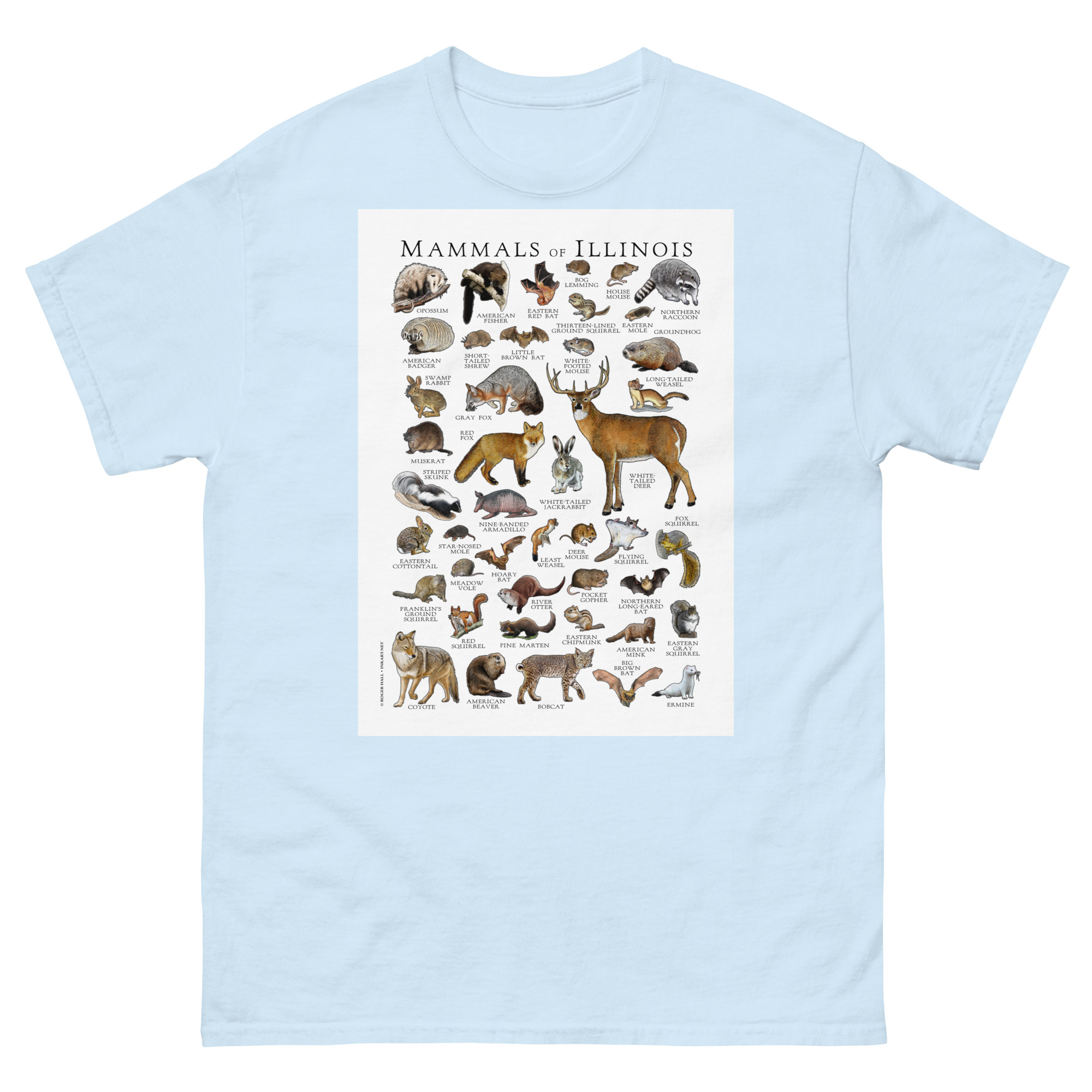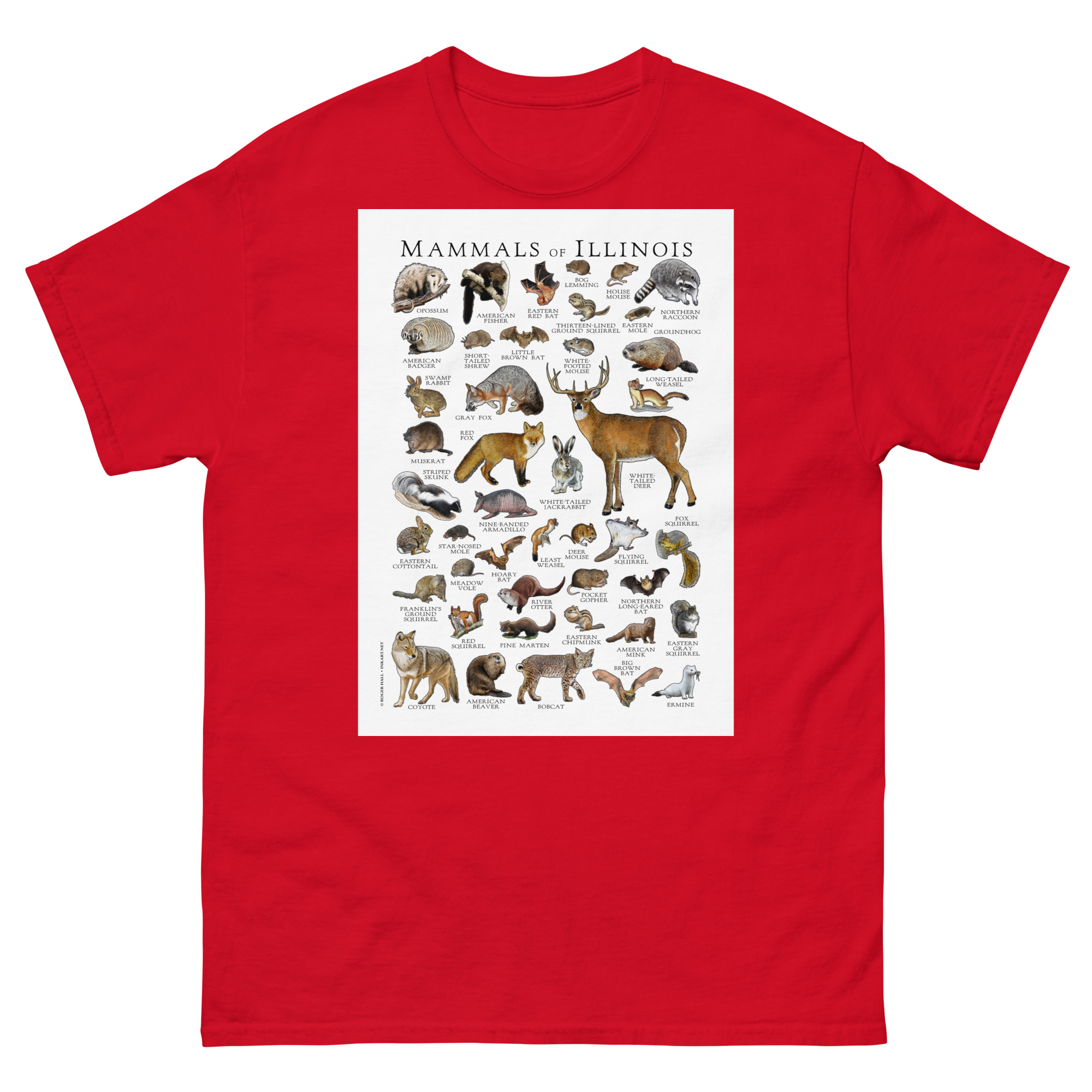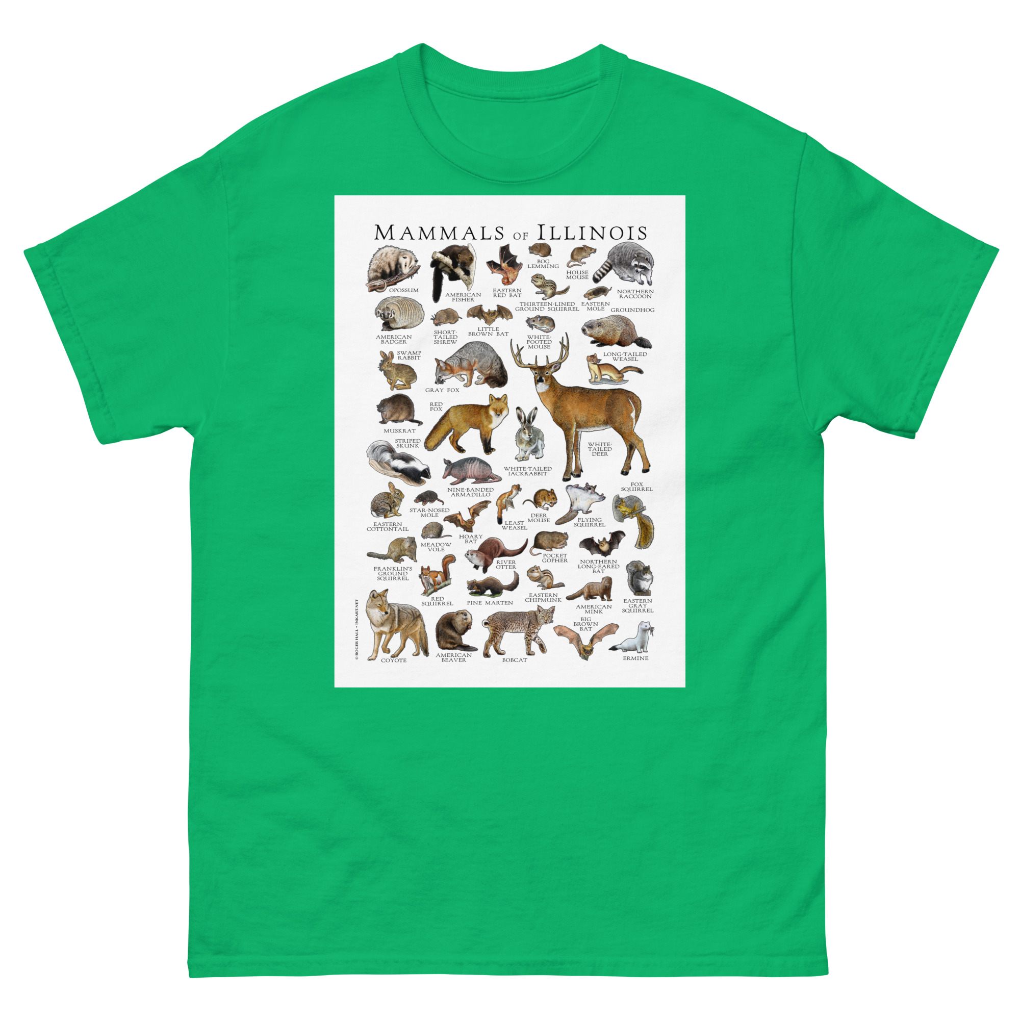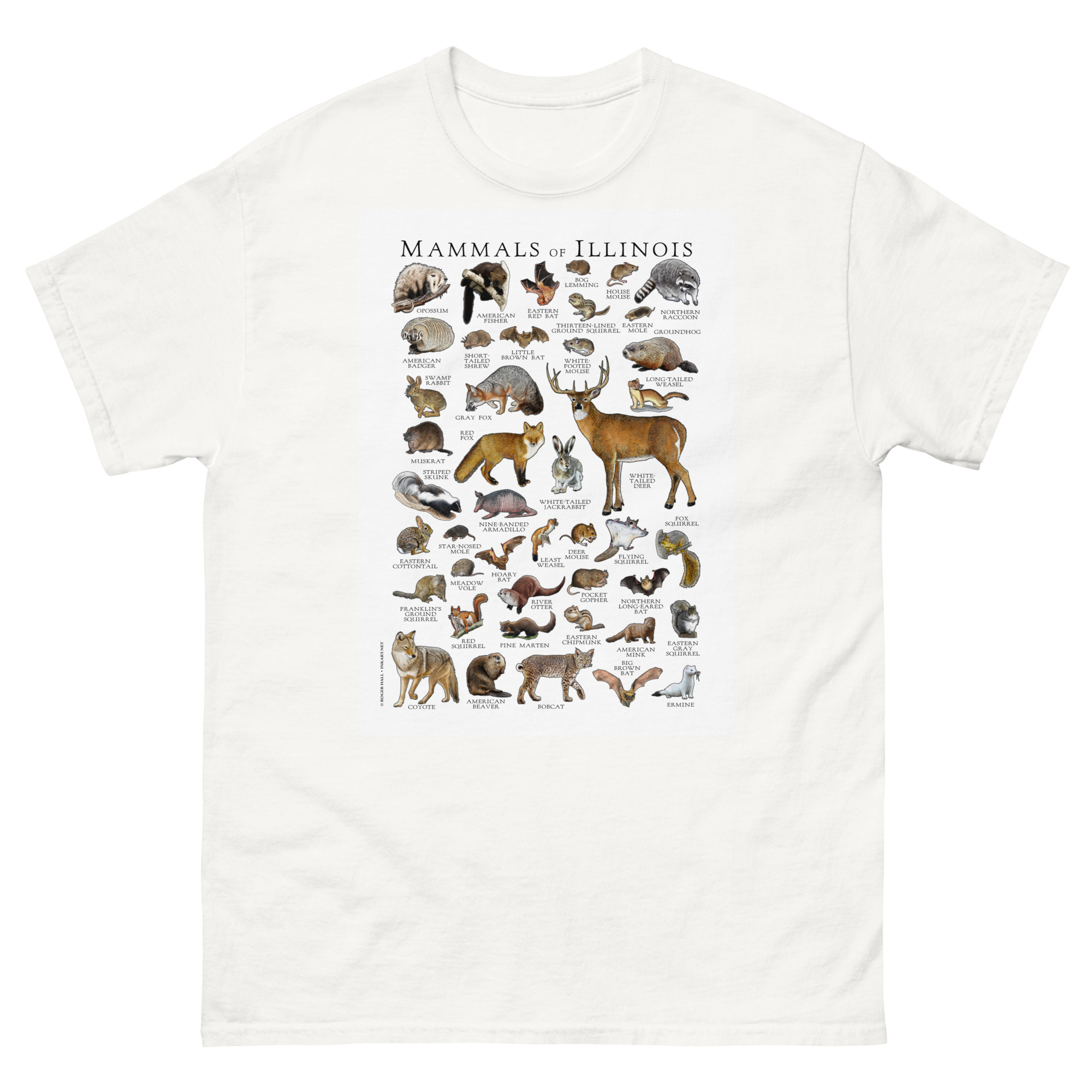 The state of Illinois is home to many amazing mammals. On this layout are many of them, including all genus currently living and native to the state printed on a high-quality 100% men’s cotton t-shirt.